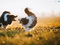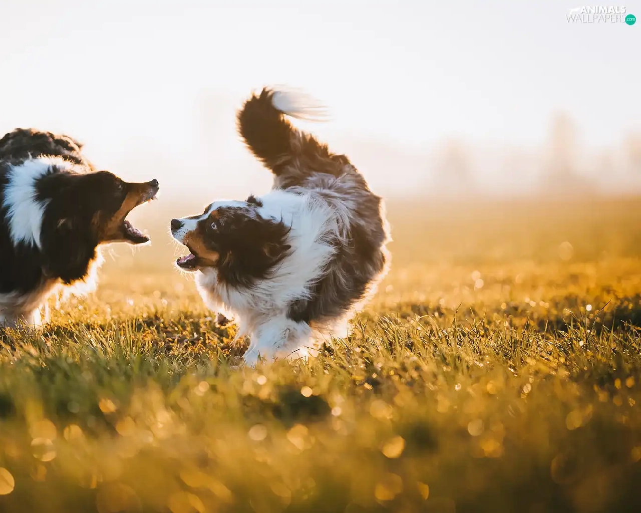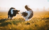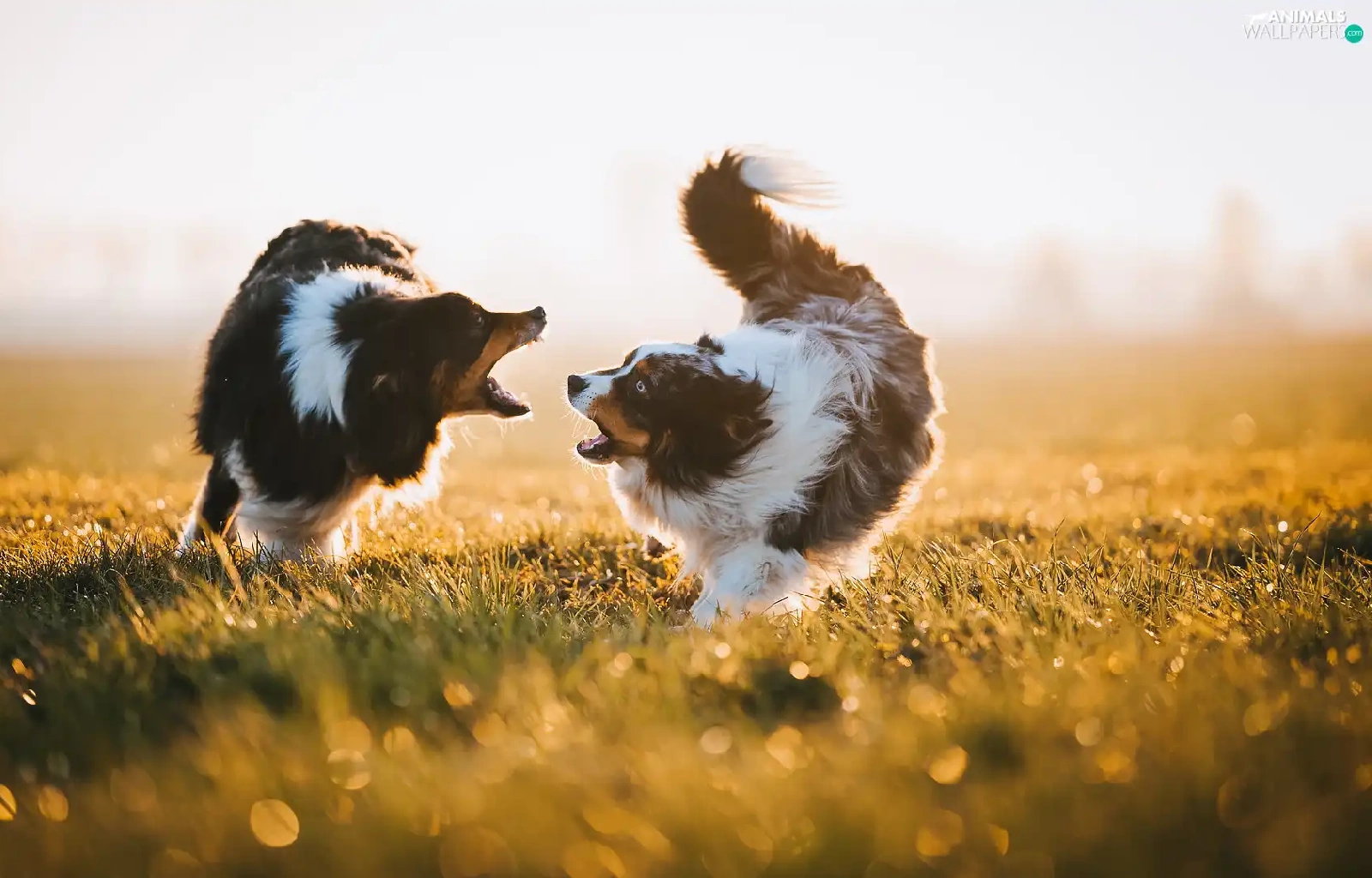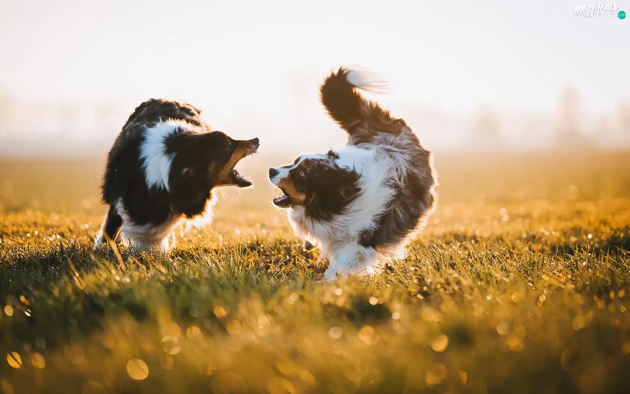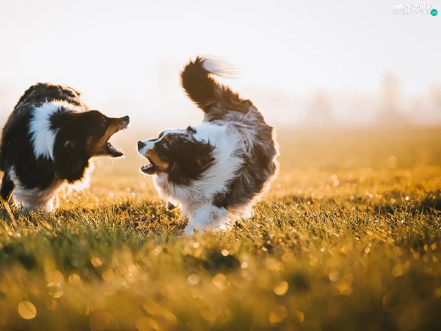 Two cars, Australian Shepherds, play, Dogs