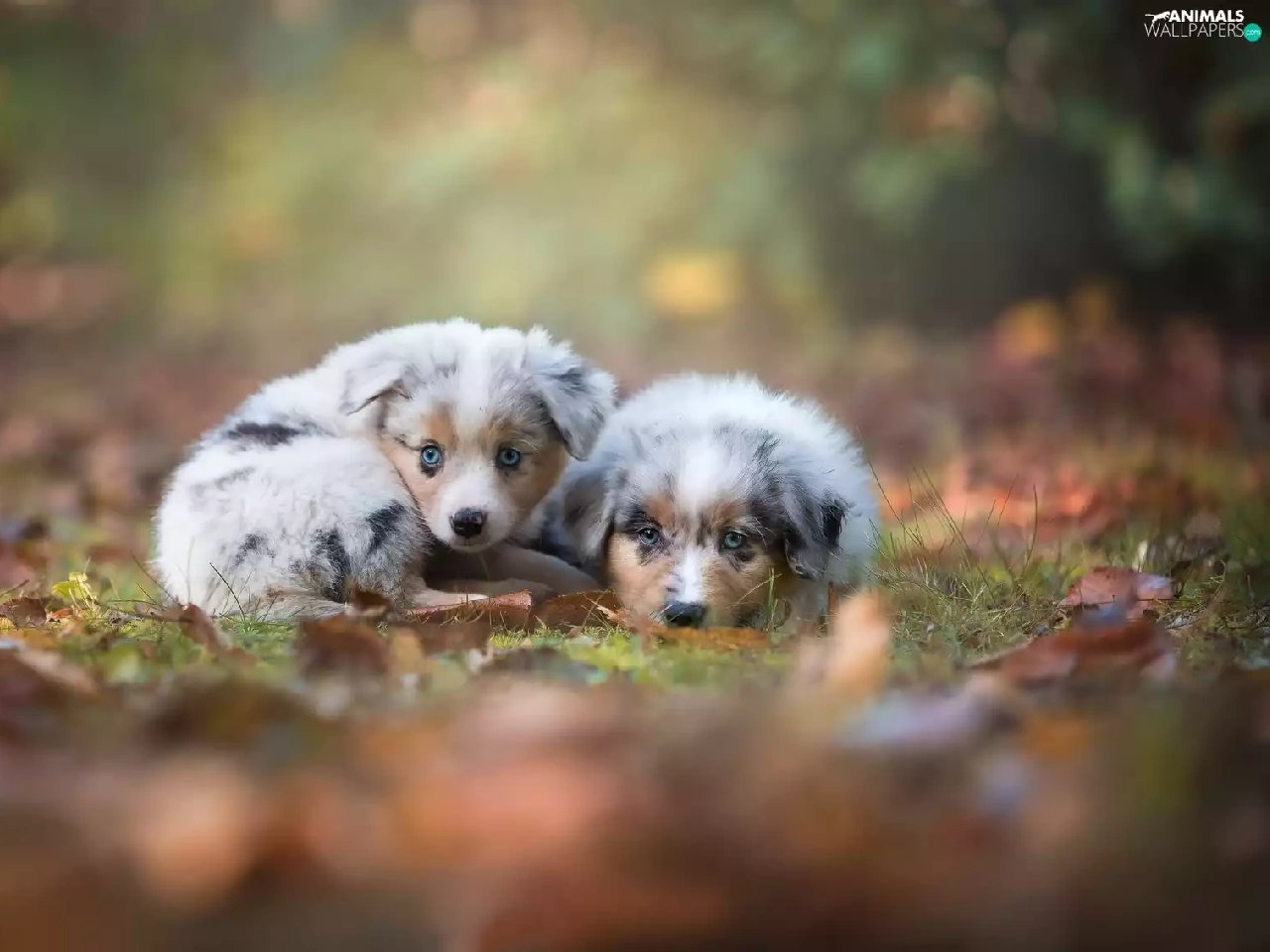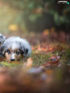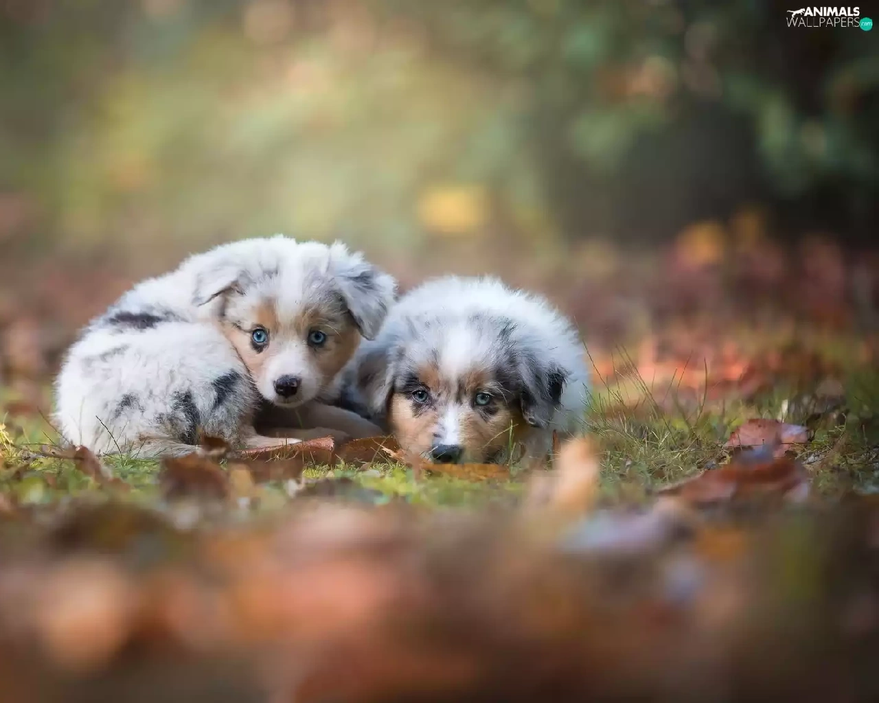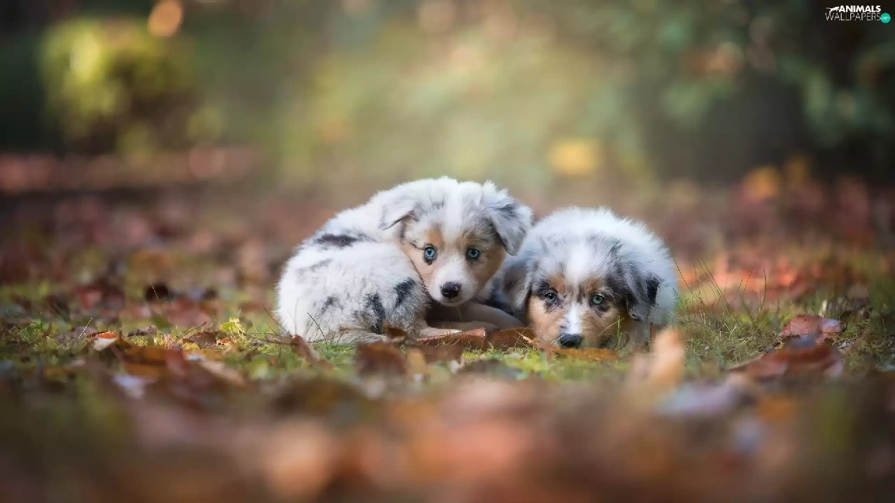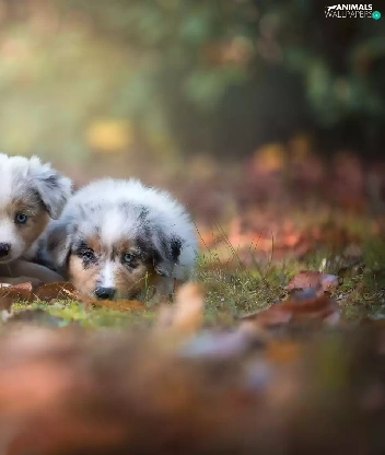 Australian Shepherds, Two cars, puppies