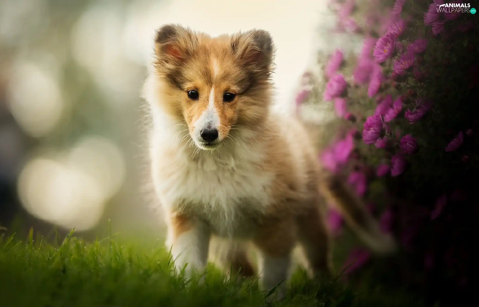 shetland Sheepdog, dog, Flowers, grass, muzzle, Puppy