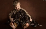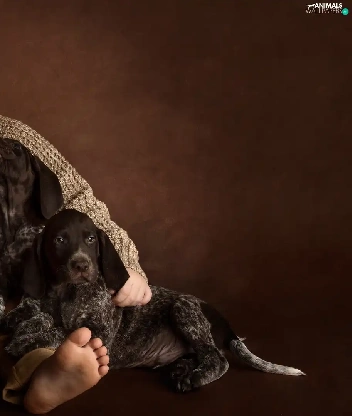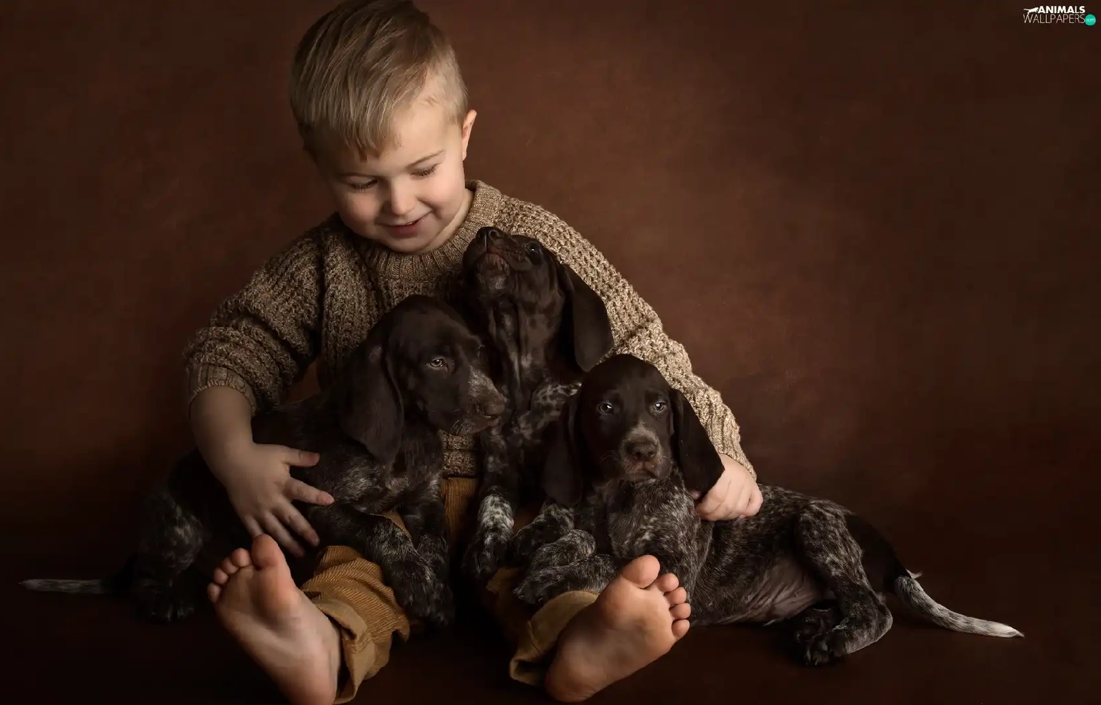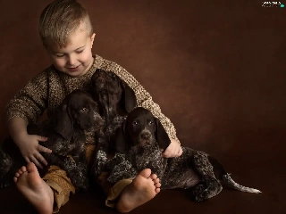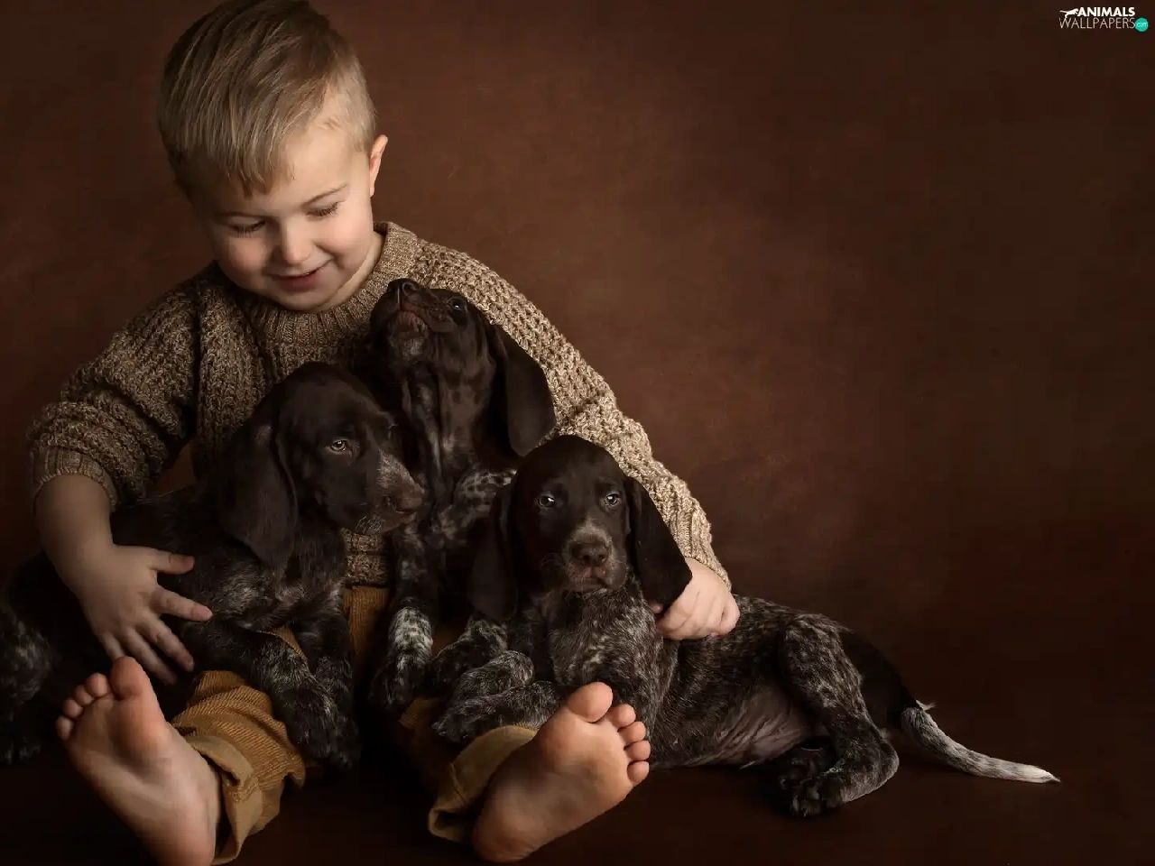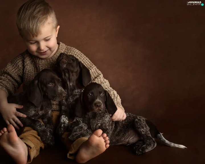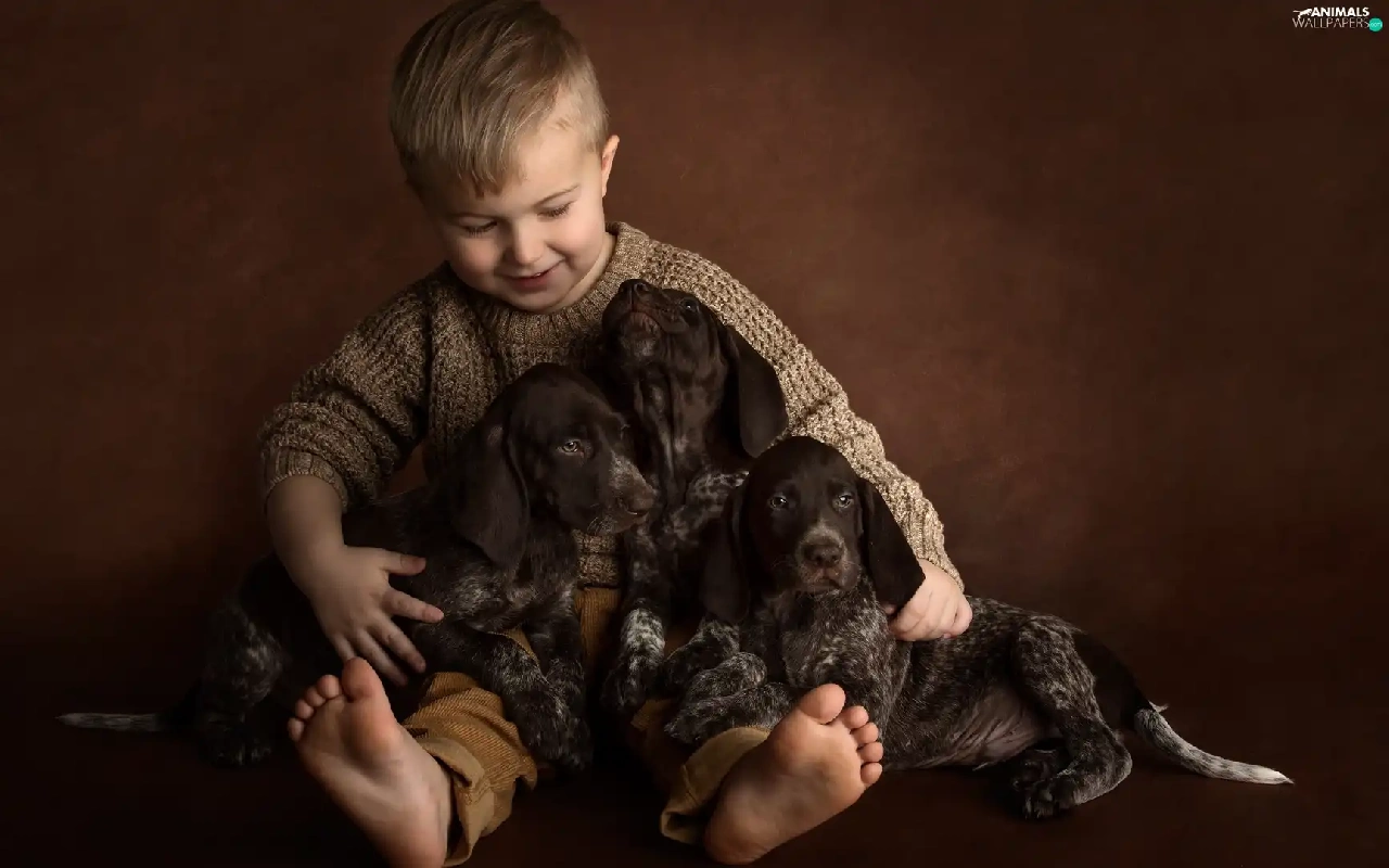 boy, puppies, German Shorthair Pointers, Dogs