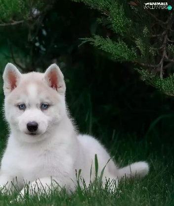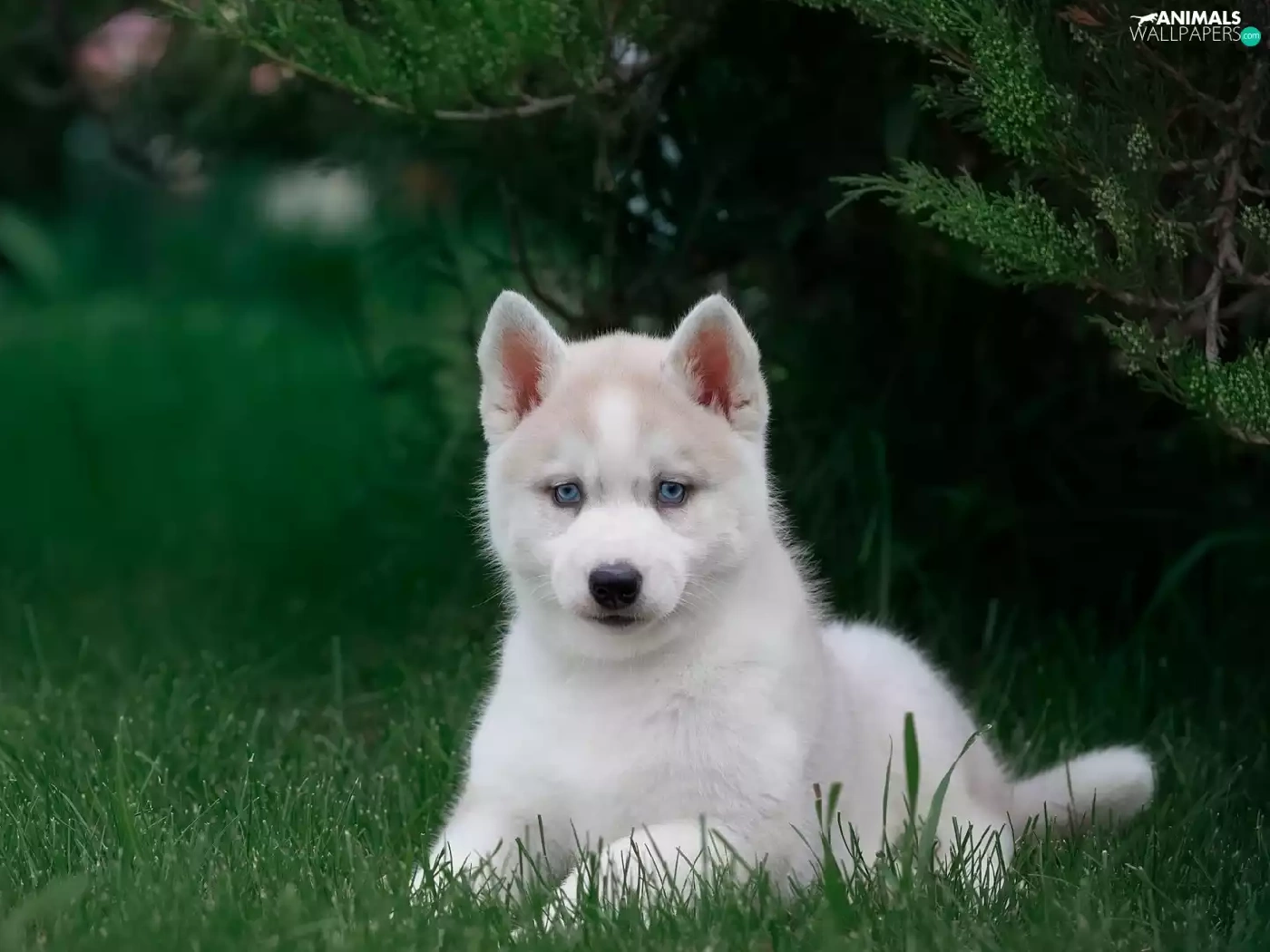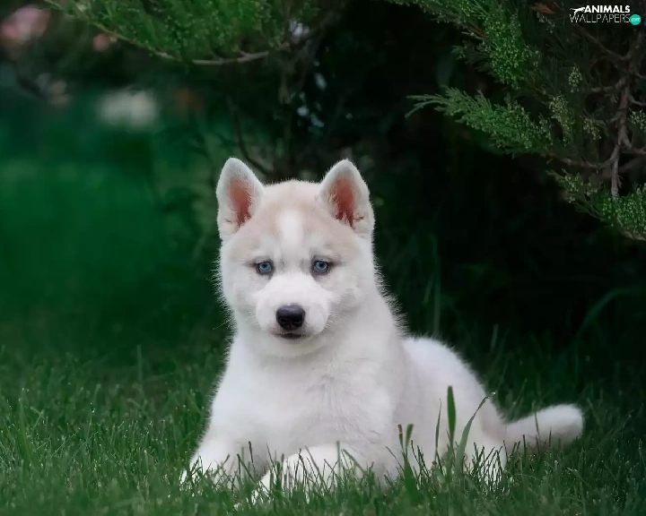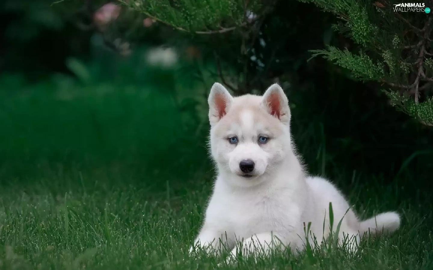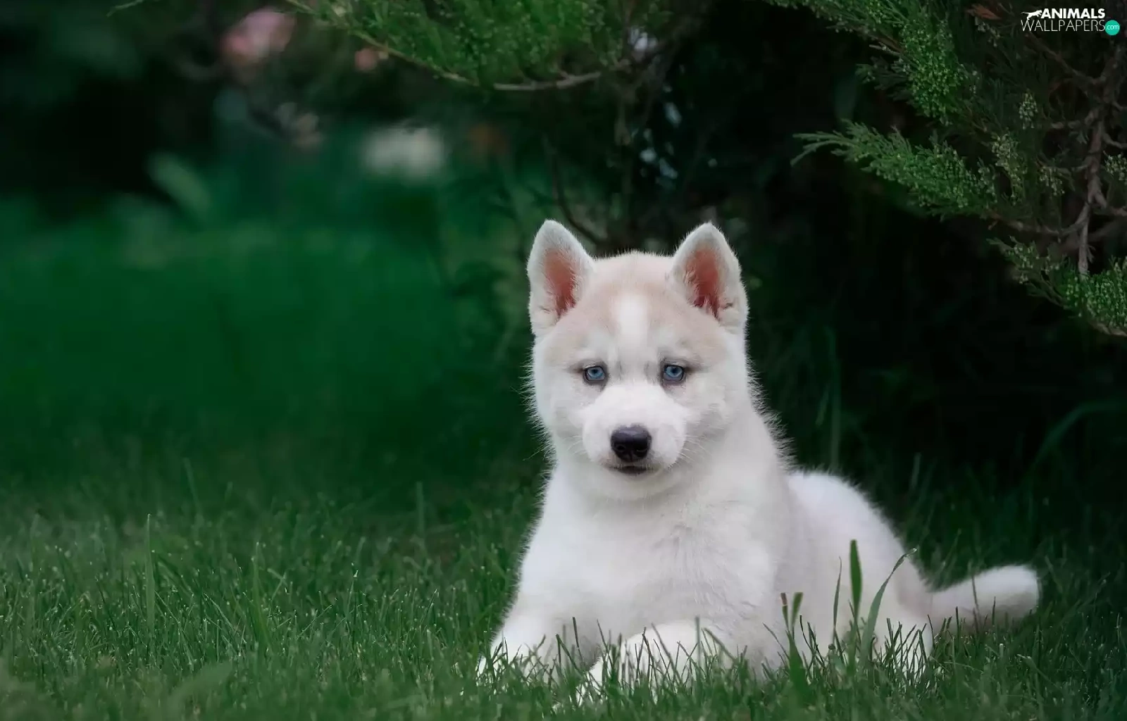 Green, grass, Puppy, Siberian Husky, Blue Eyed