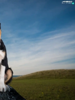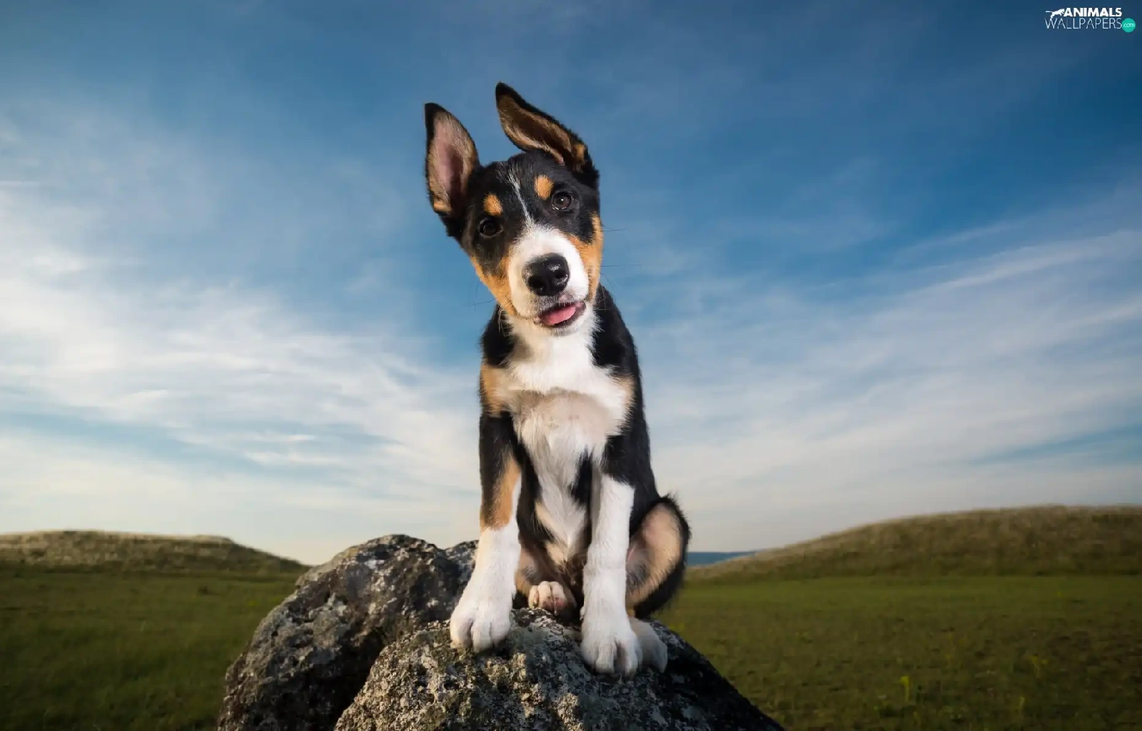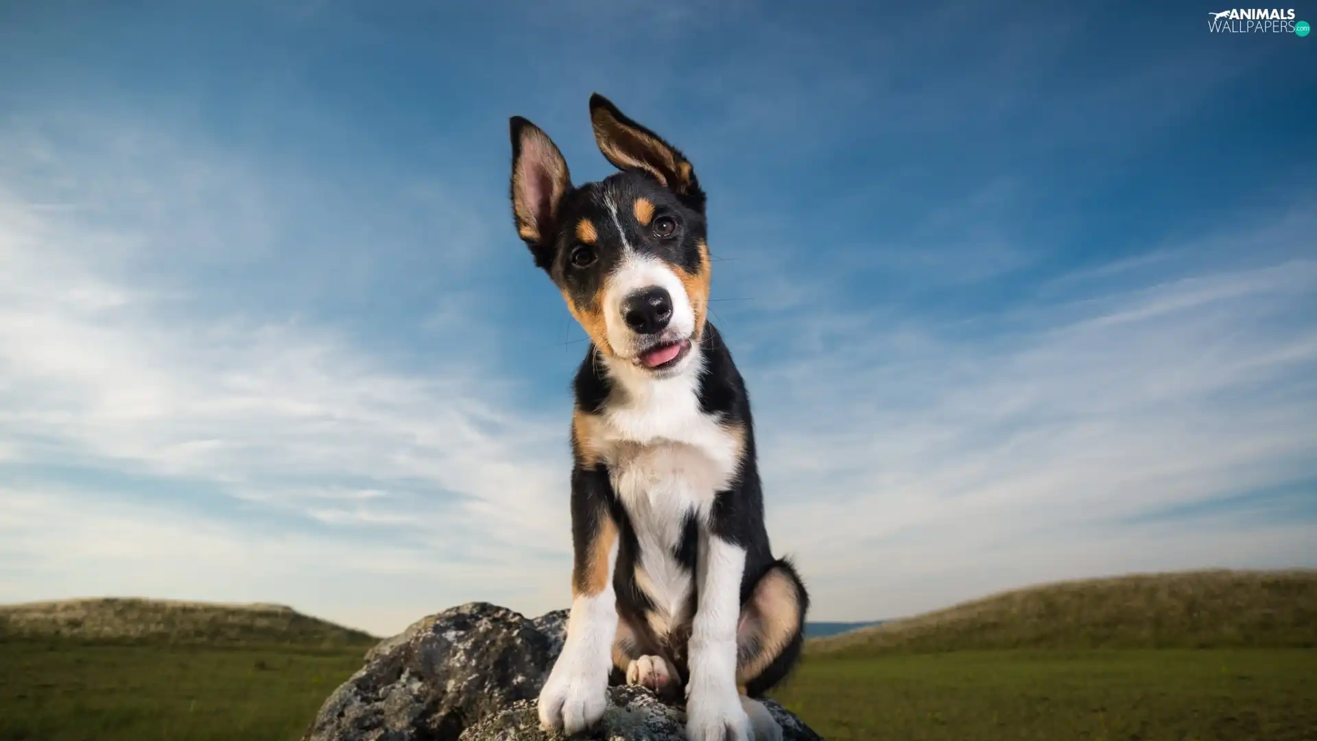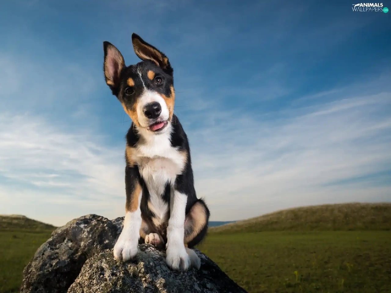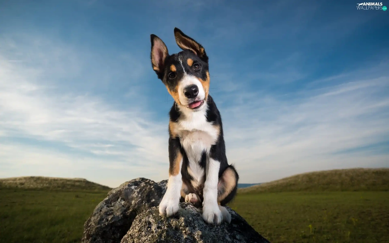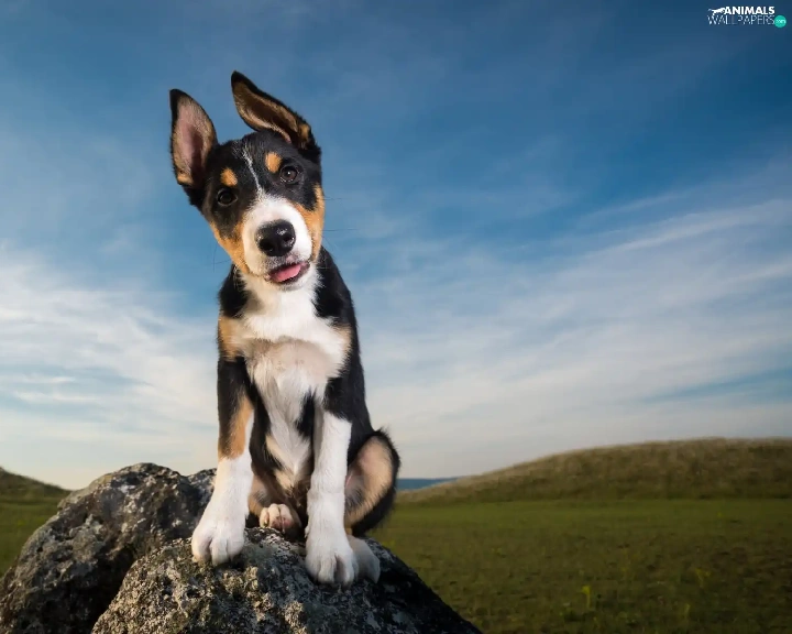 Meadow, Sky, Puppy, Stone, dog