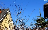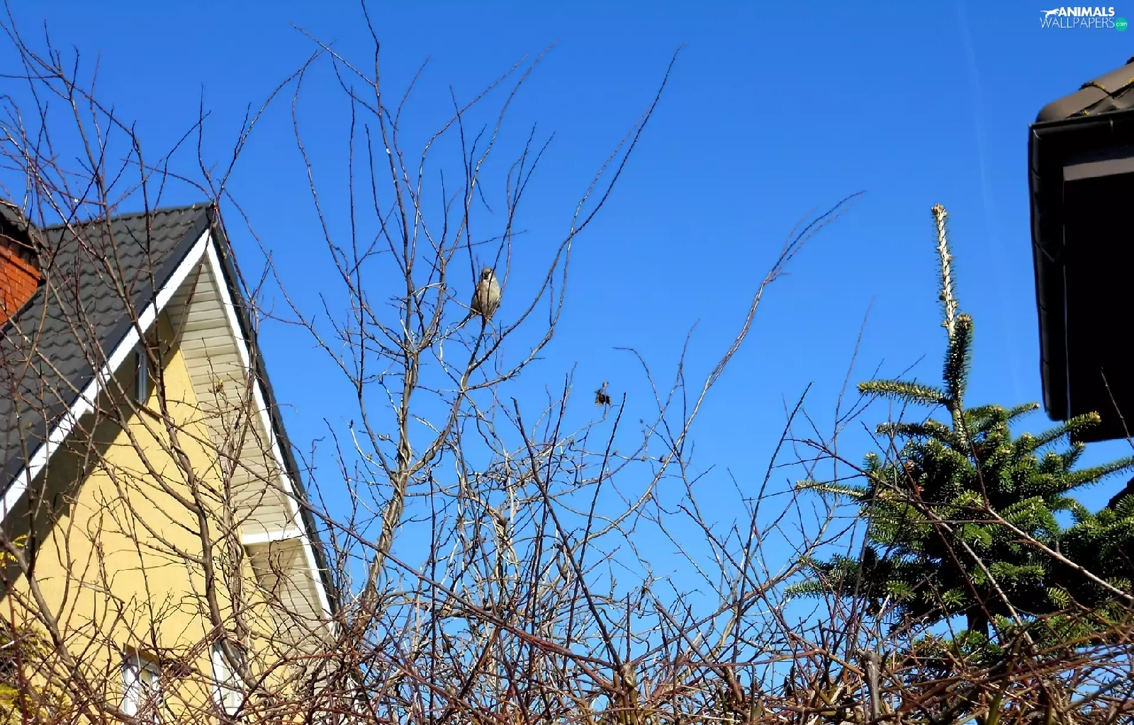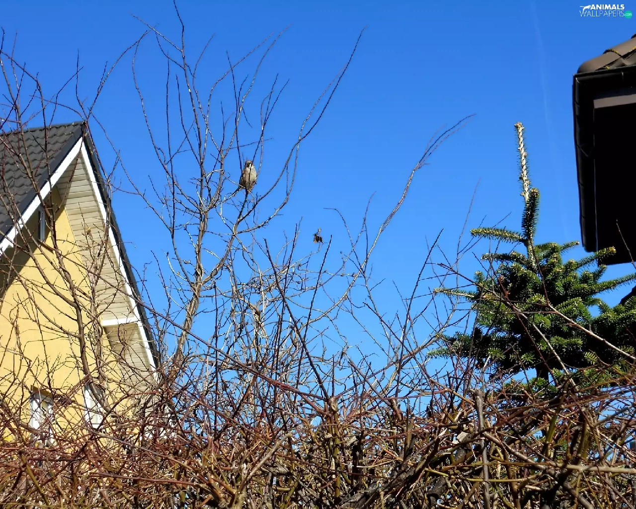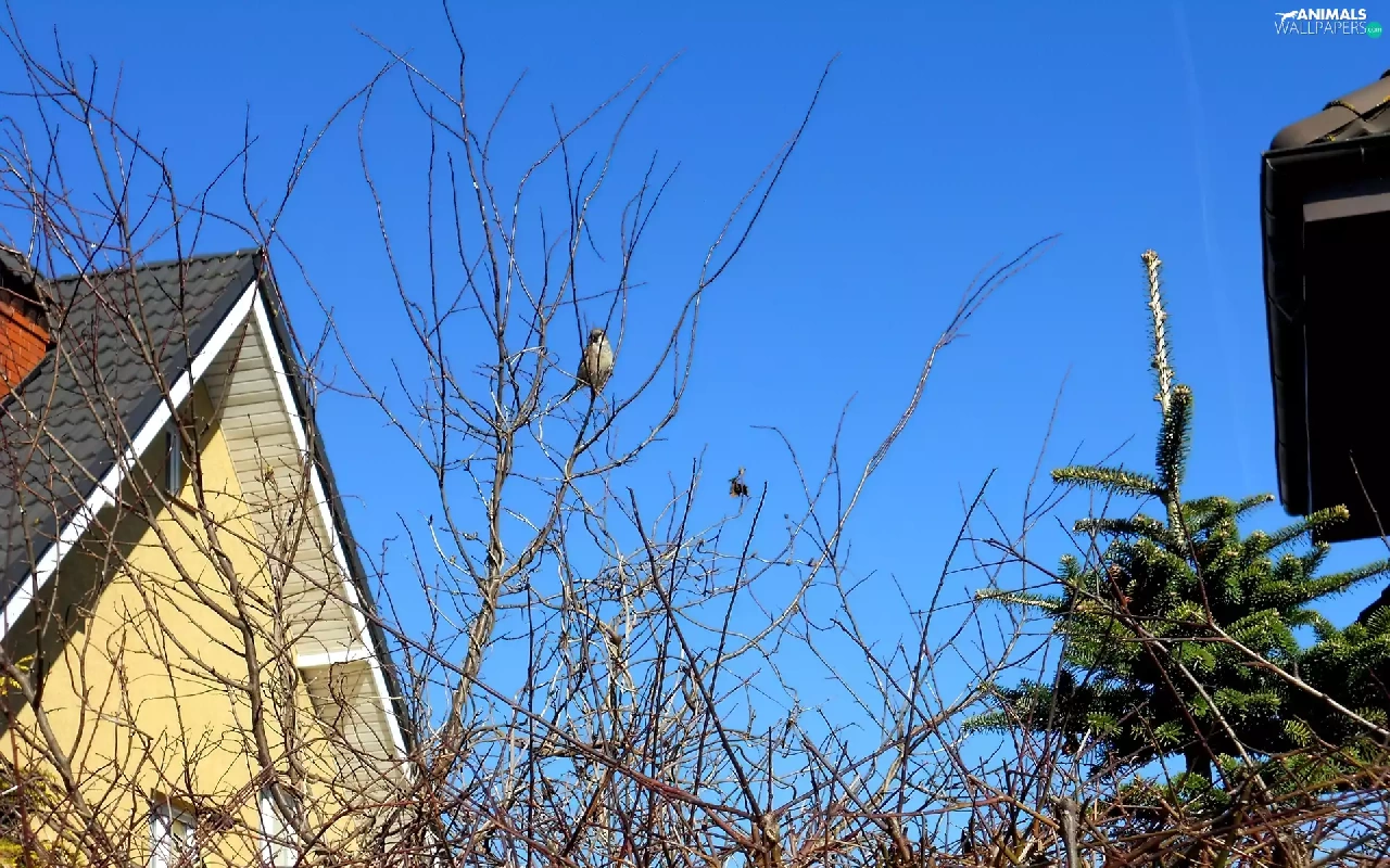viewes, Houses, Blue, Sky, sparrow, trees