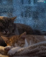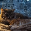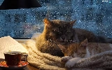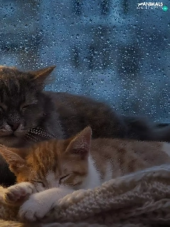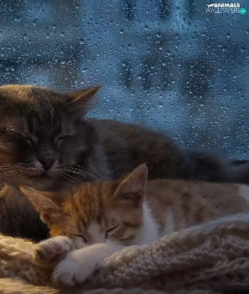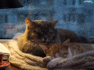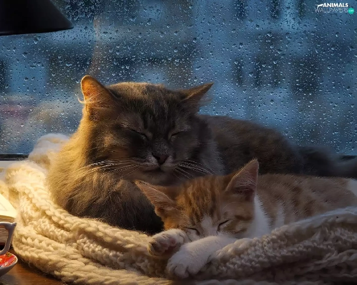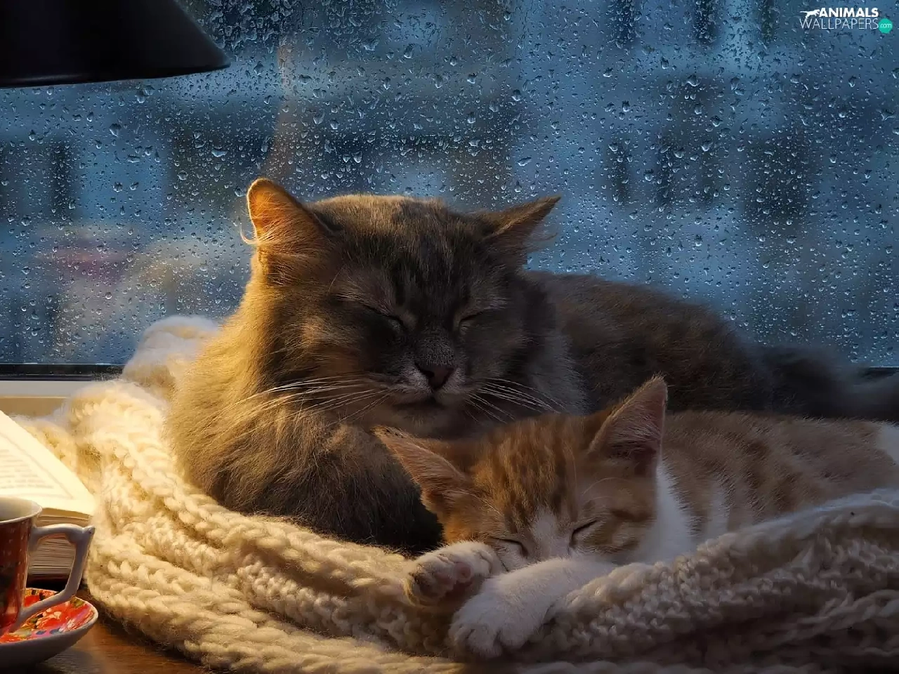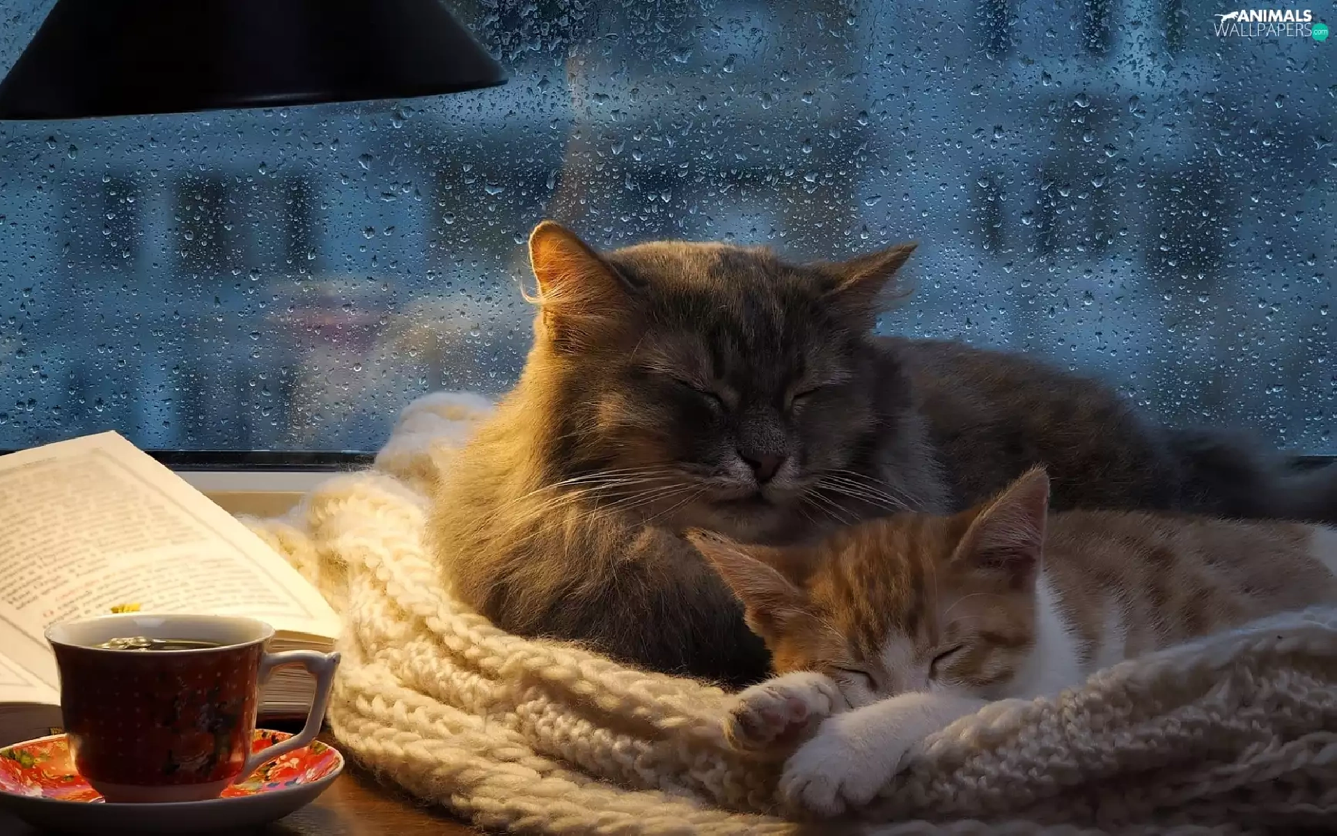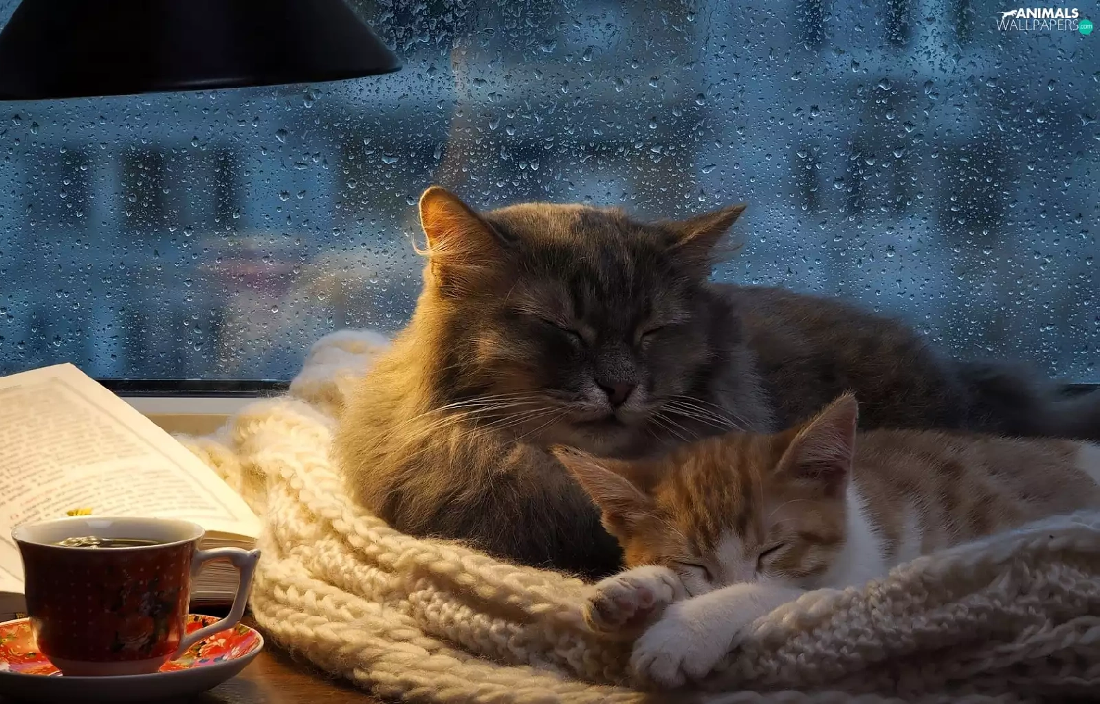 Lamp, Scarf, Window, small, Big, Glass, Book, Two cars, Rain, cup, cats, cuddled