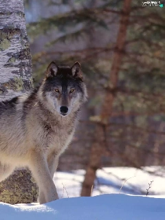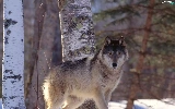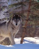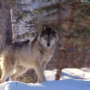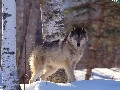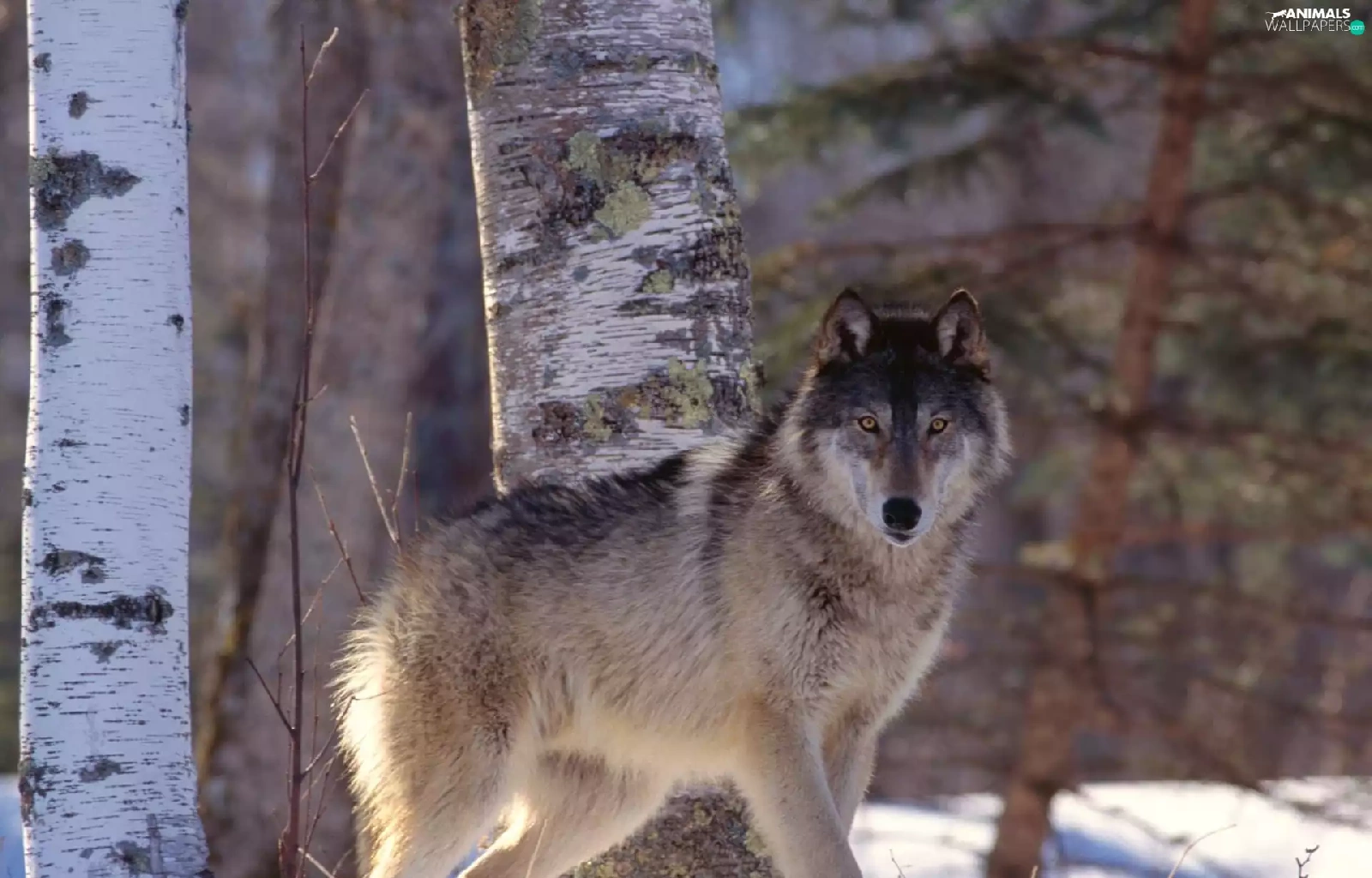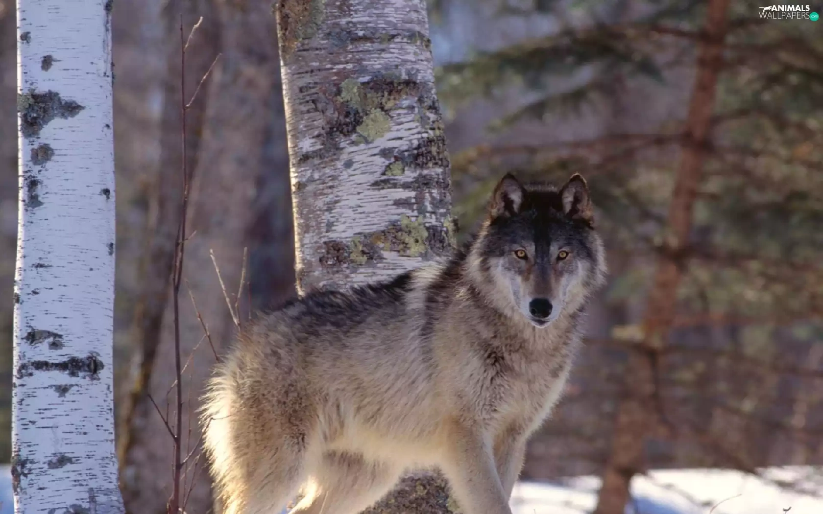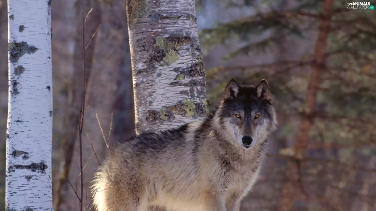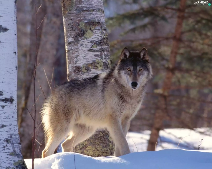snow, Wolf, birch