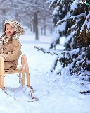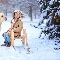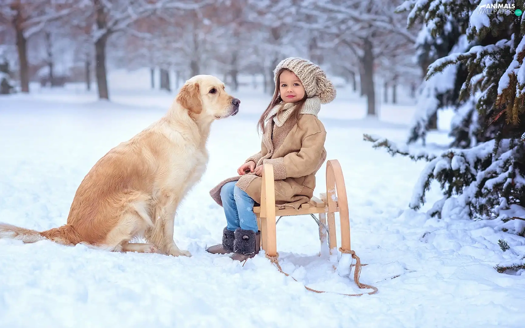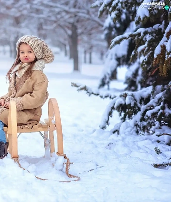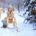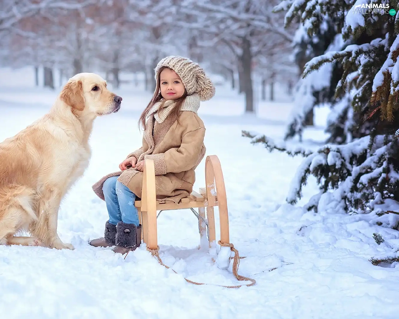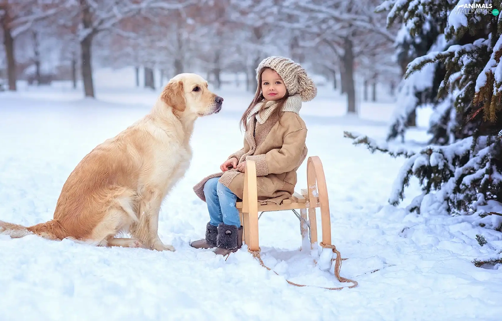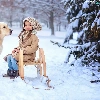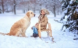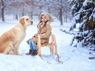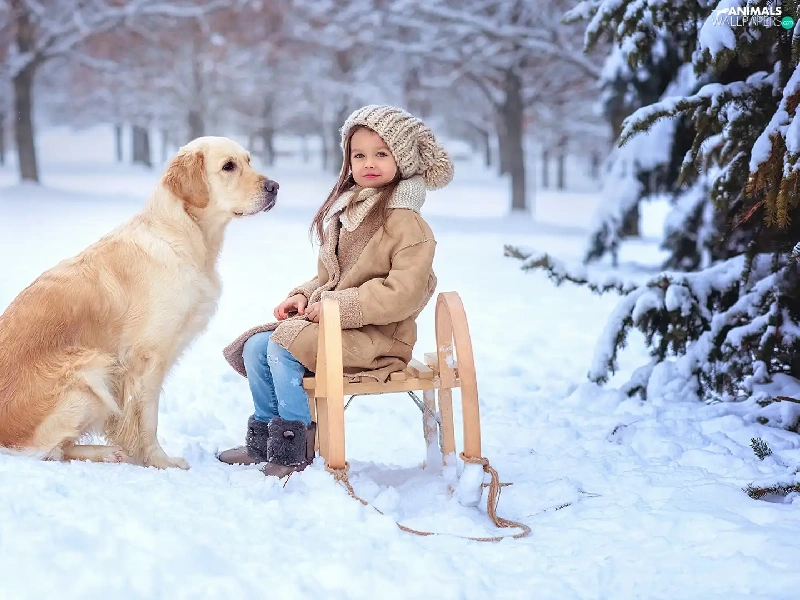 Golden Retriever, girl, snow, winter, sledge, dog