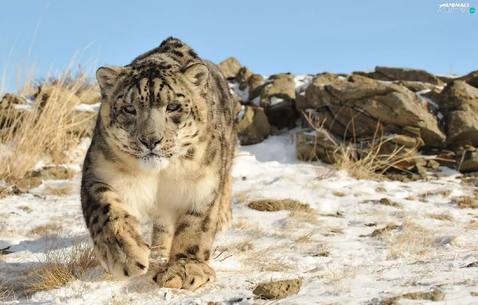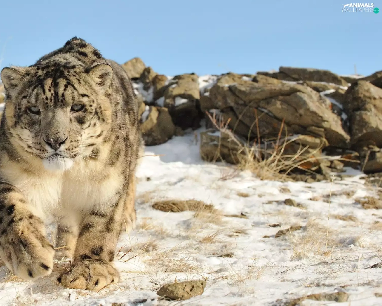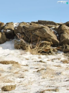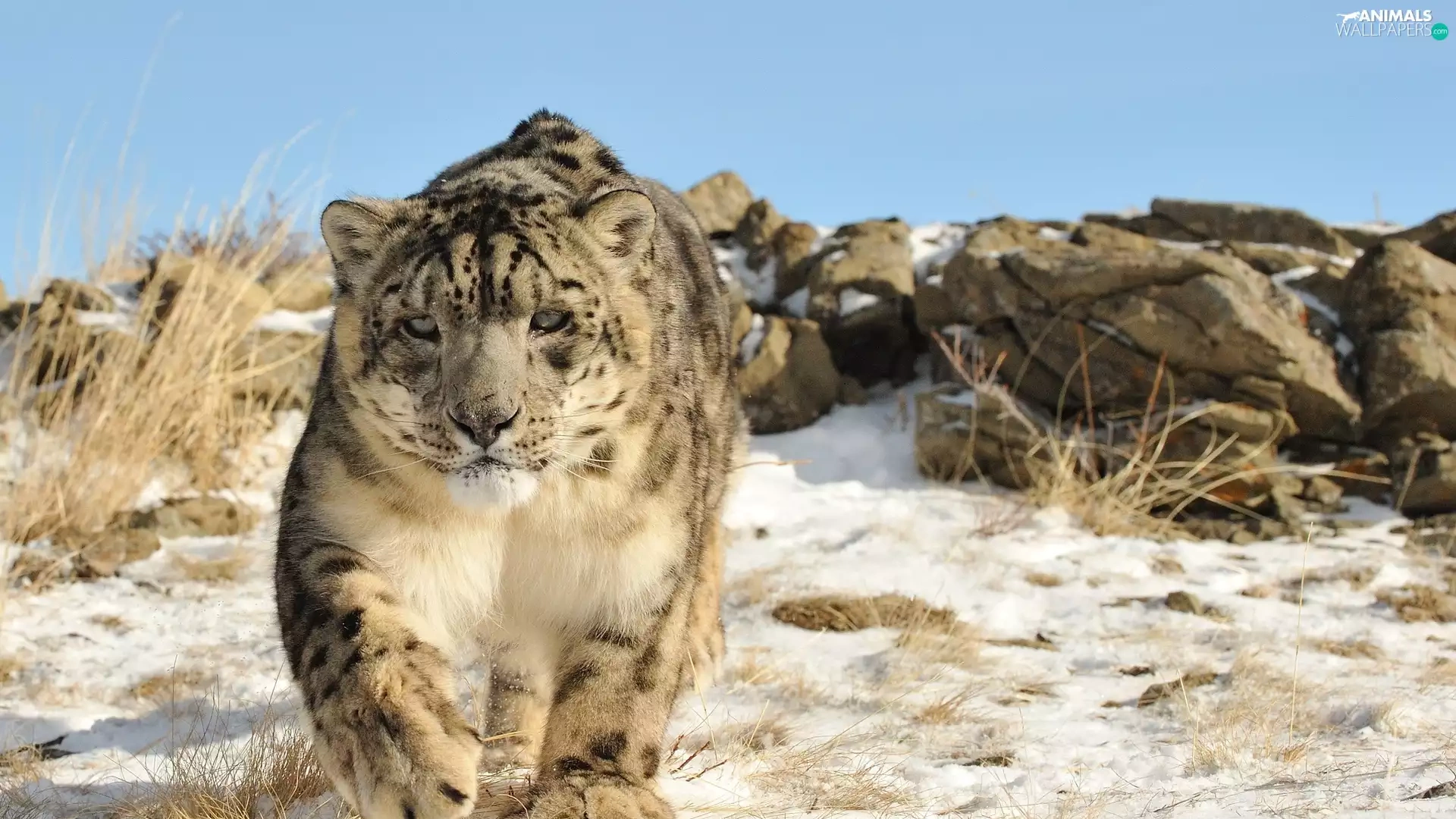 winter, snow leopard, snow, rocks, Panther