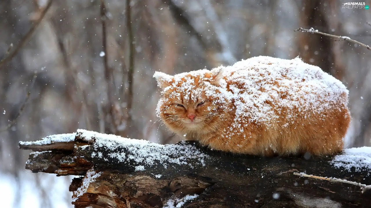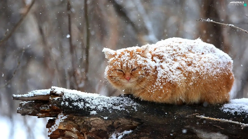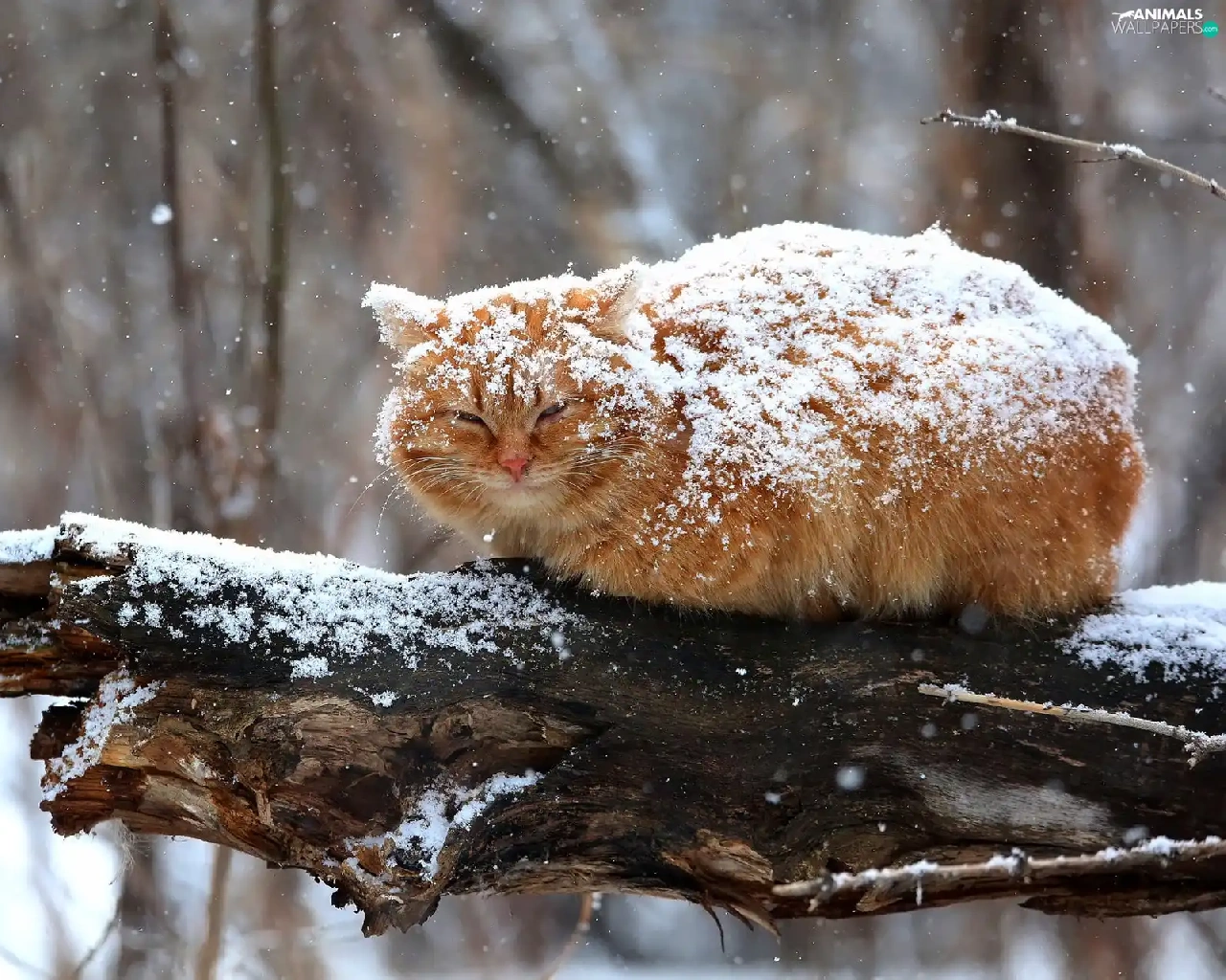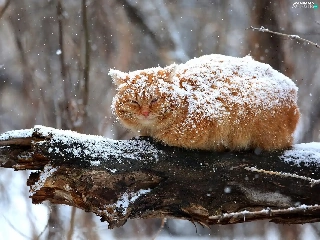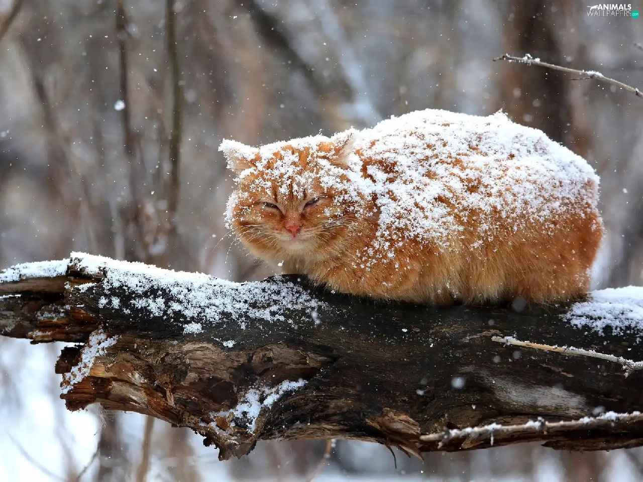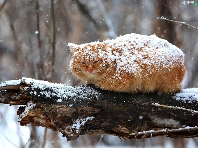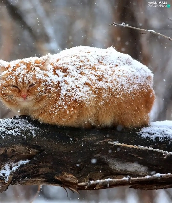 ginger, sprinkle, branch, snow, cat, snow