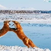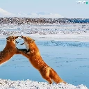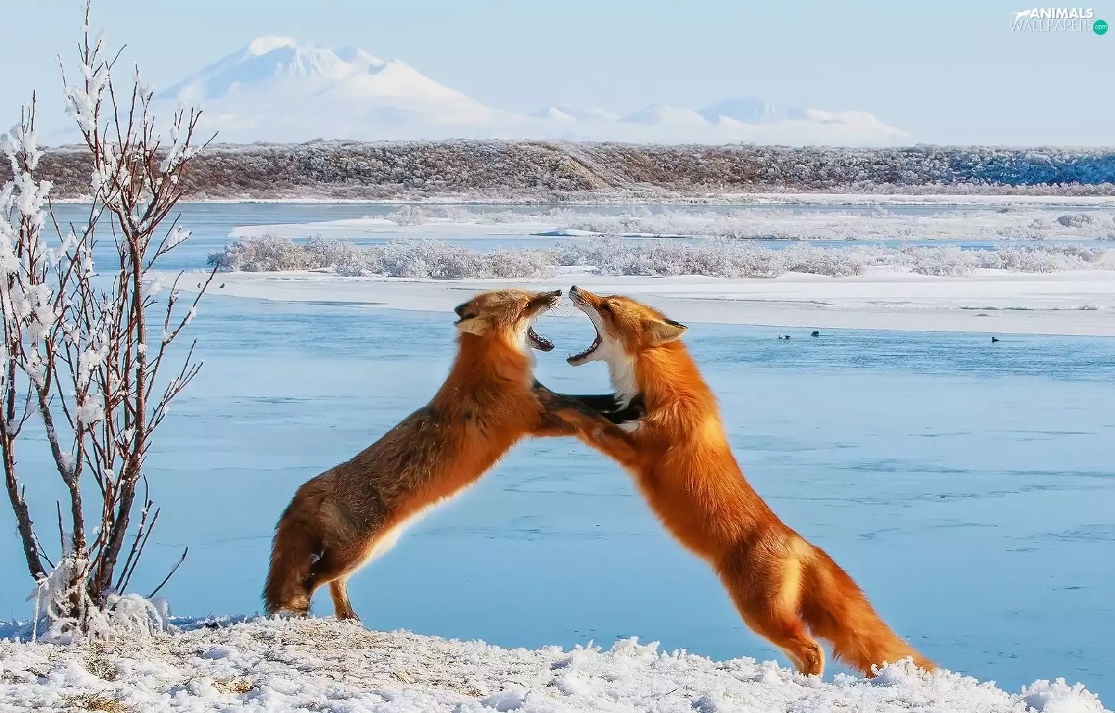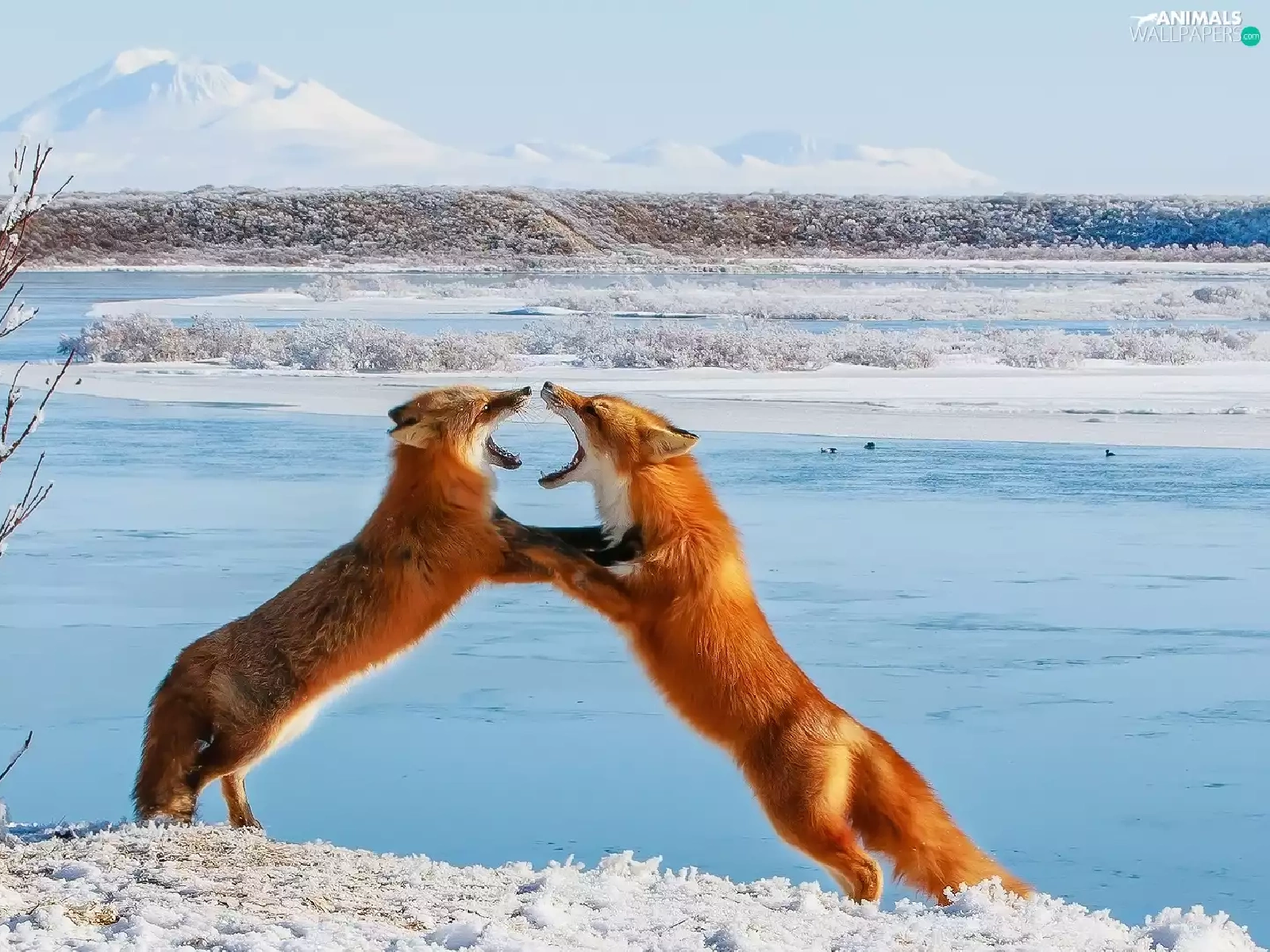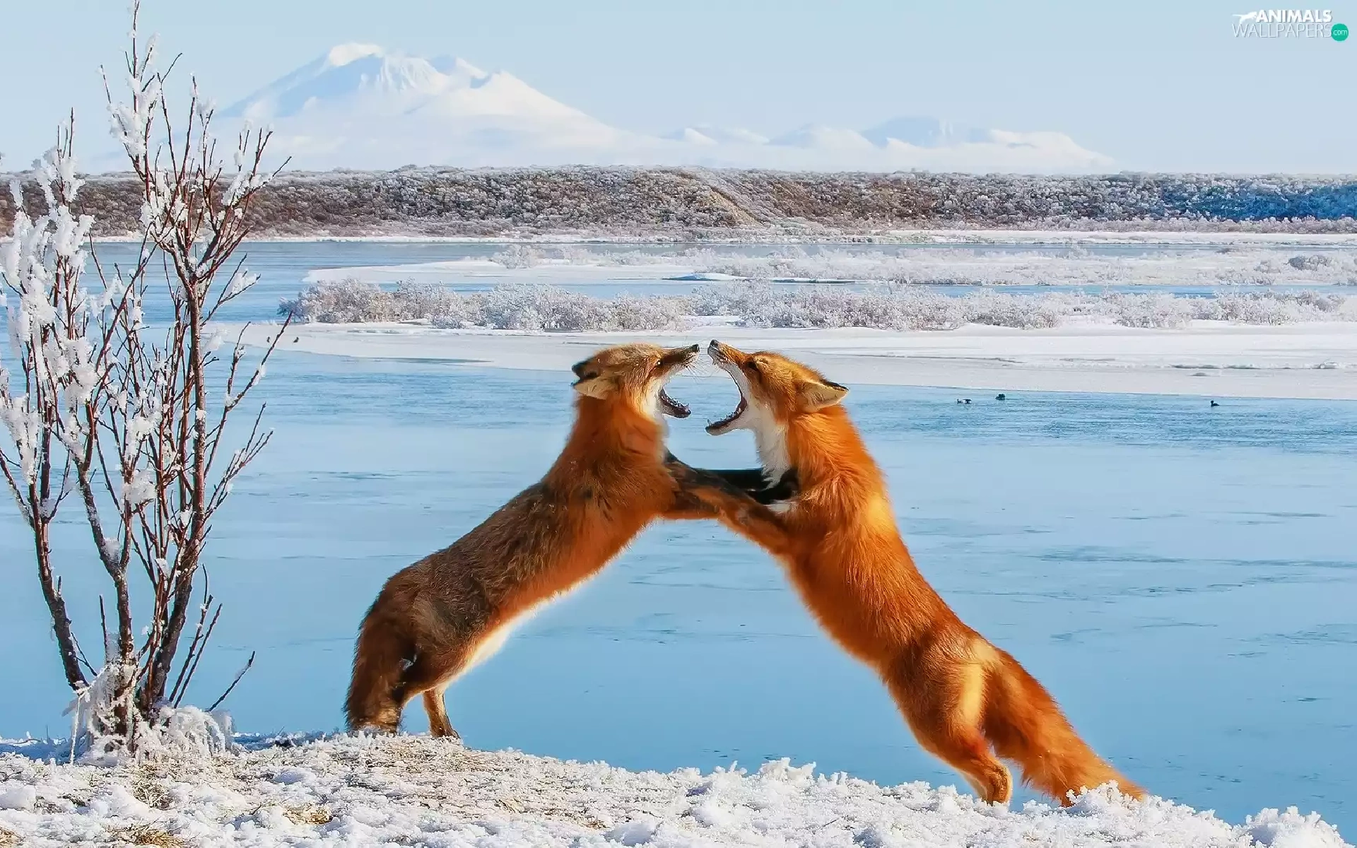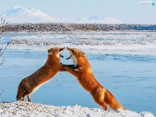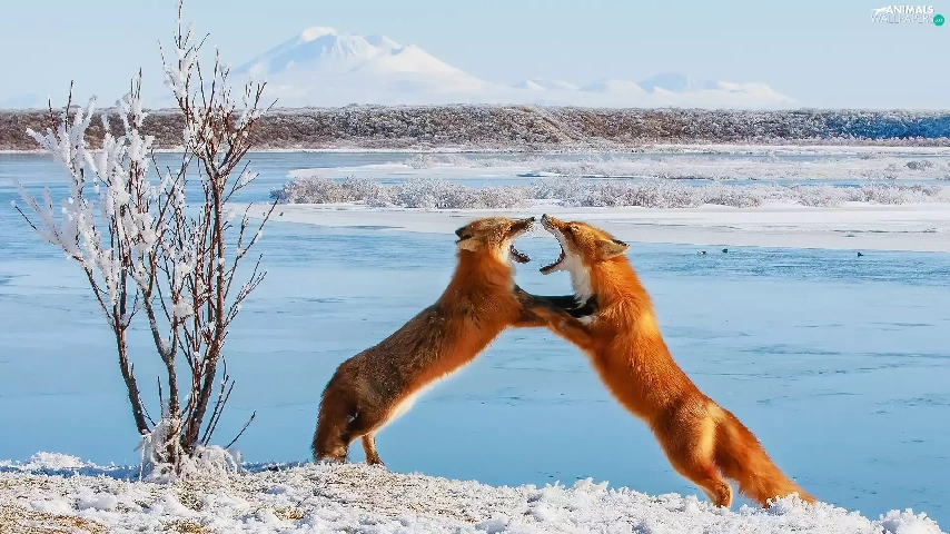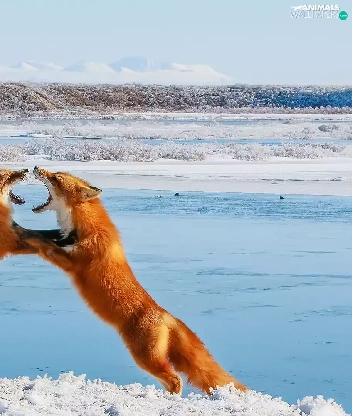 Two cars, winter, fox, play, red head, snow