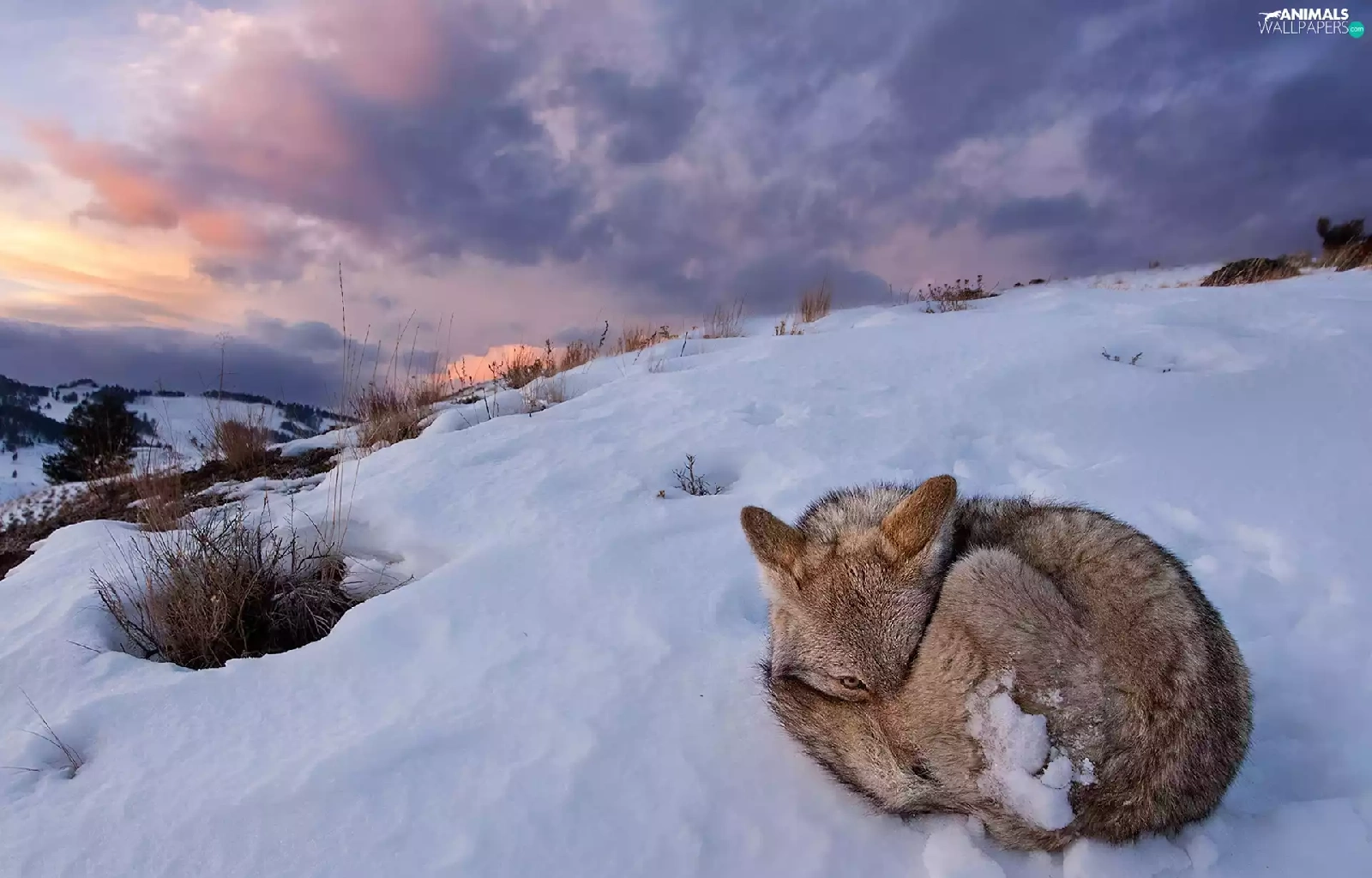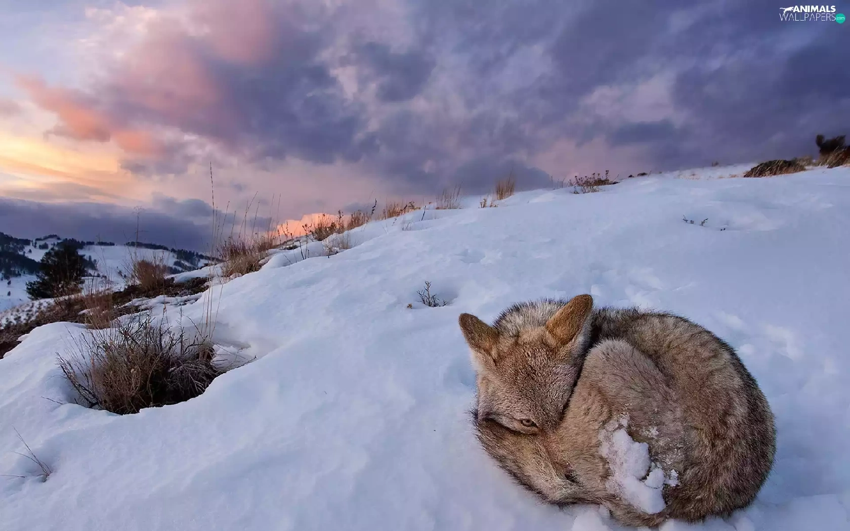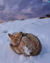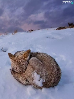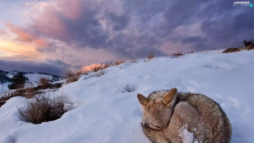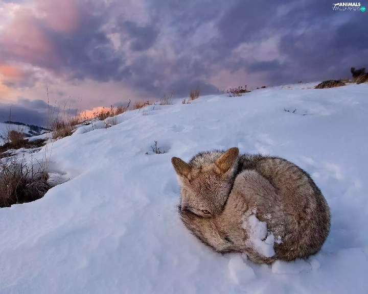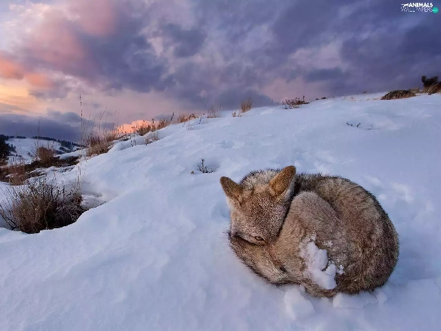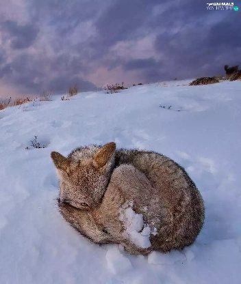 winter, hunched, fox, snow