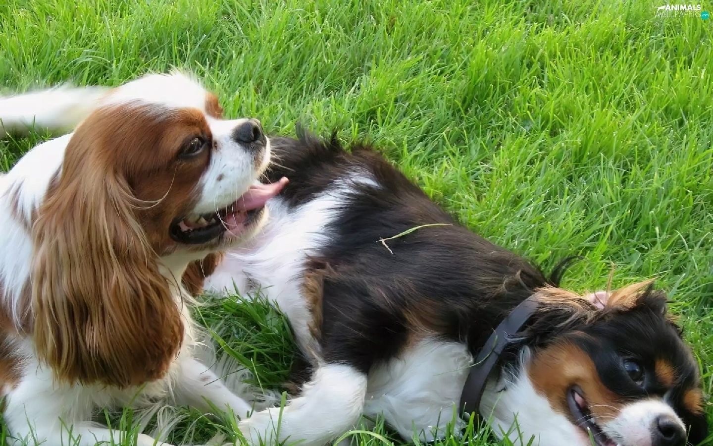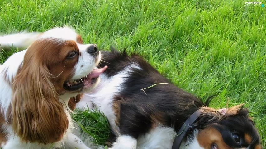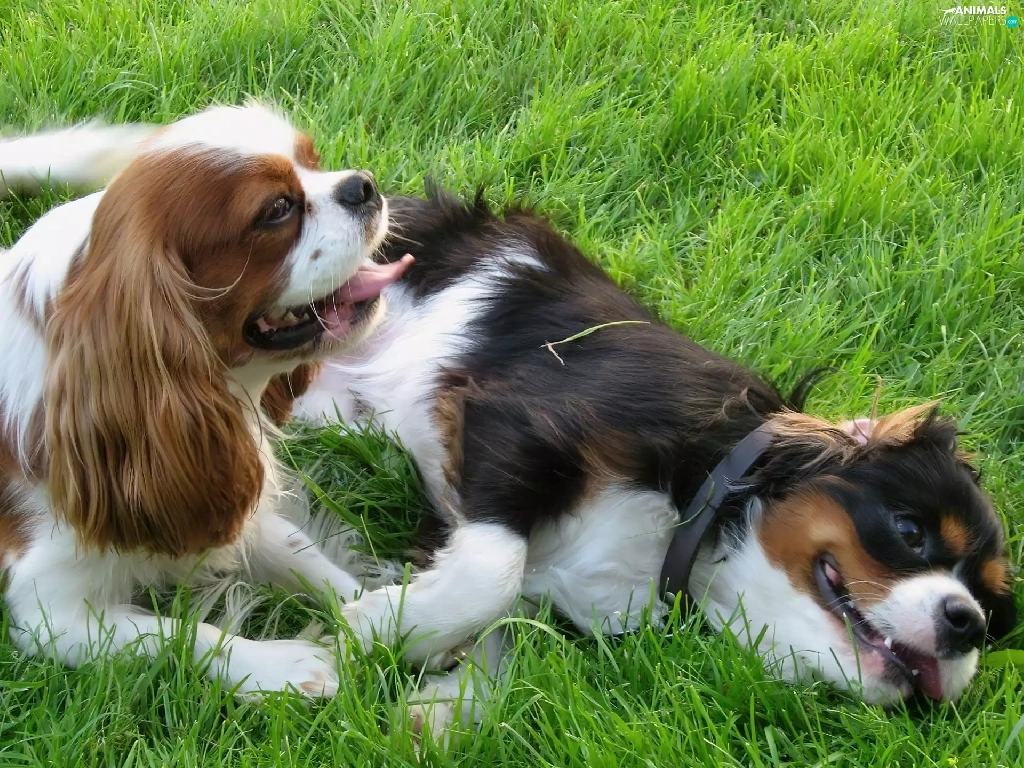 Two cars, Toy Spaniel, grass, puppies