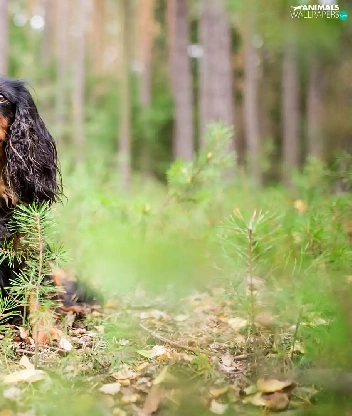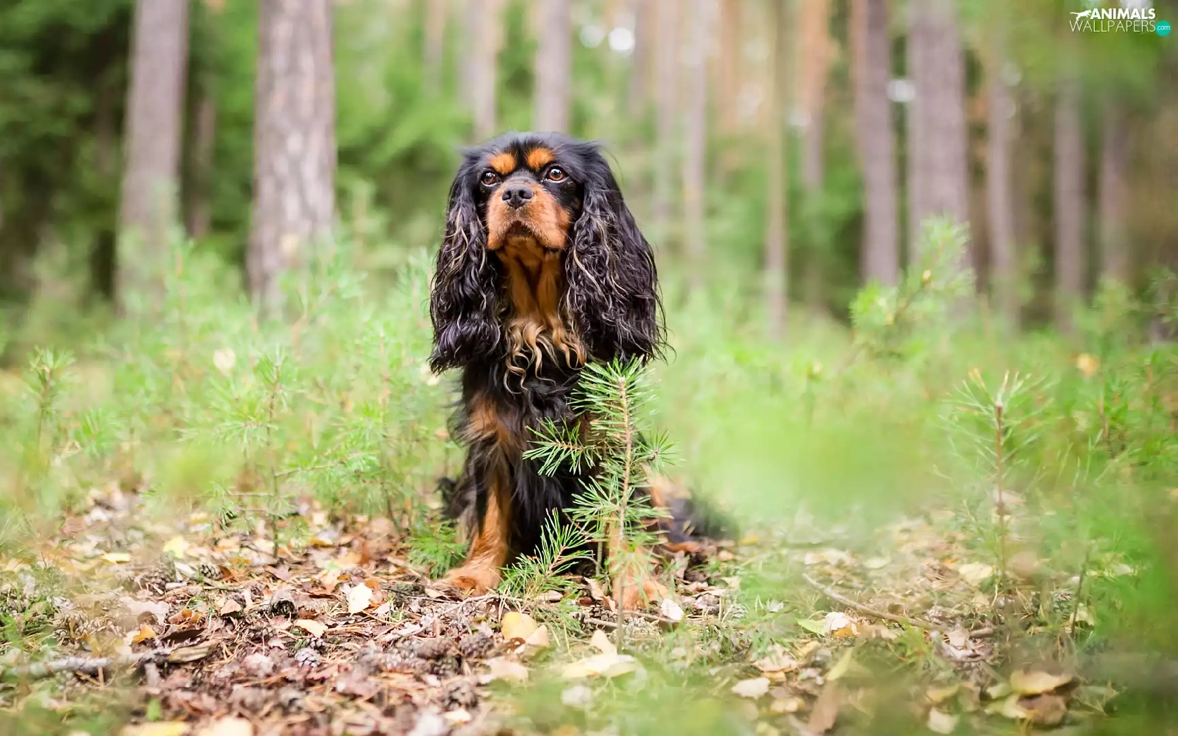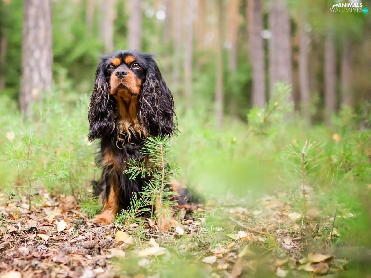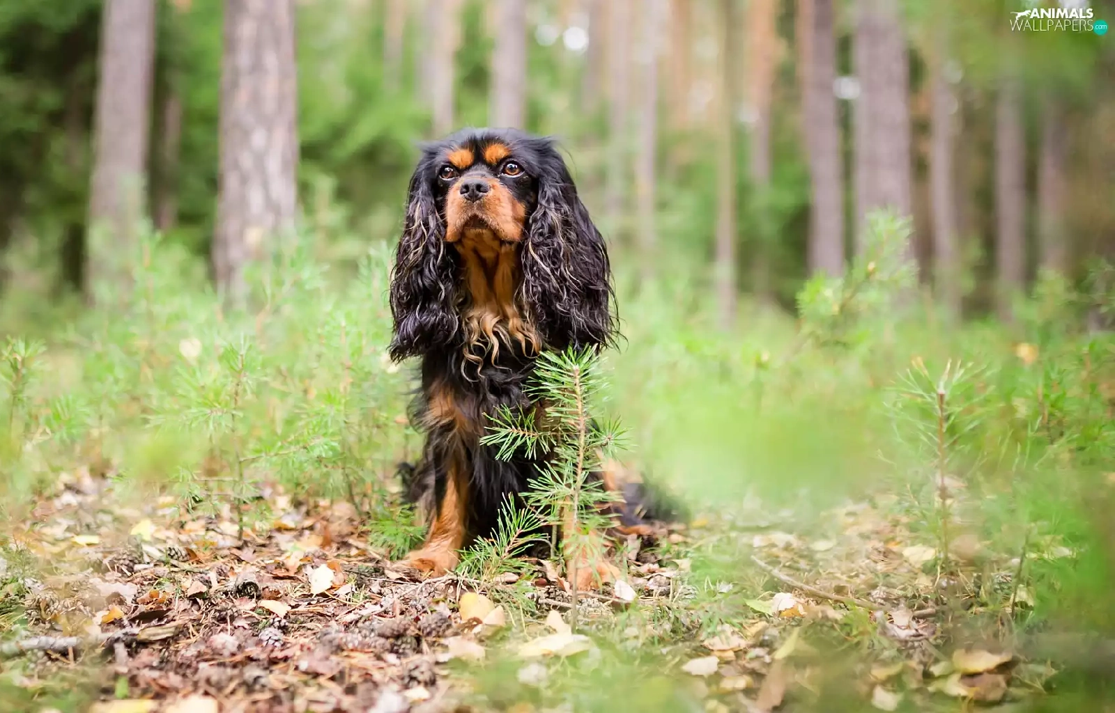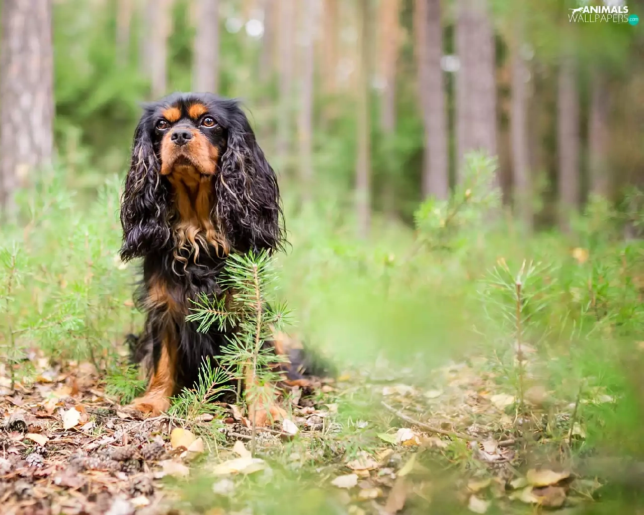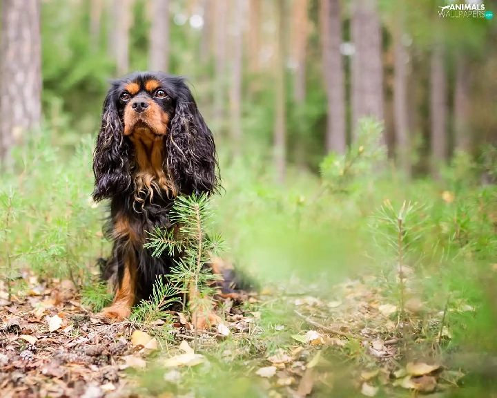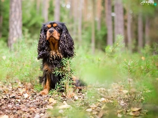 forest, dog, viewes, litter, trees, King Charles Spaniel