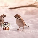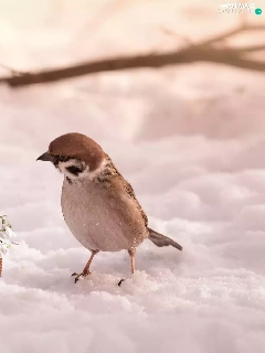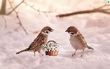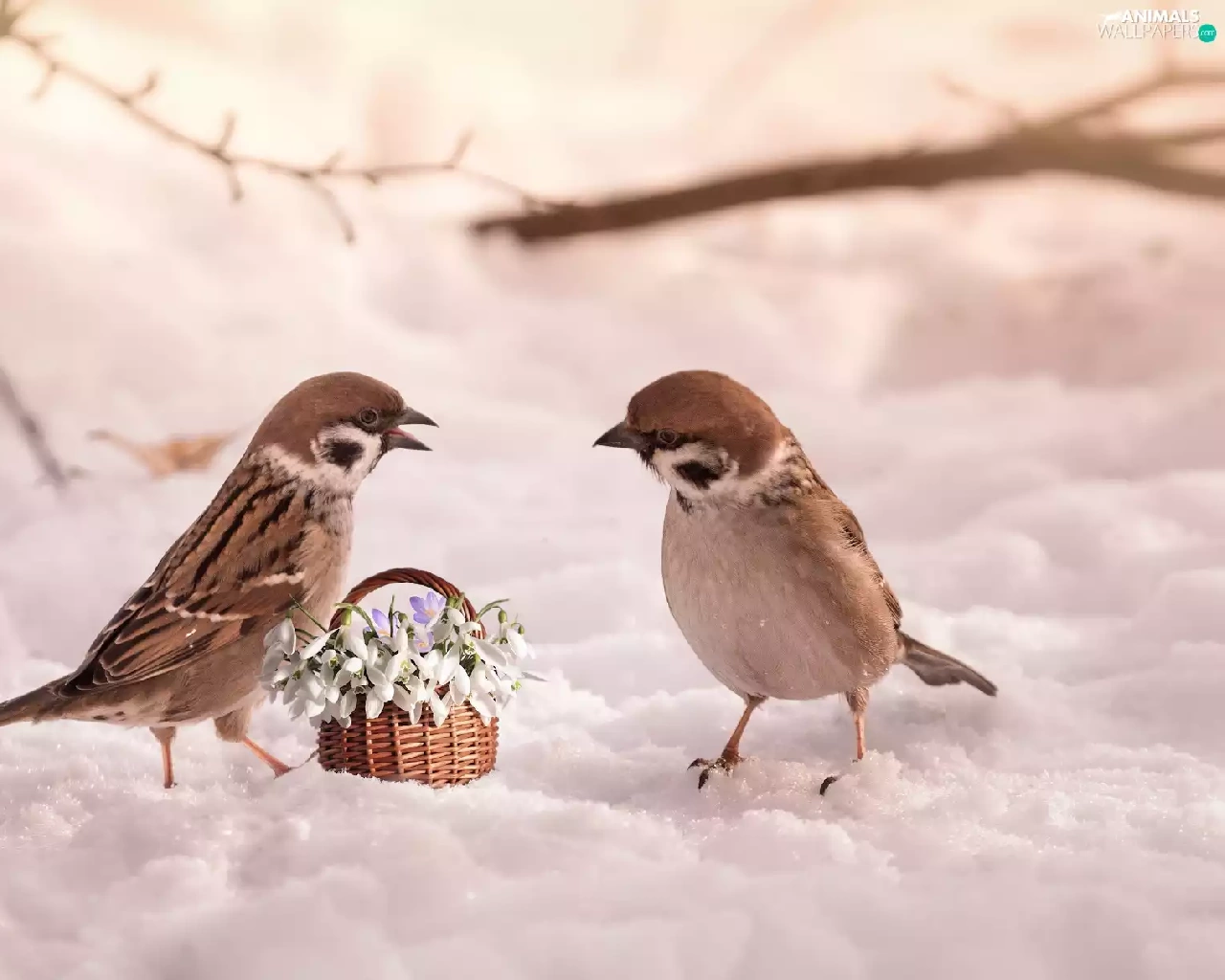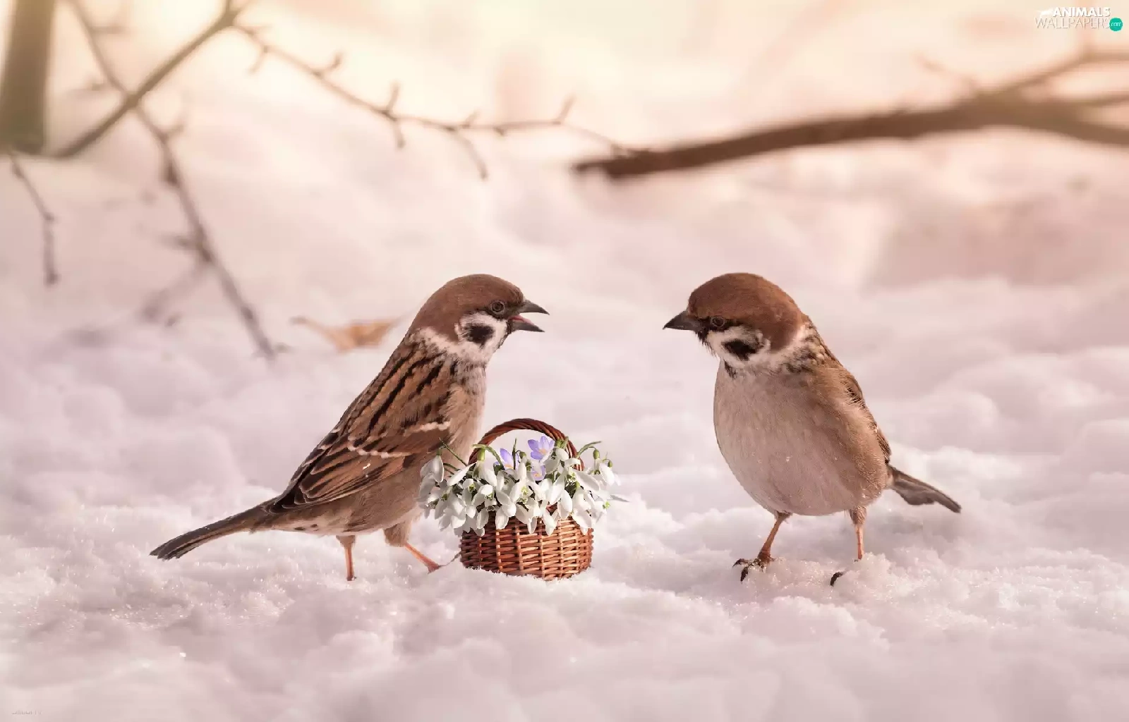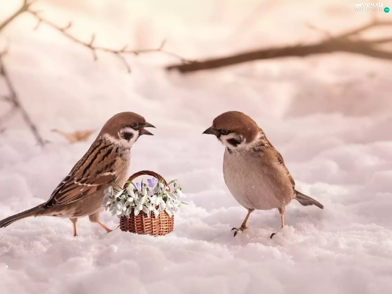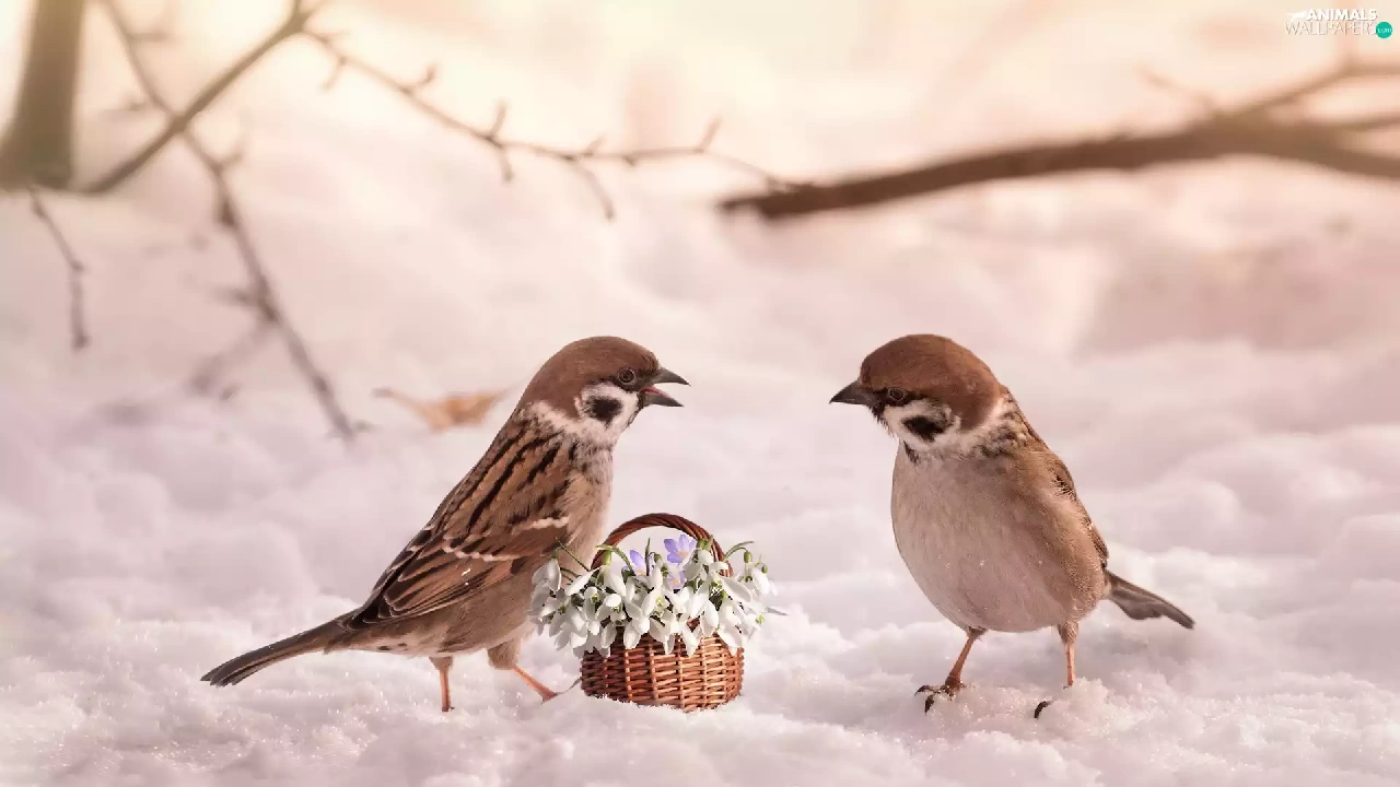 Sparrows, Flowers, snow, snowdrops, winter, birds, Two cars, basket