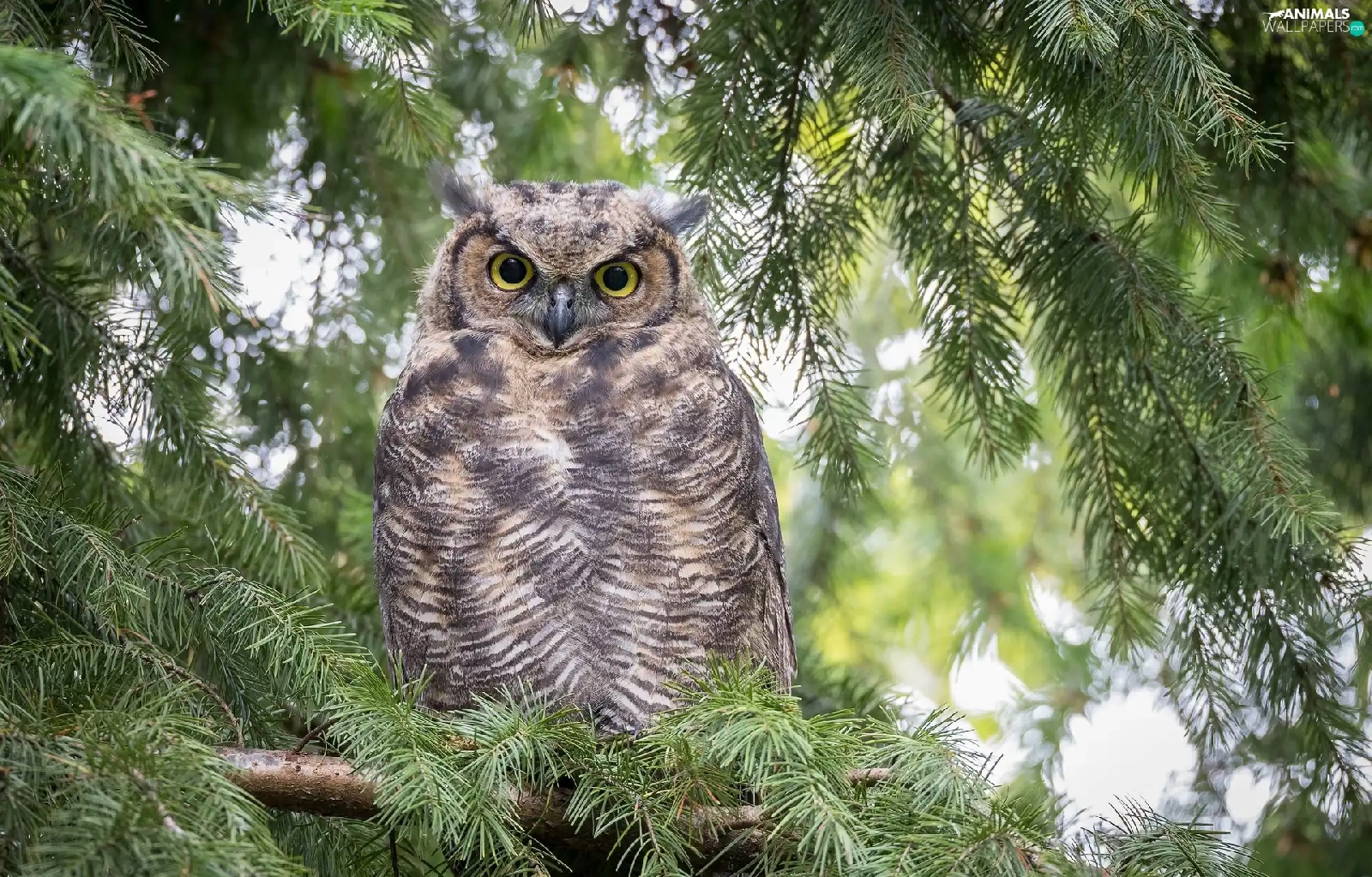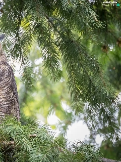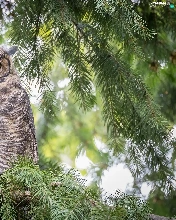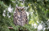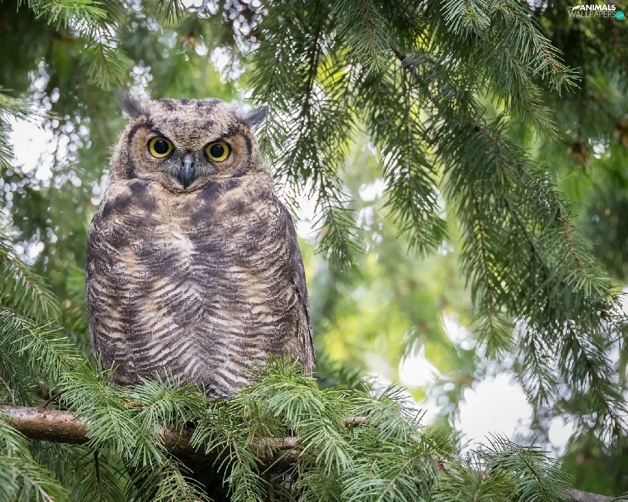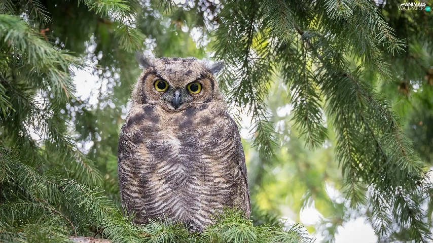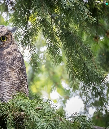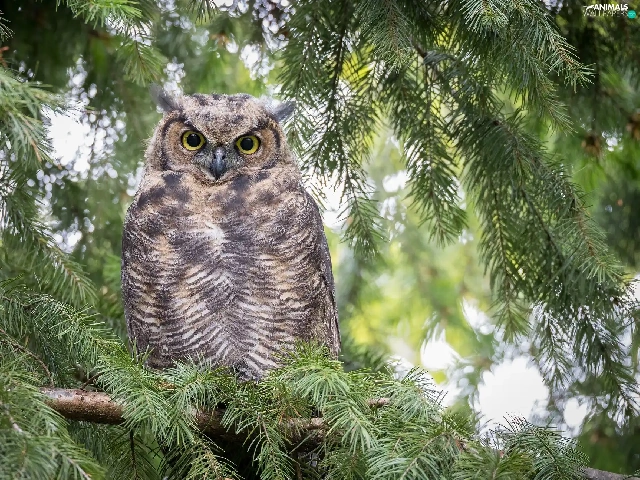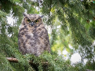 owl, Twigs, spruce, Great Horned Owl