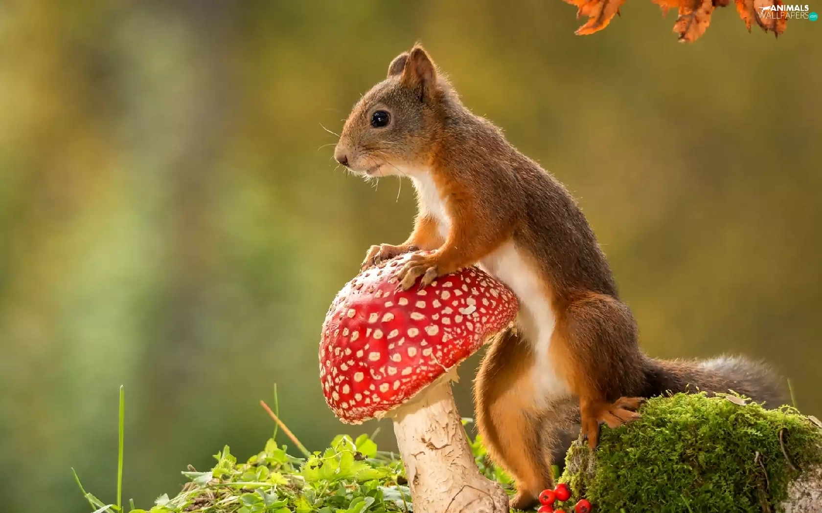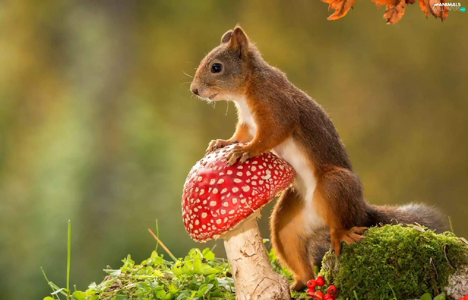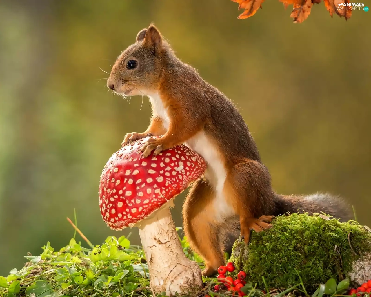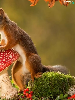 Moss, Mountain Ash, squirrel, Mushrooms, autumn