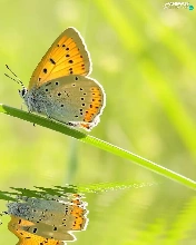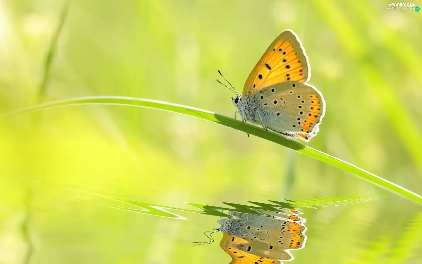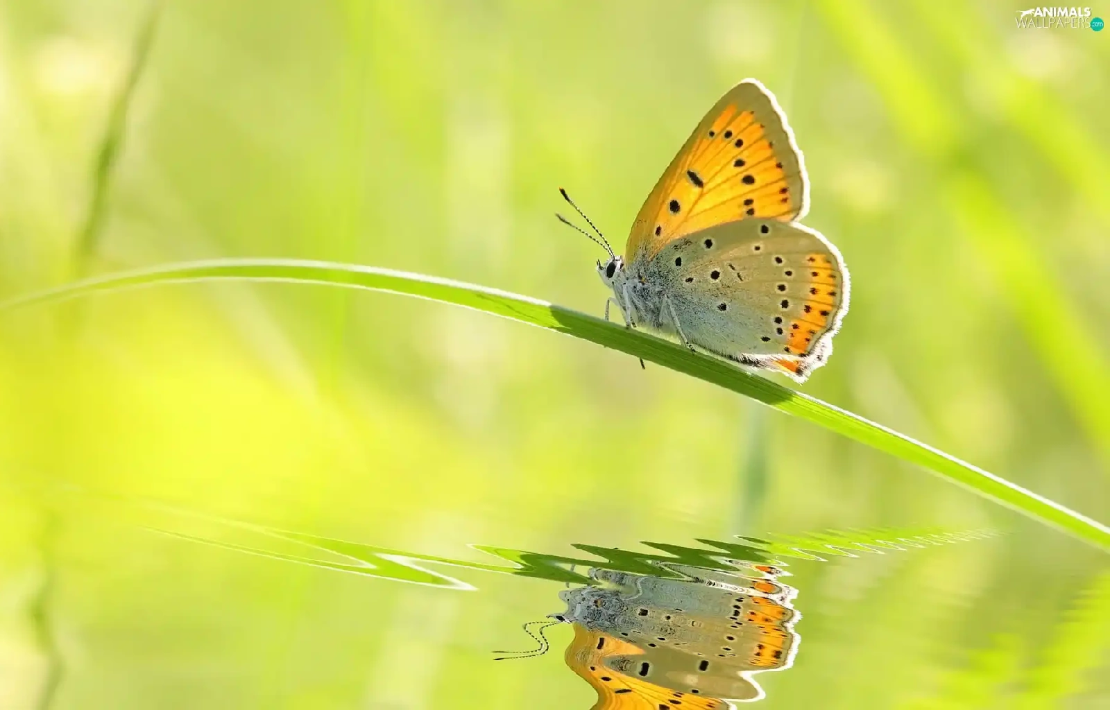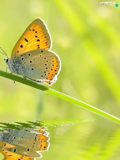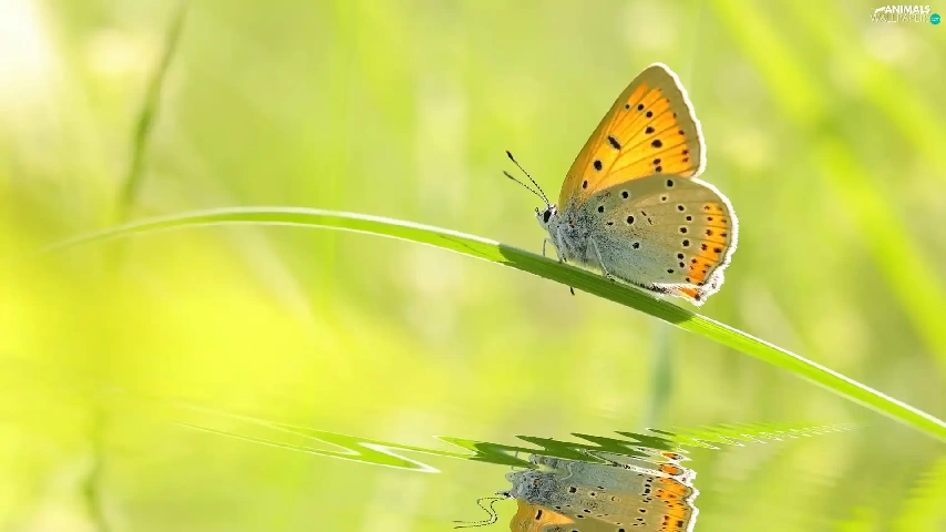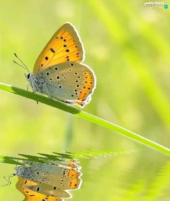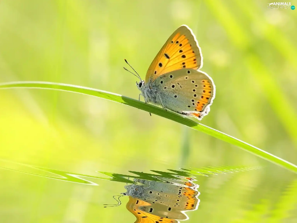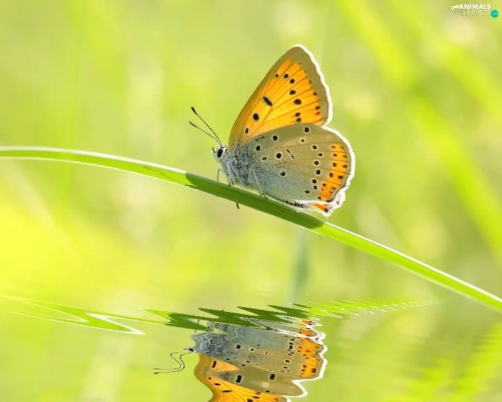 butterfly, grass, reflection, stalk