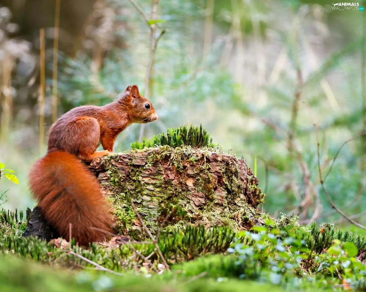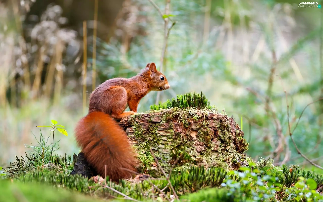 squirrel, Moss, forest, Stone
