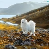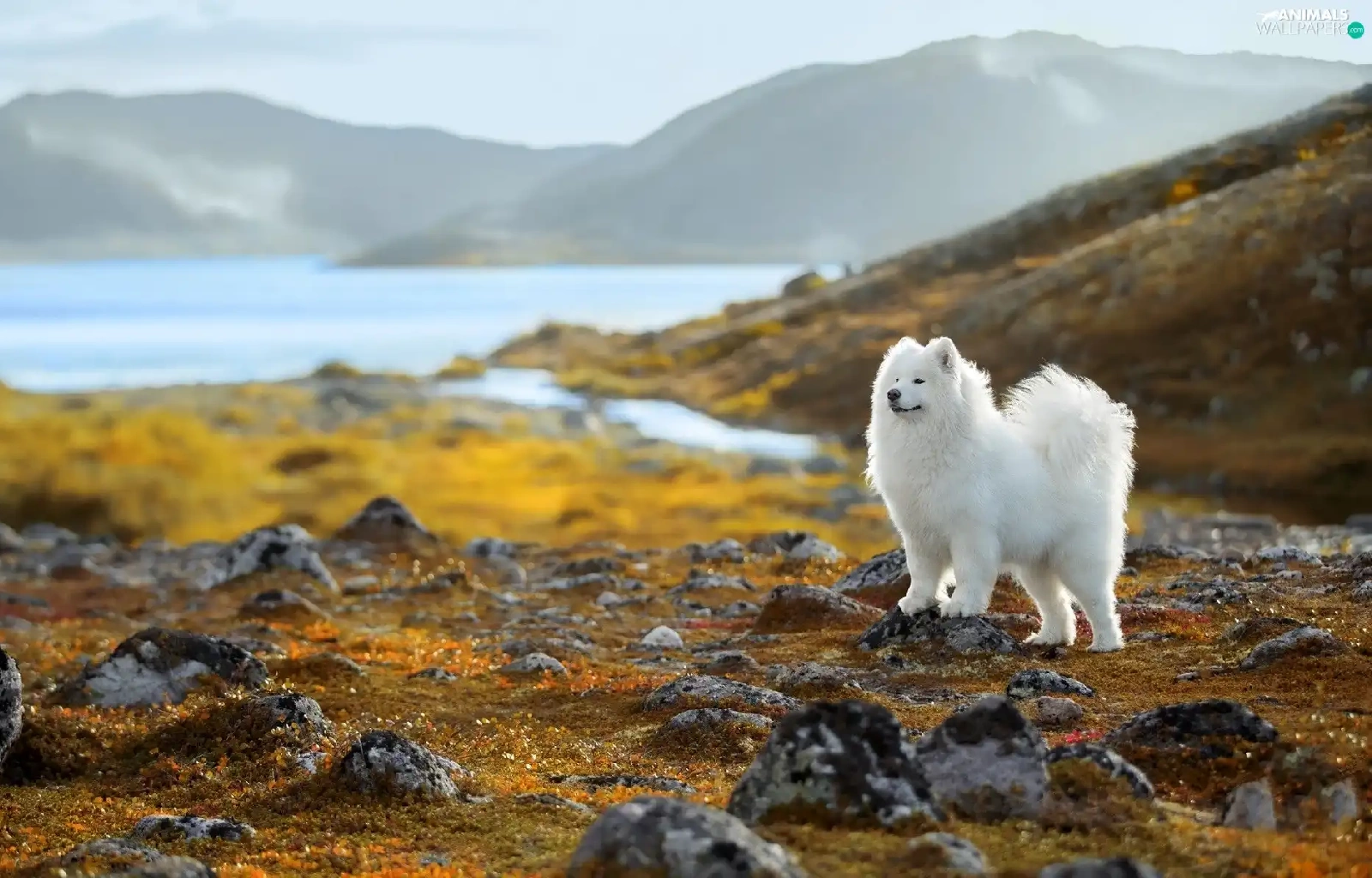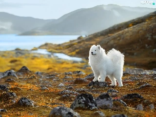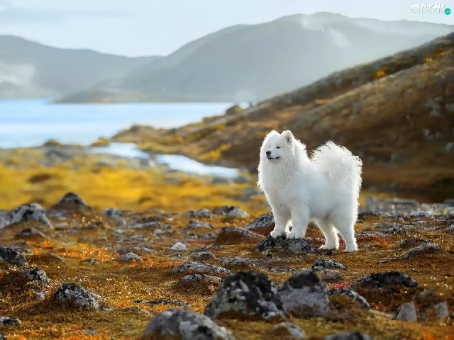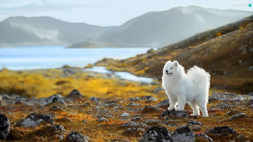Samojed, White, lake, Stones, Mountains, dog