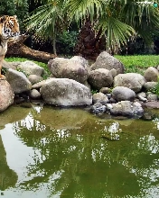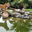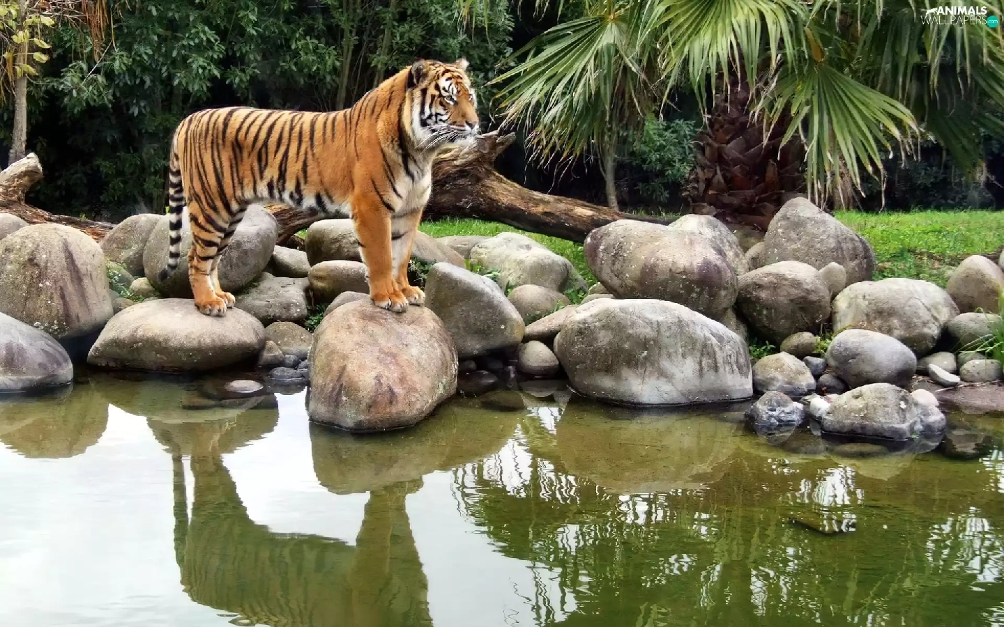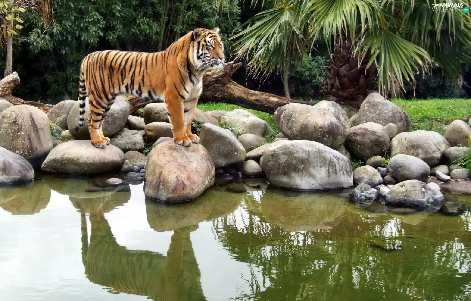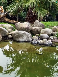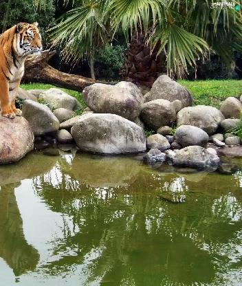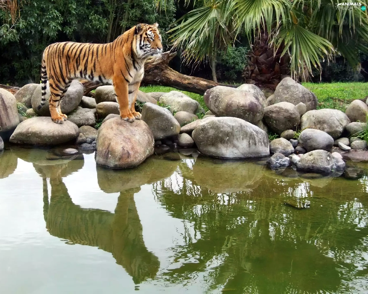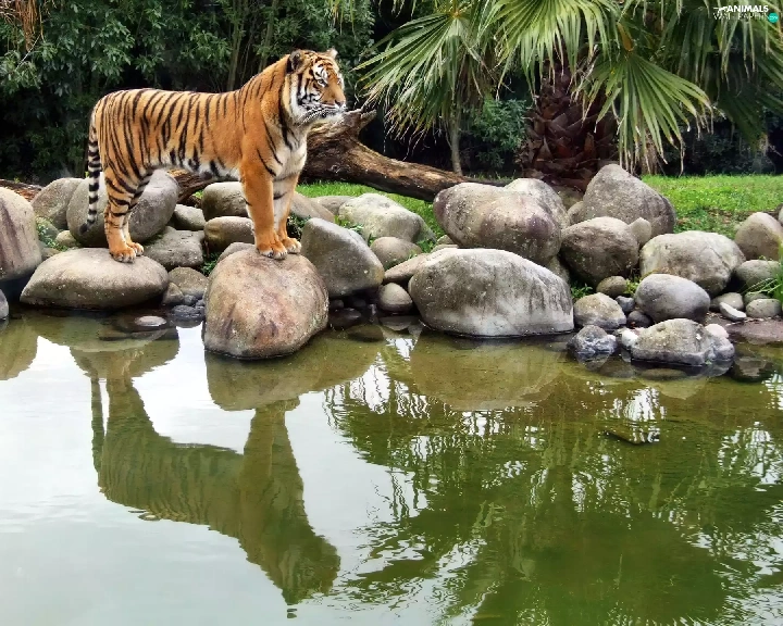 tiger, water, reflection, Stones