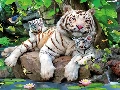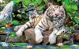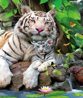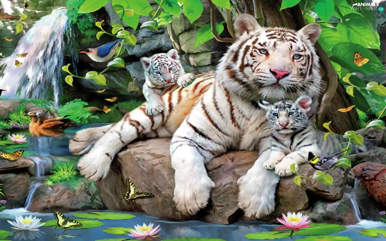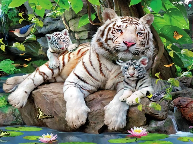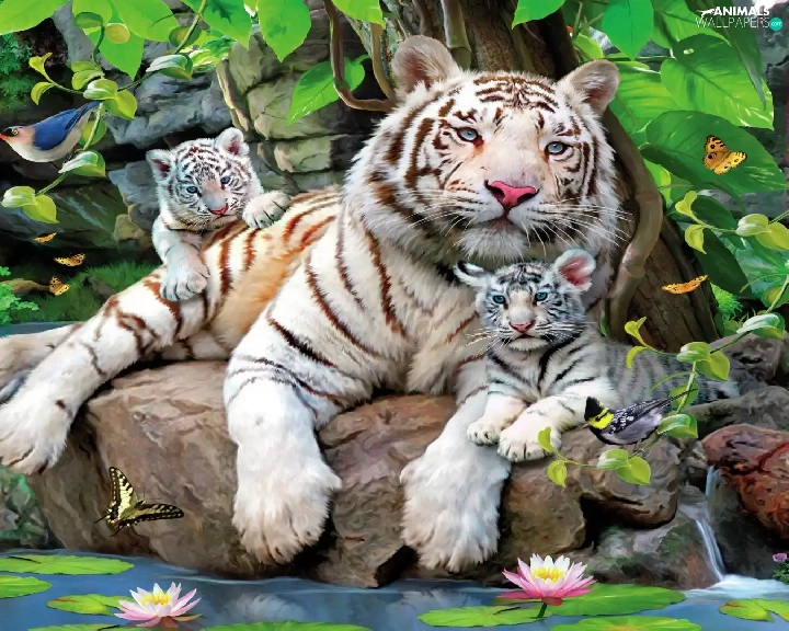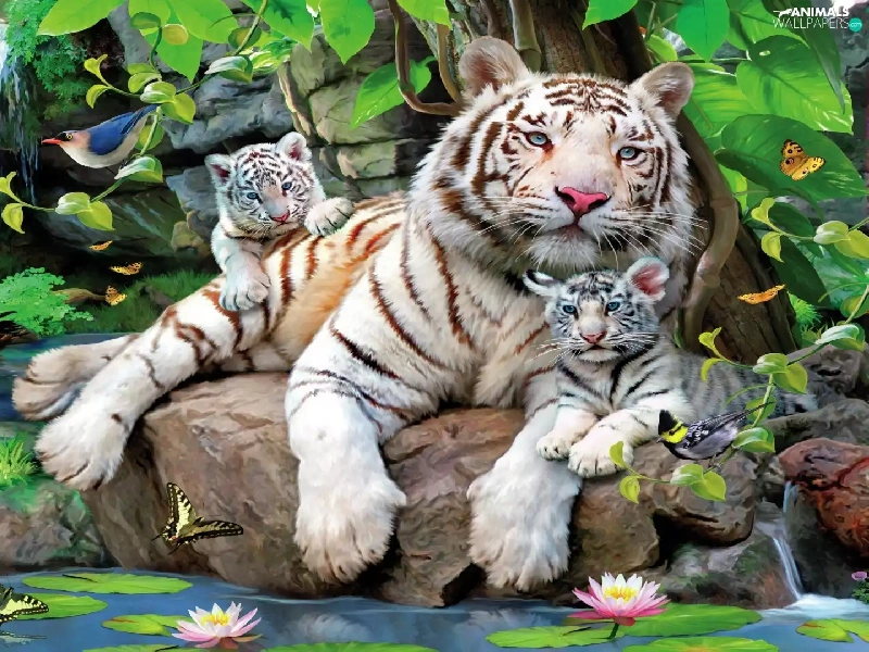 Two cars, White, Stones, VEGETATION, Tigers, tigress