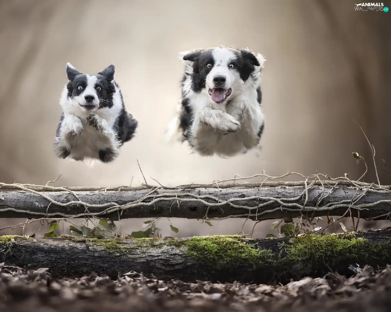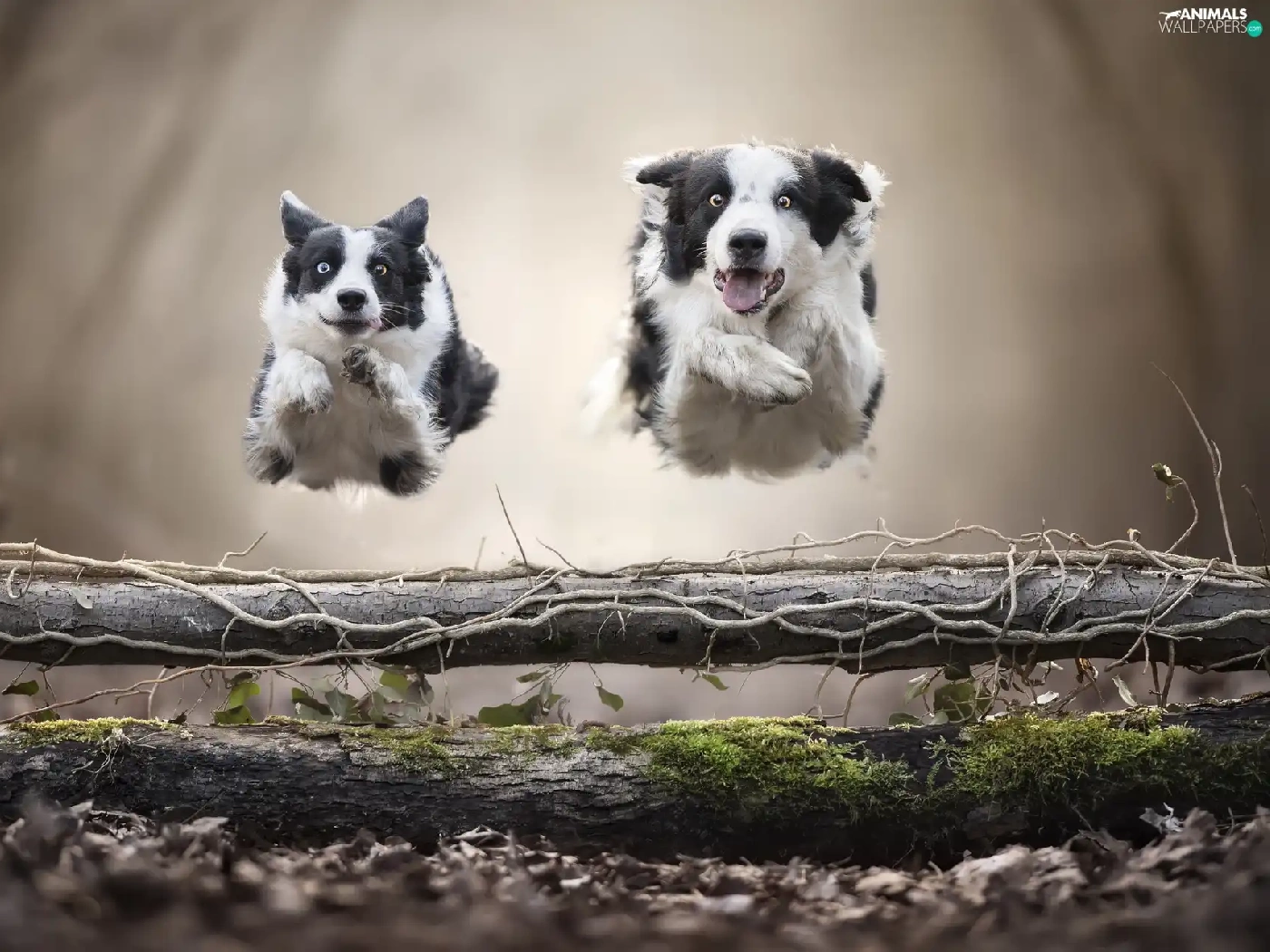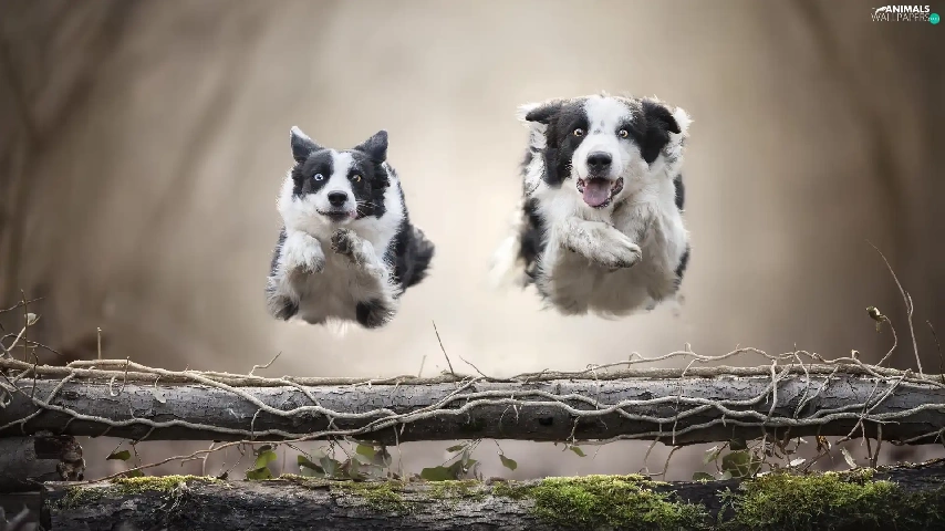 Dogs, Two cars, bar, jump, Border Collie, stretching