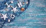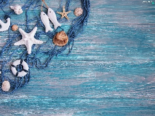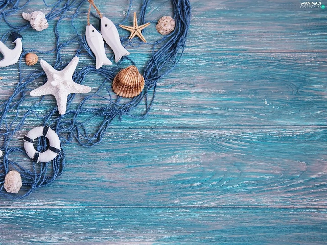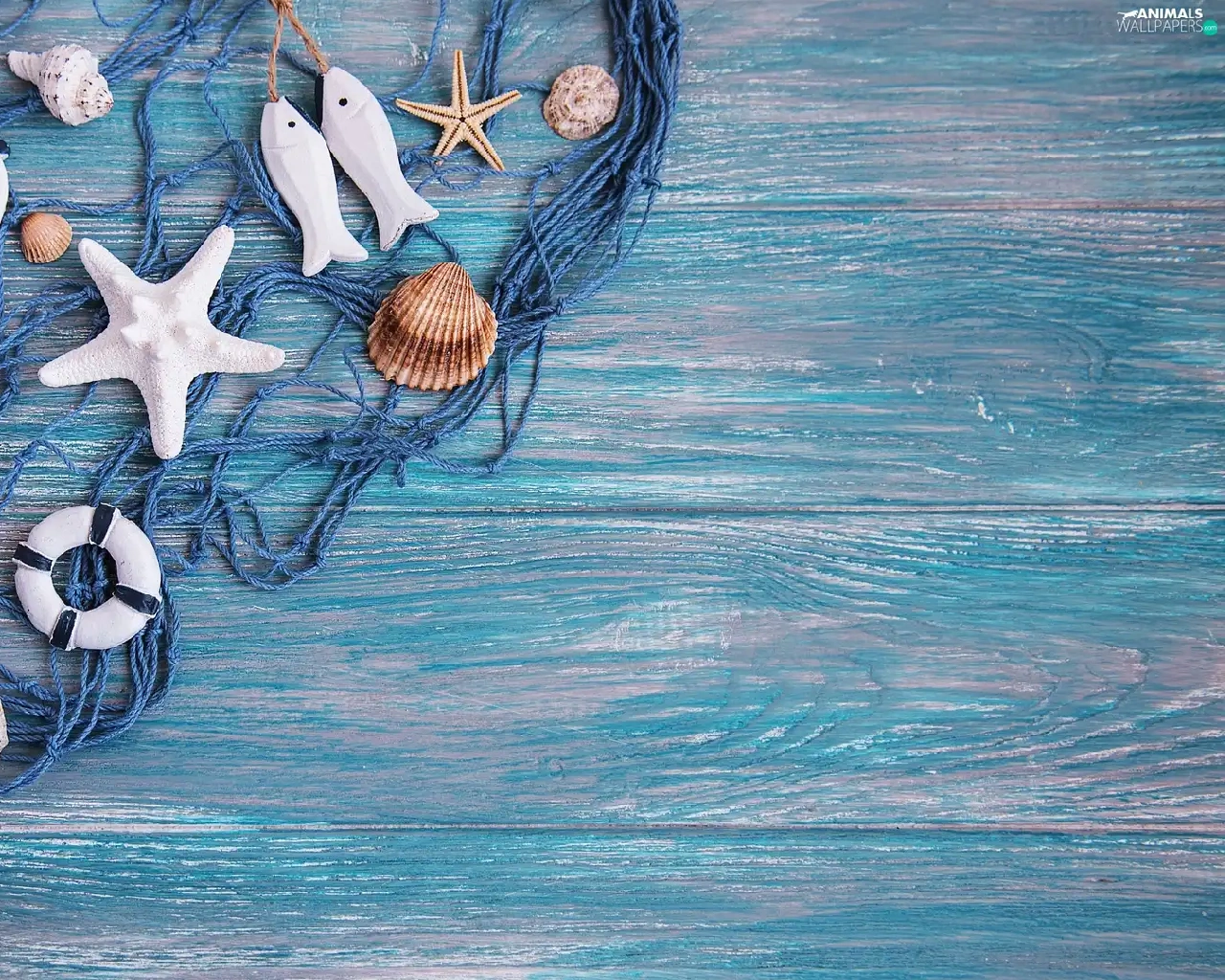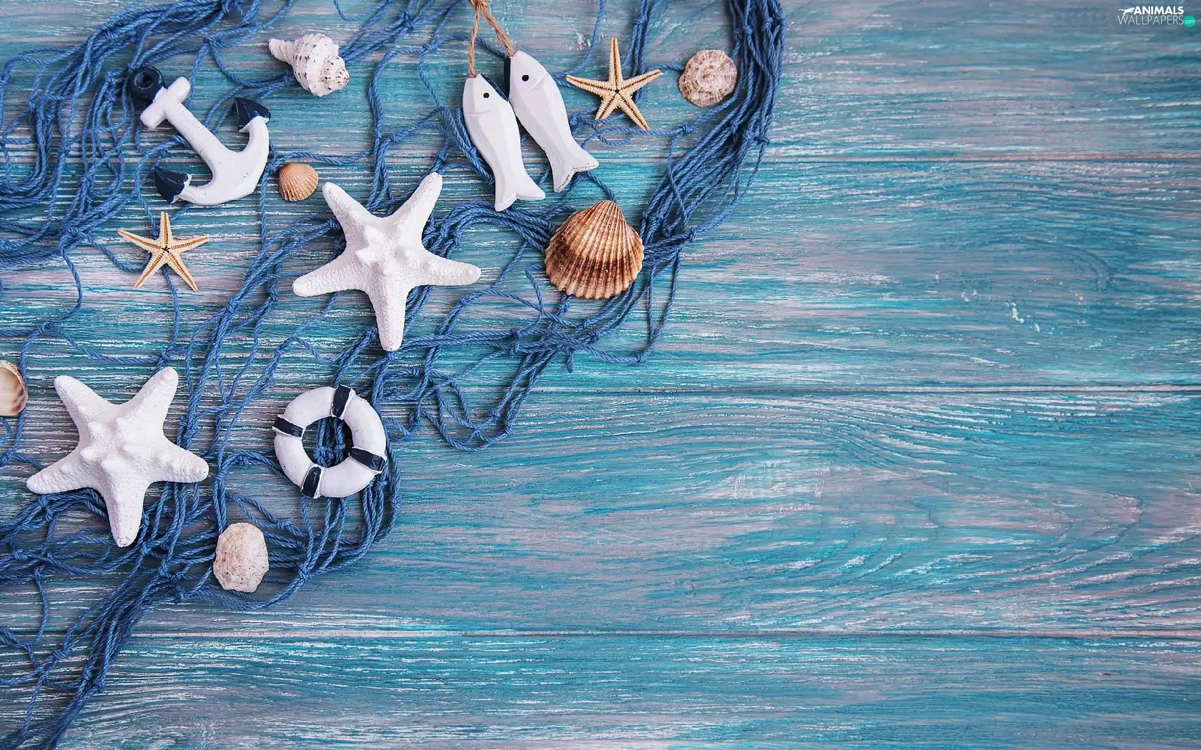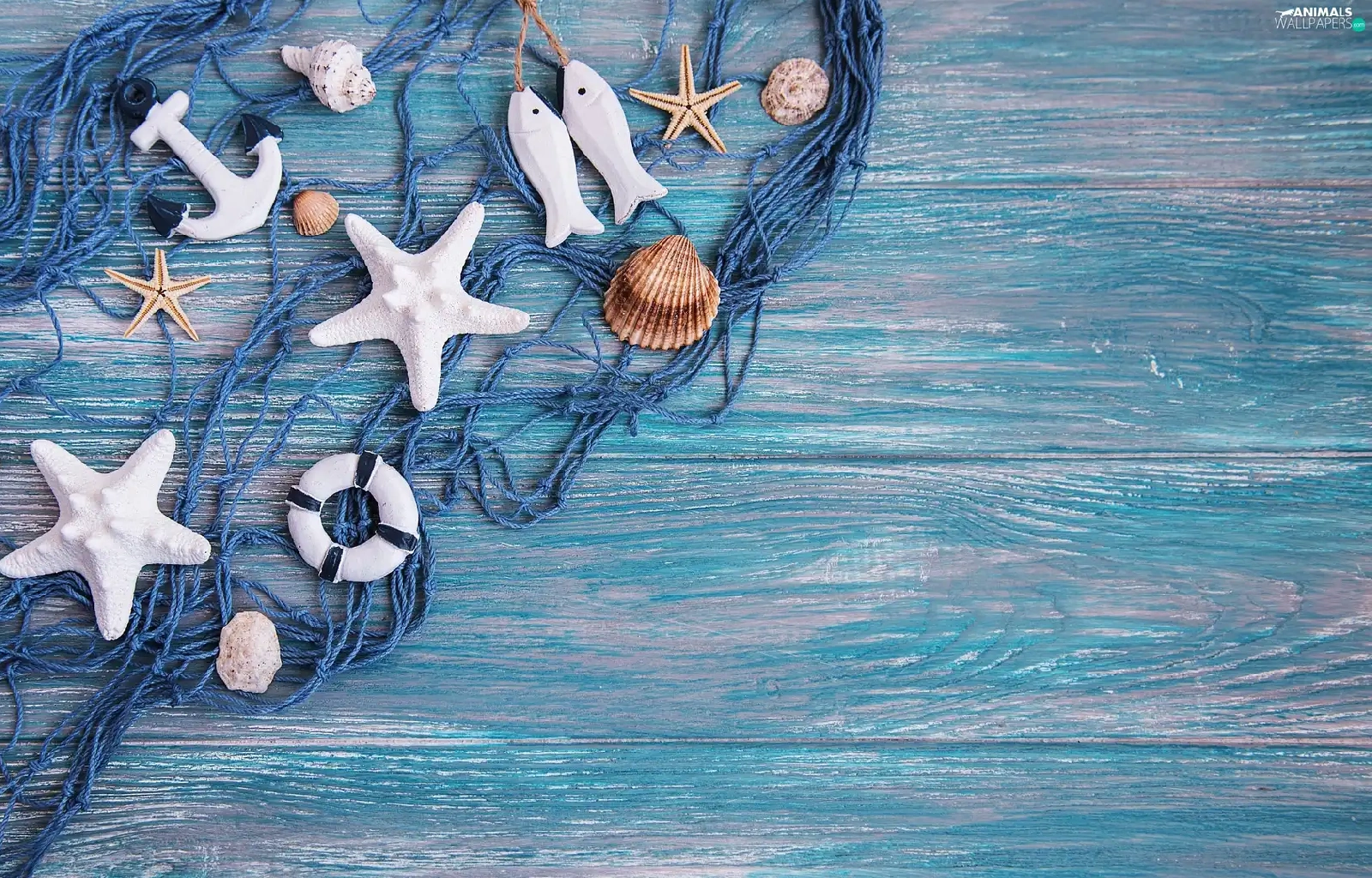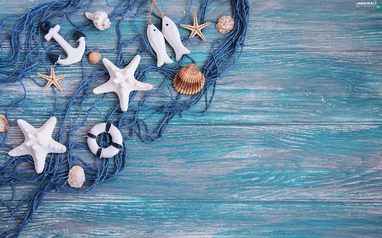 strings, Blue, net, Shells, boarding, composition, anchor, Blue, starfish