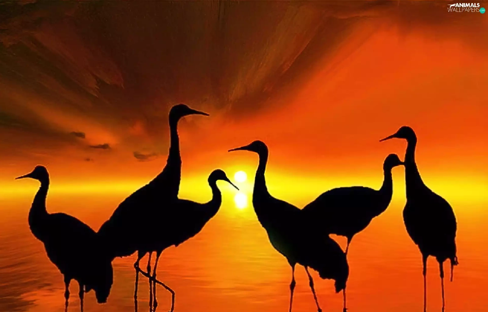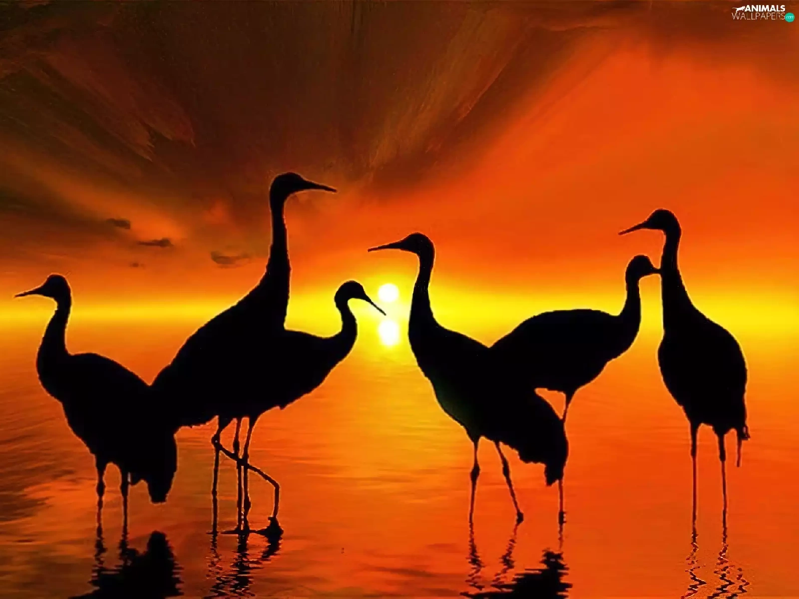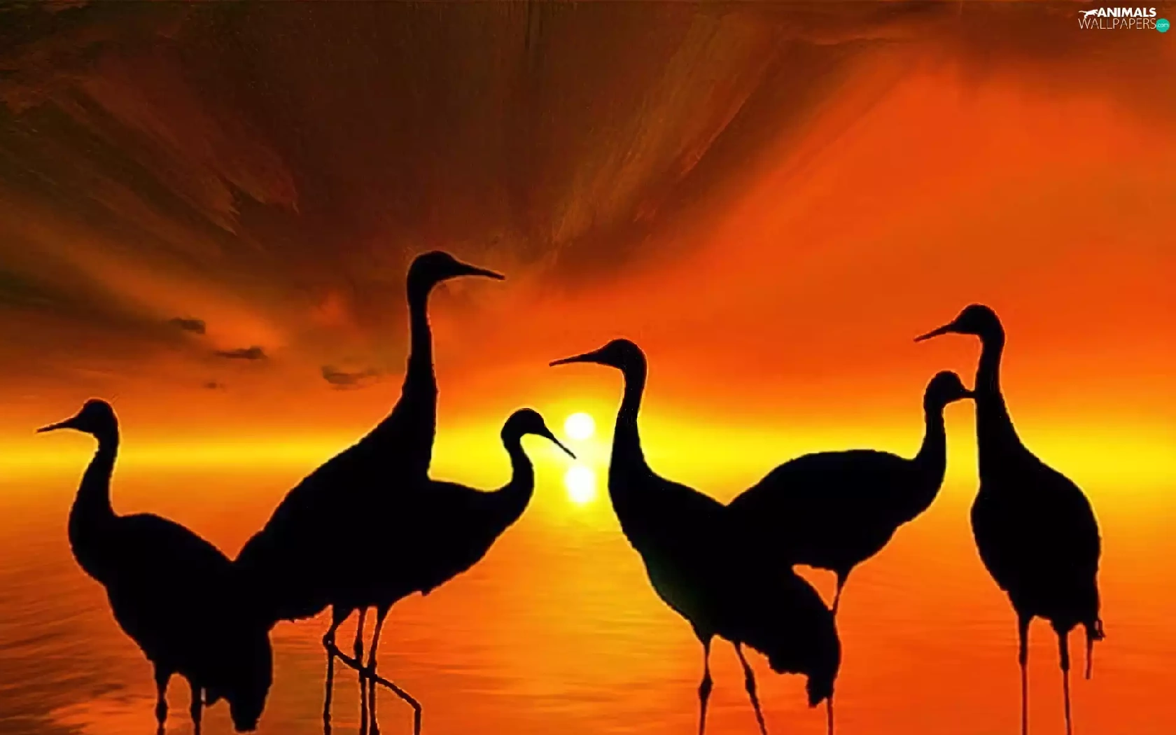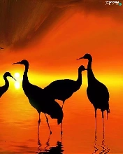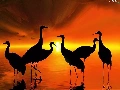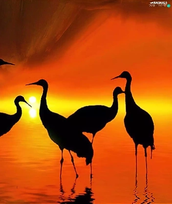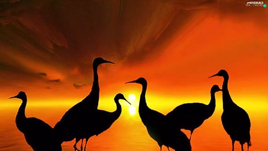 Setting Sun, birds, cranes, silhouettes