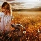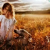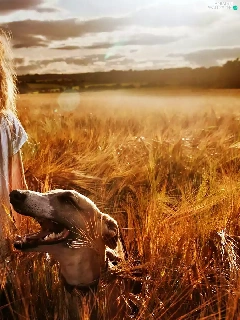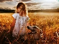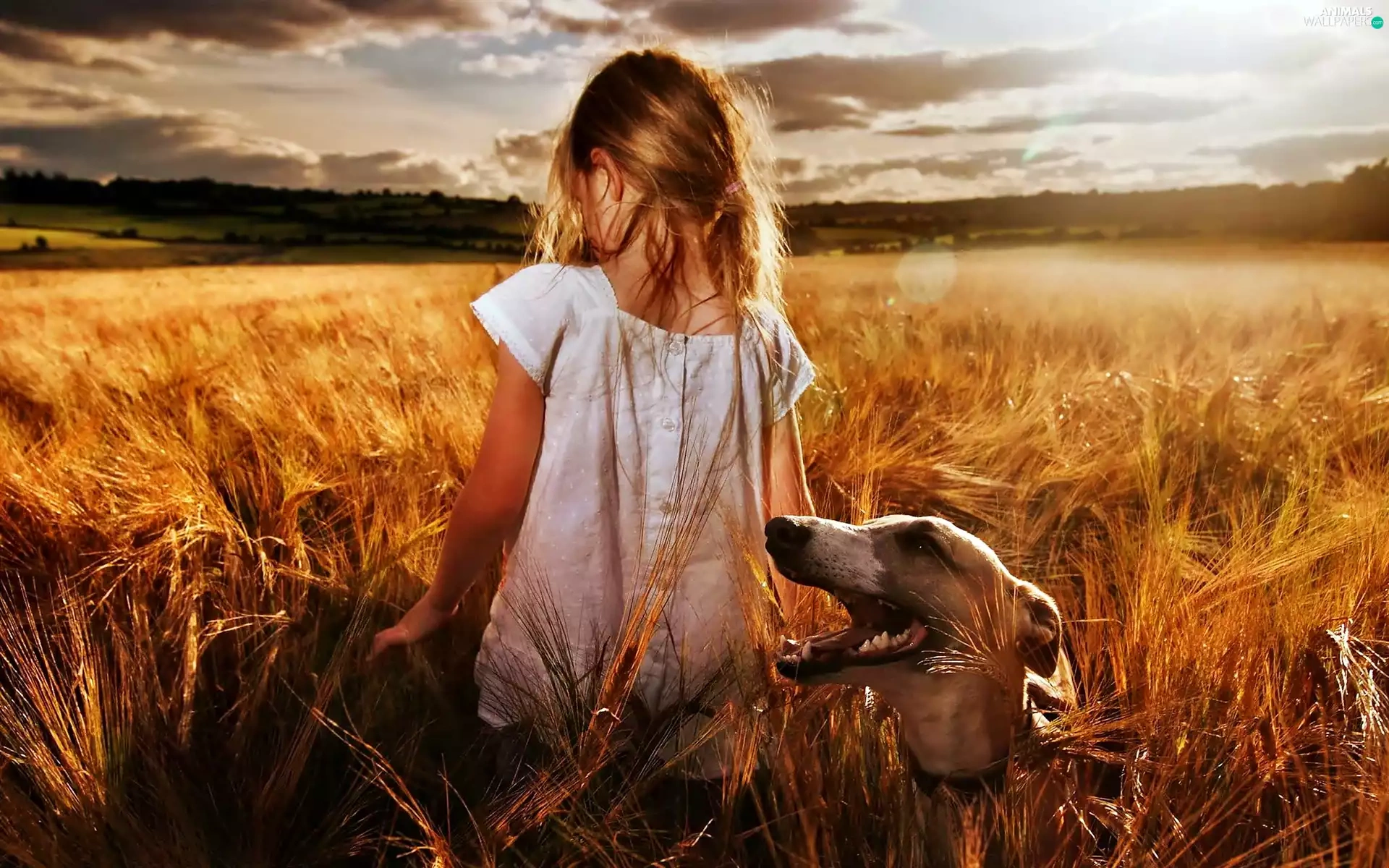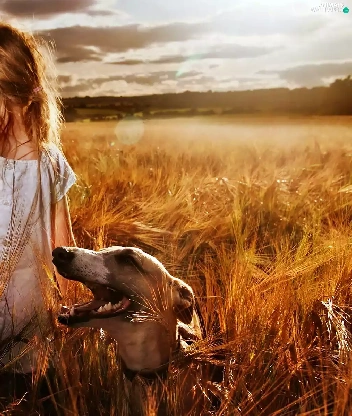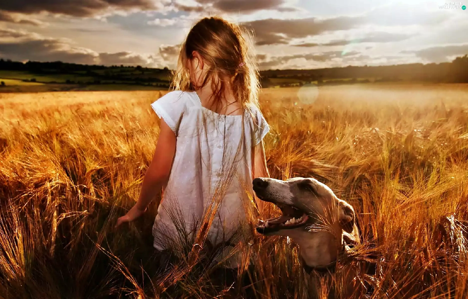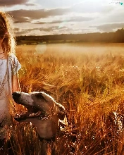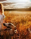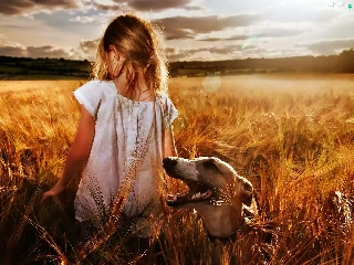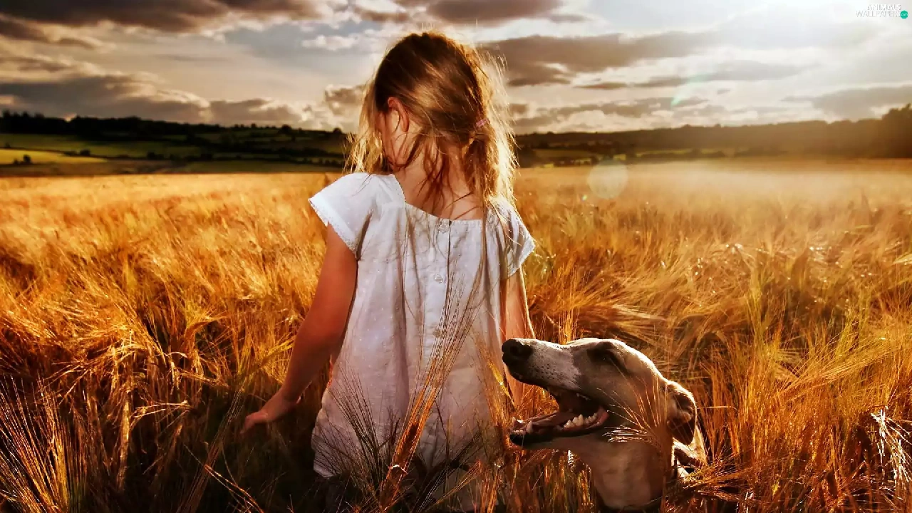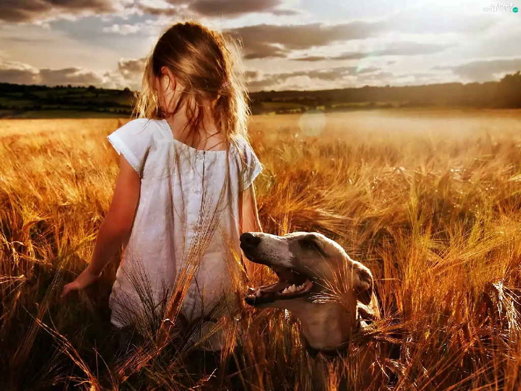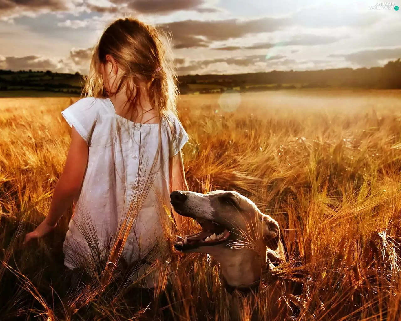 Field, girl, west, sun, clouds, greyhound