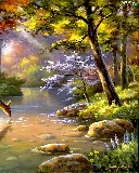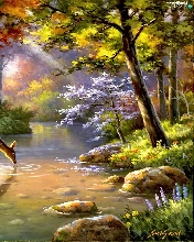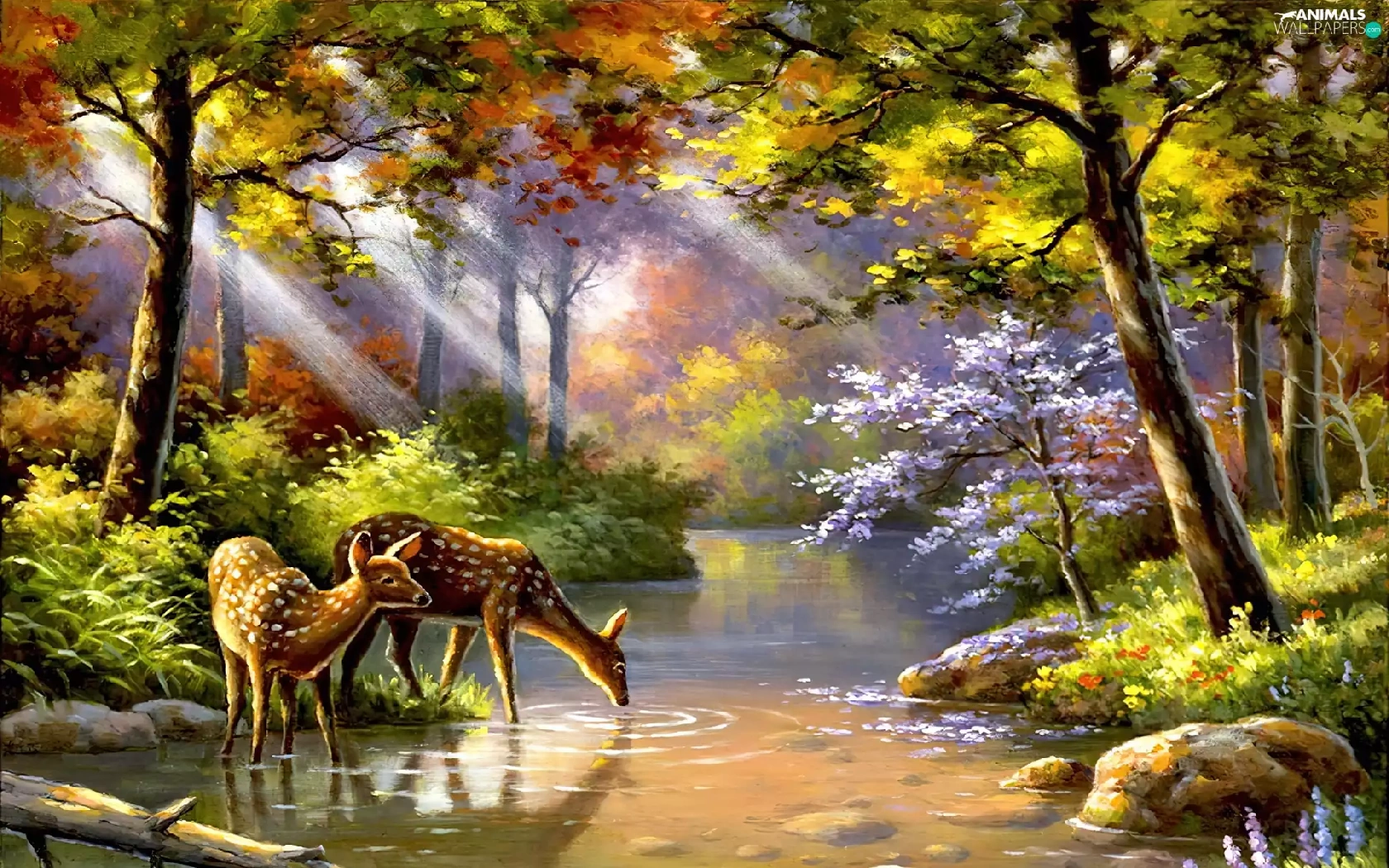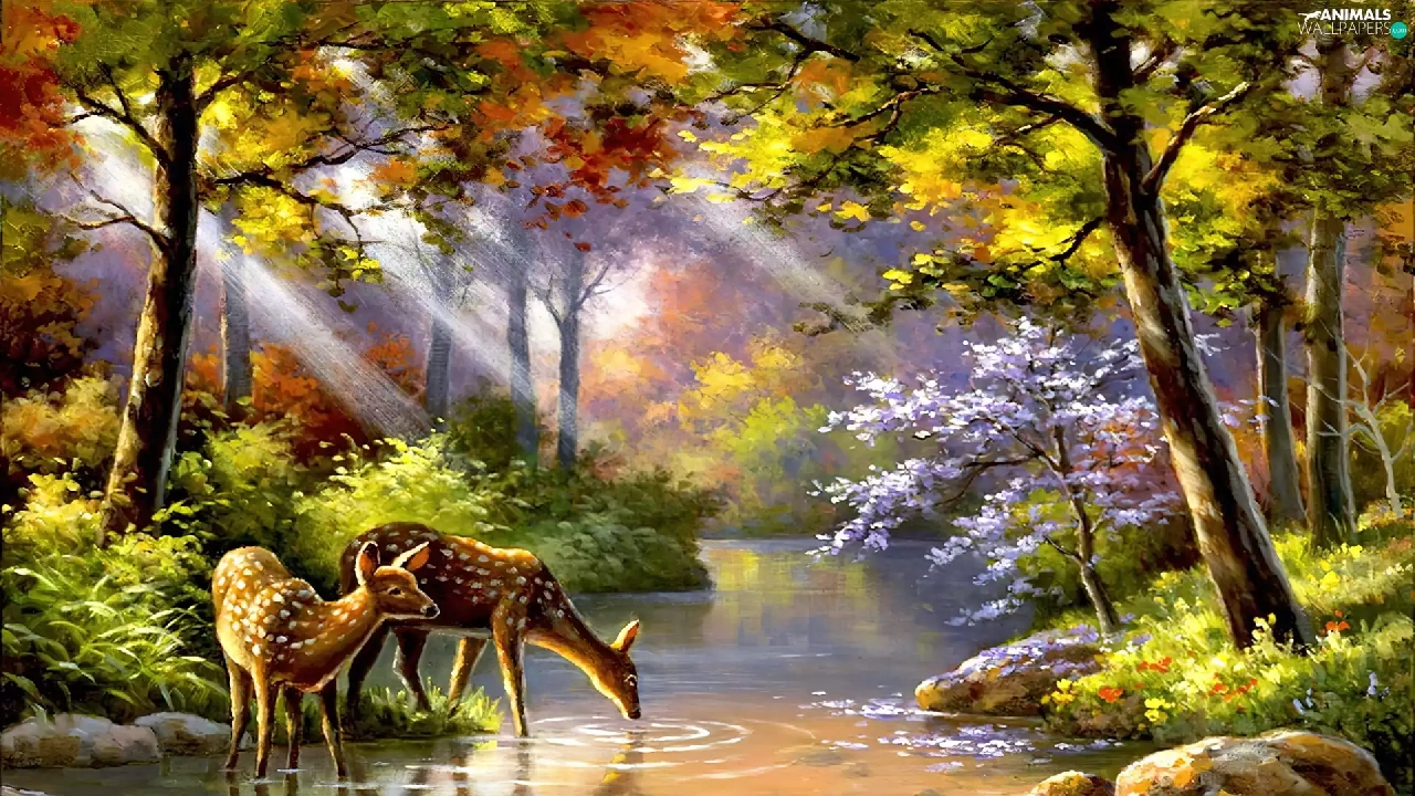 rays, sun, River, deer, forest