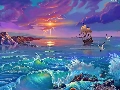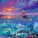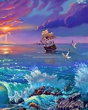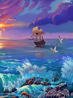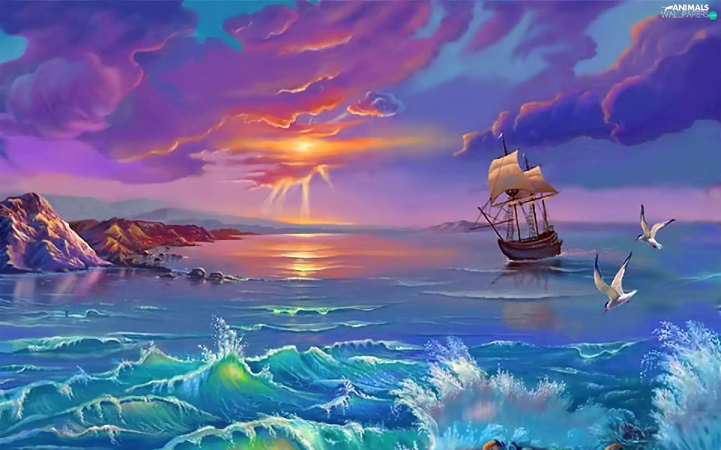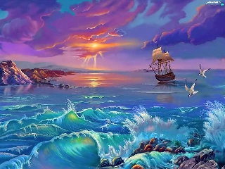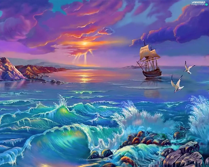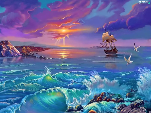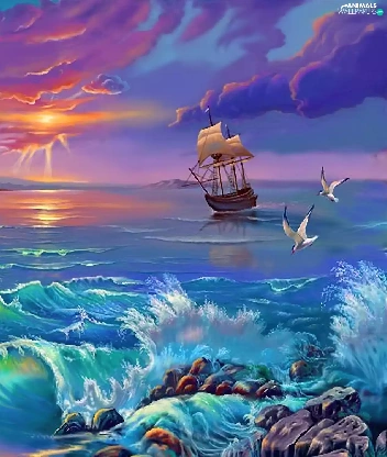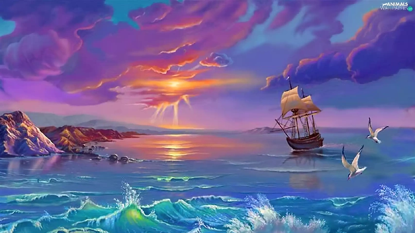 sailing vessel, sea, sun, gulls, west, Waves