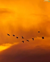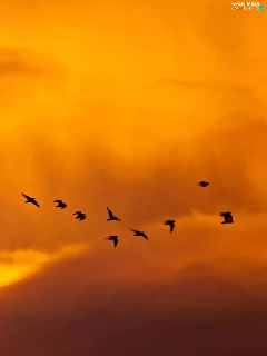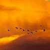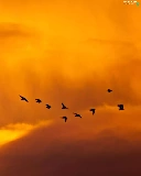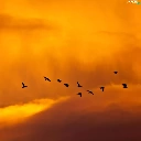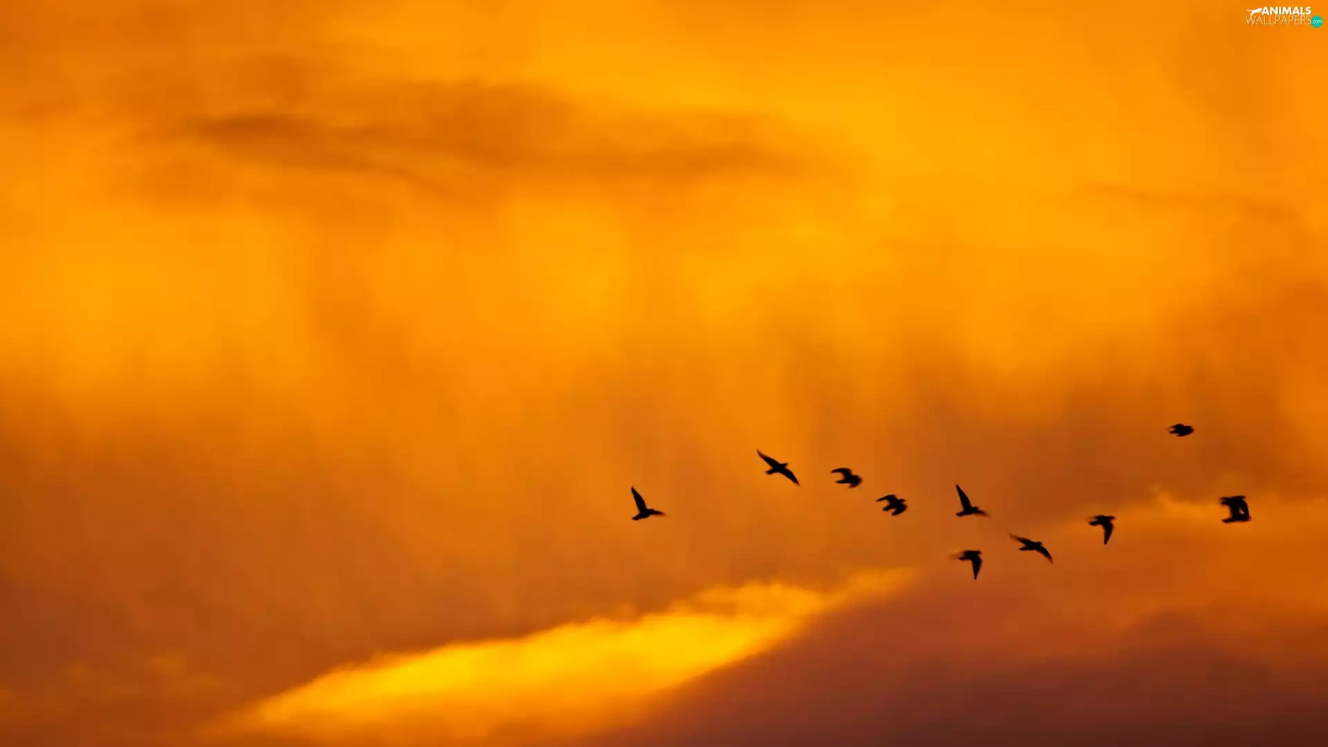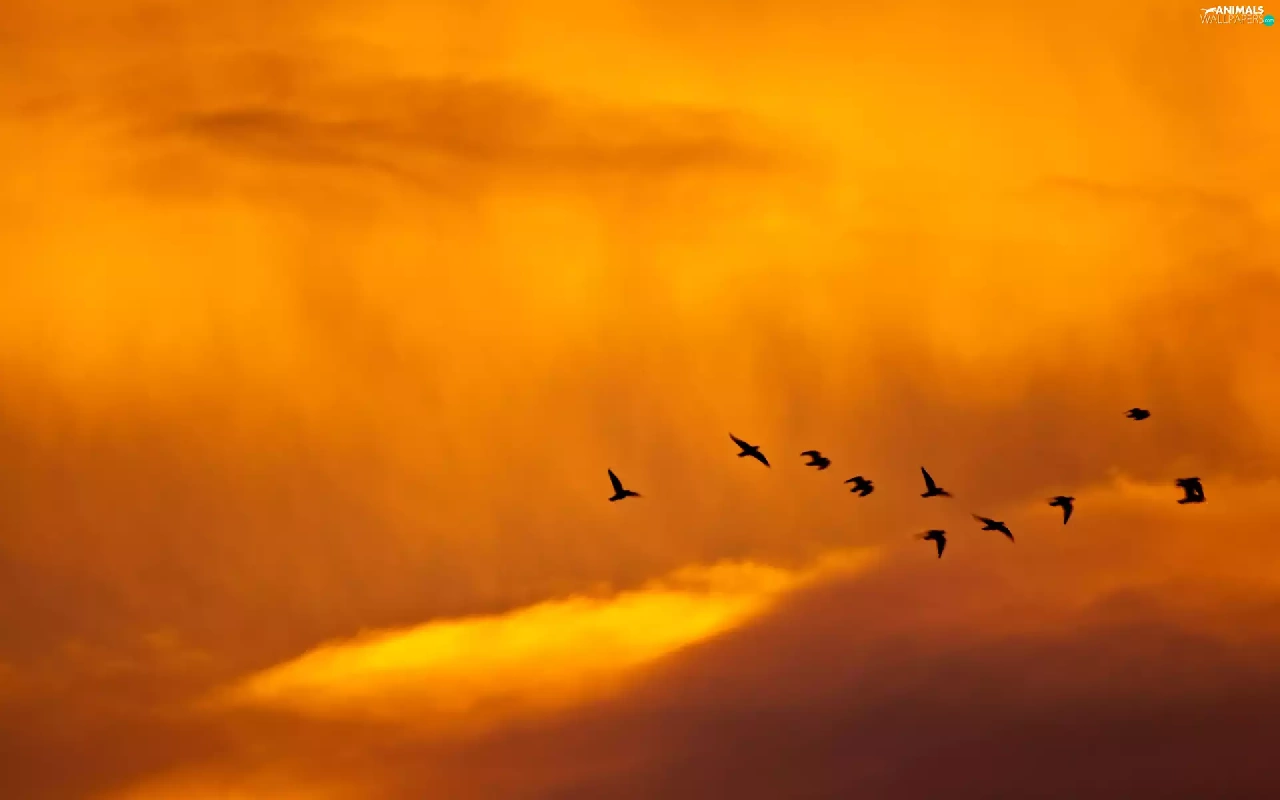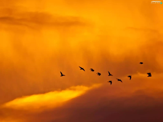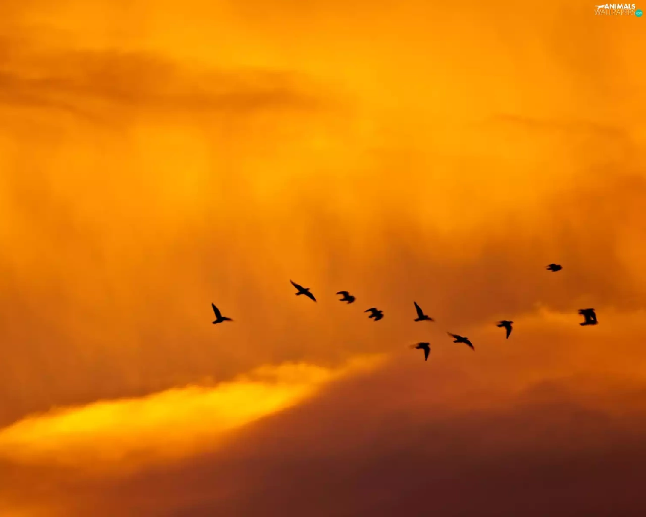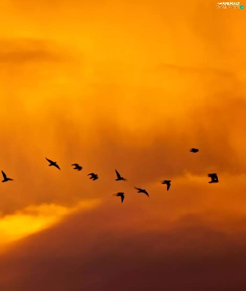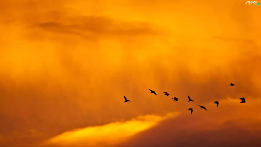 west, clouds, birds, sun