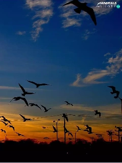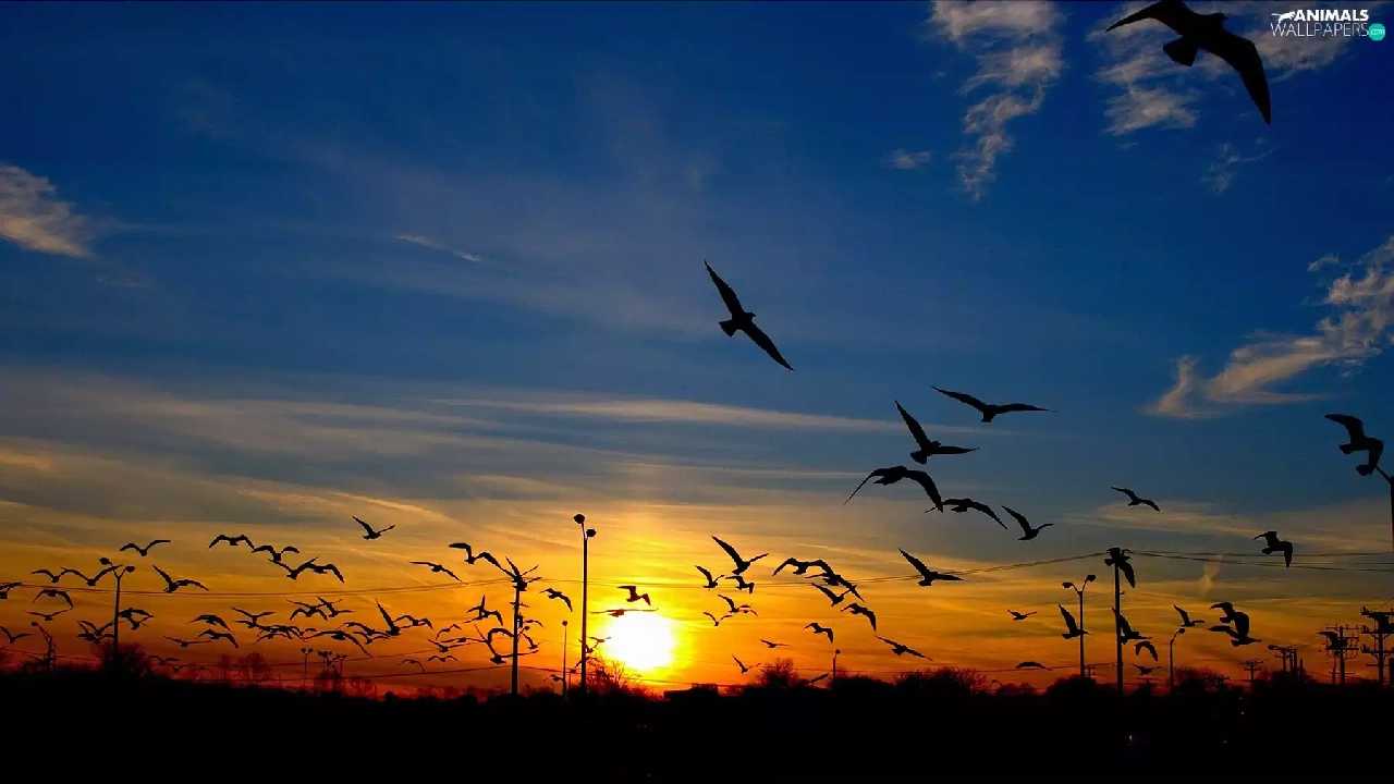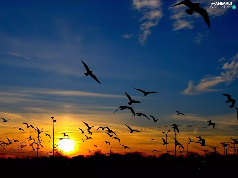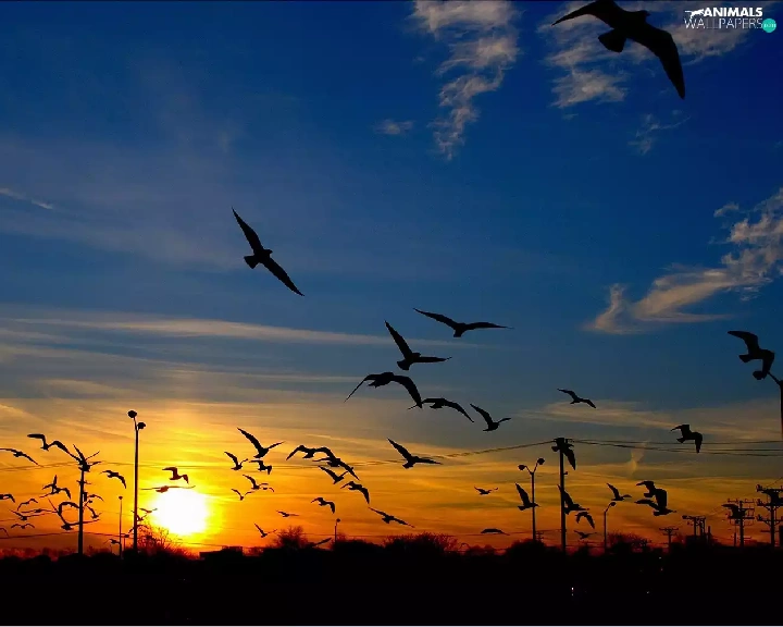west, Sky, birds, sun