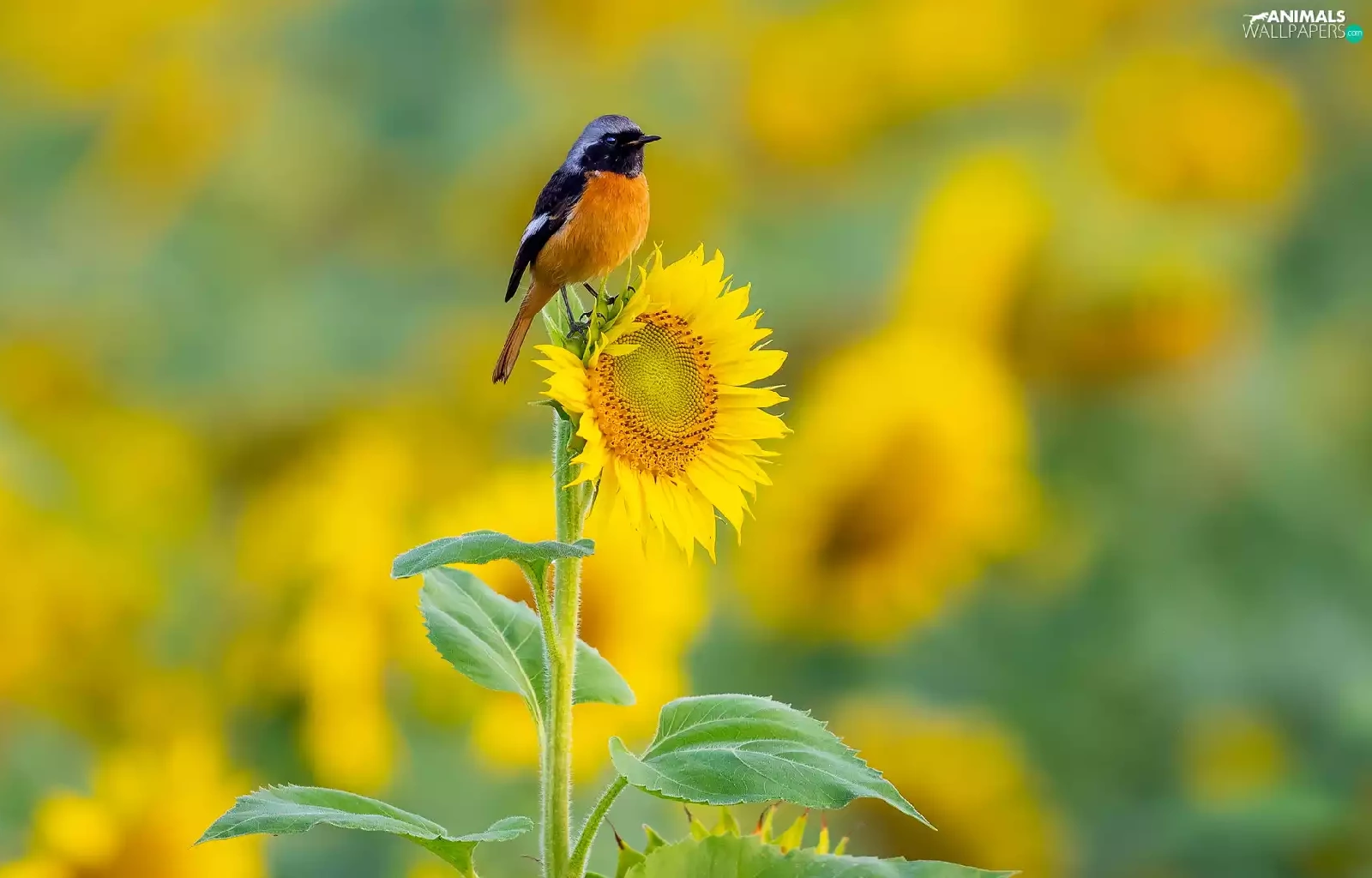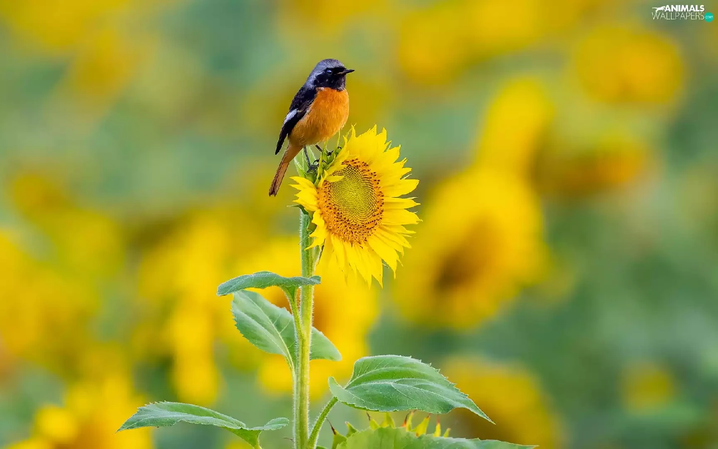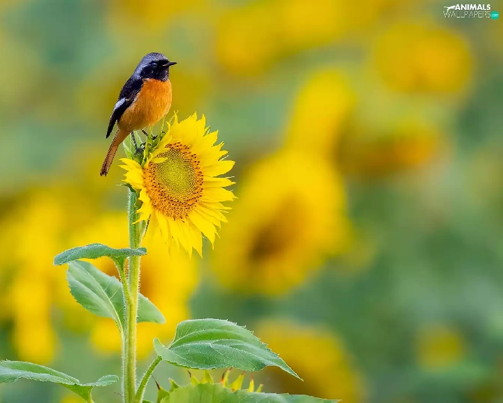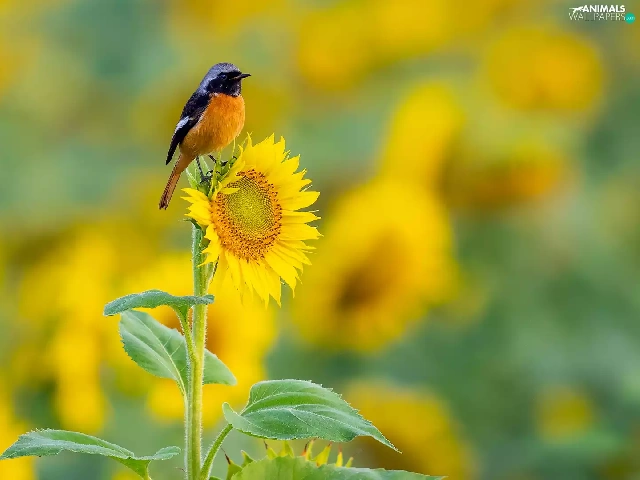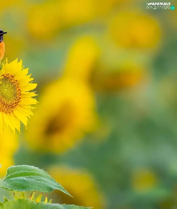 Bird, Colourfull Flowers, Sunflower, Redstart Chinese