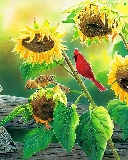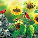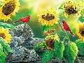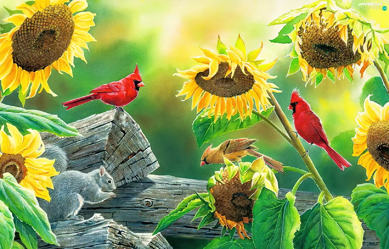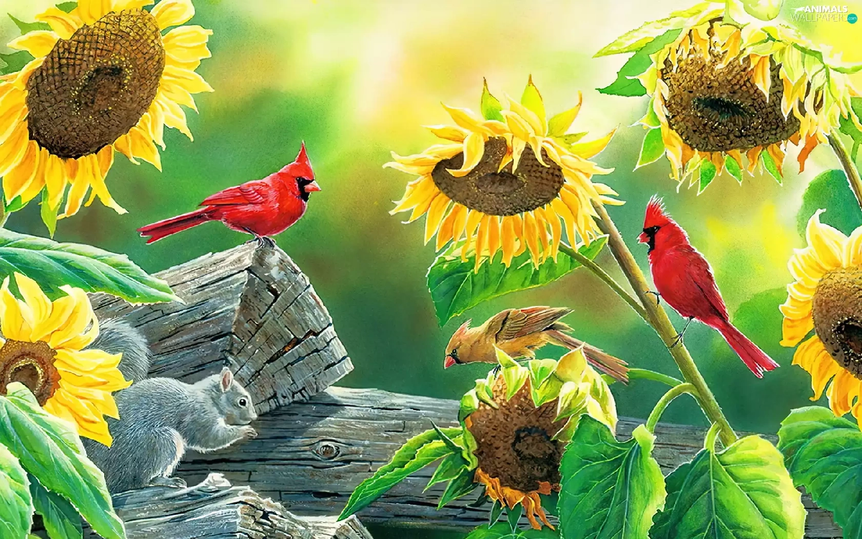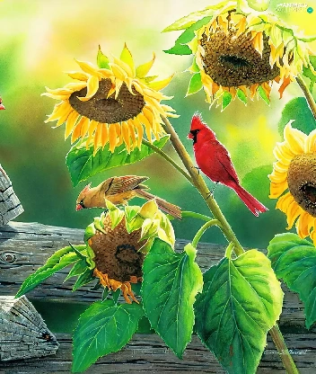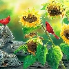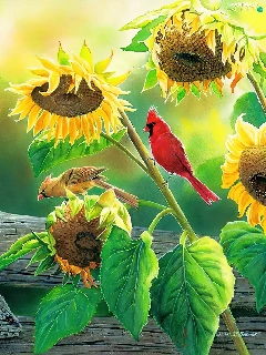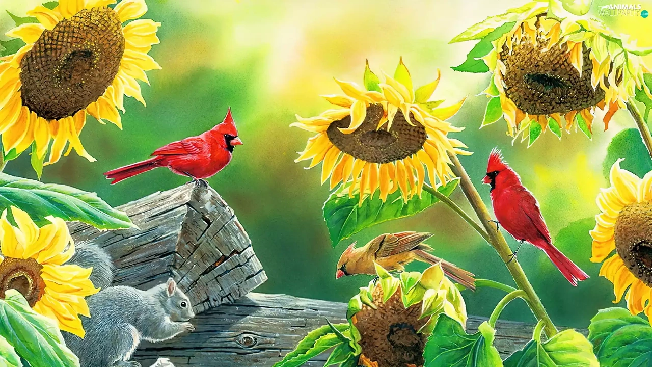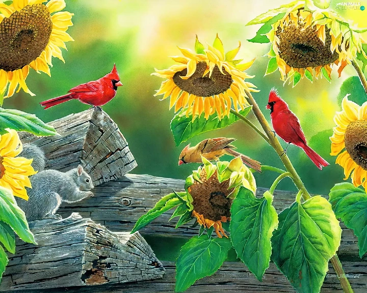 Nice sunflowers, Cardinals, squirrel, birds