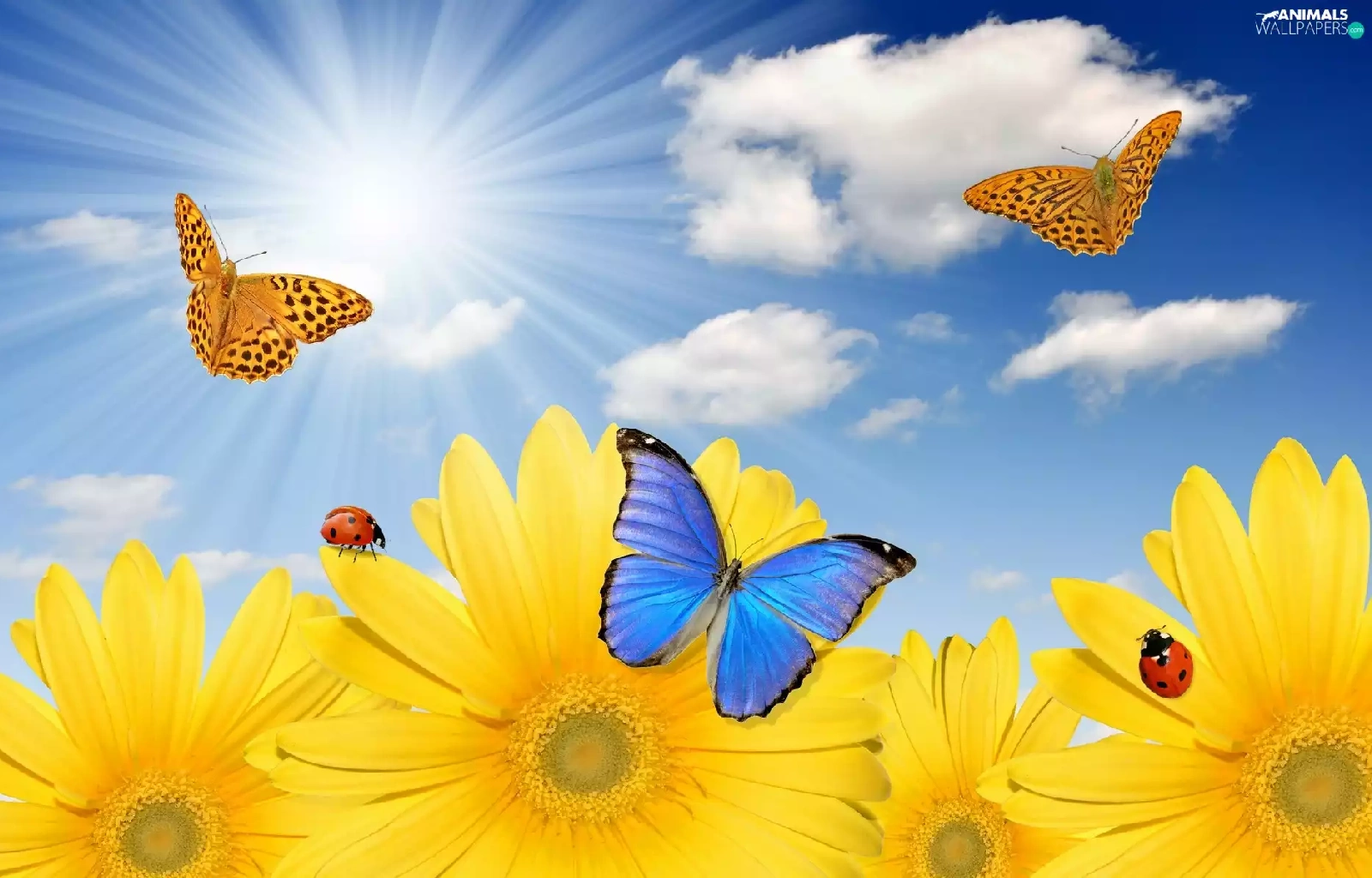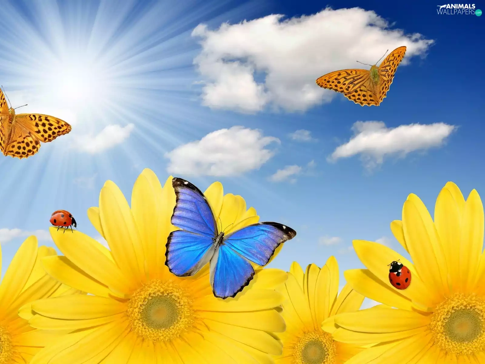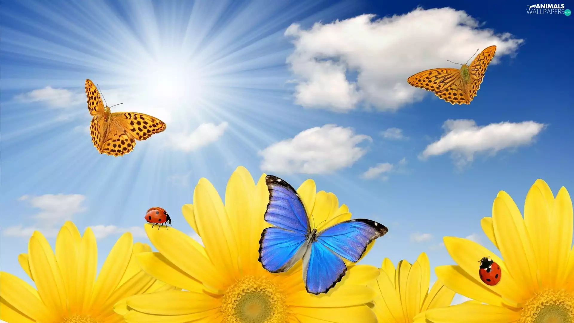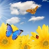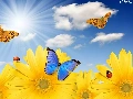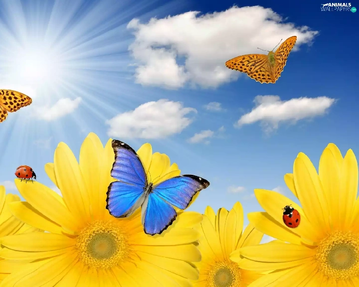 rays, sun, Nice sunflowers, butterflies, Meadow