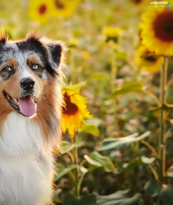 dog, tongue, Nice sunflowers, Australian Shepherd