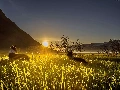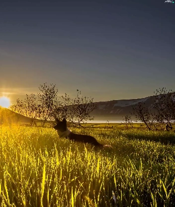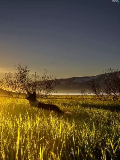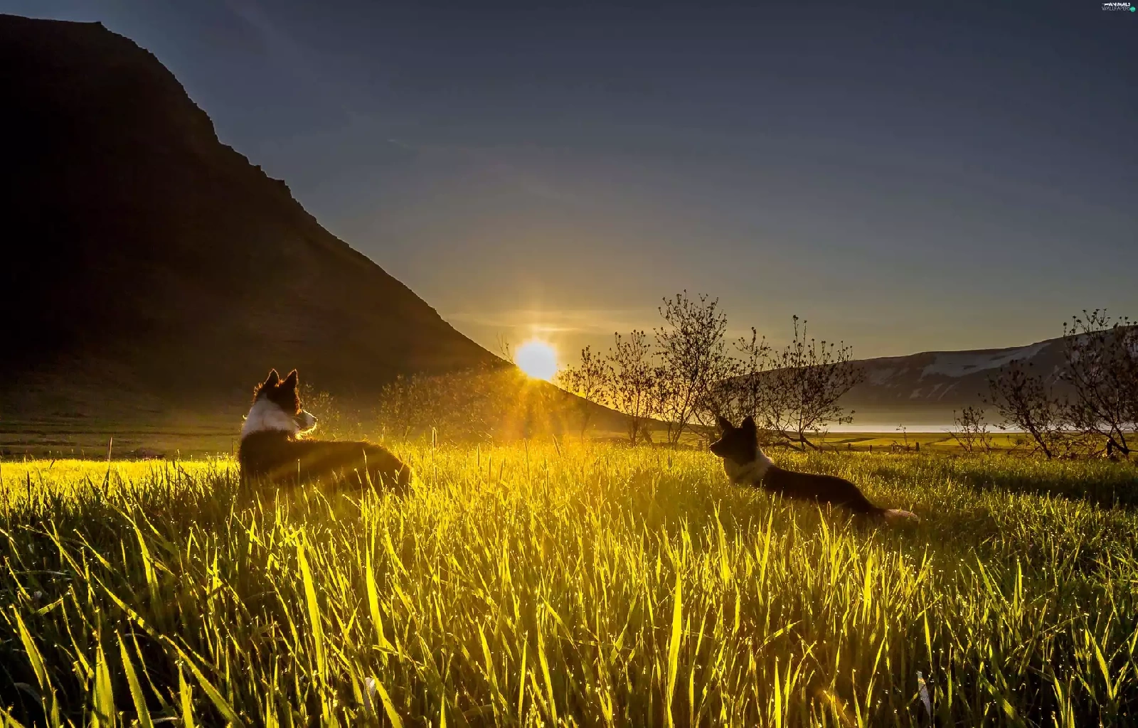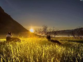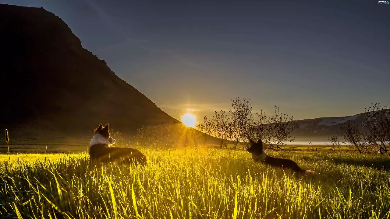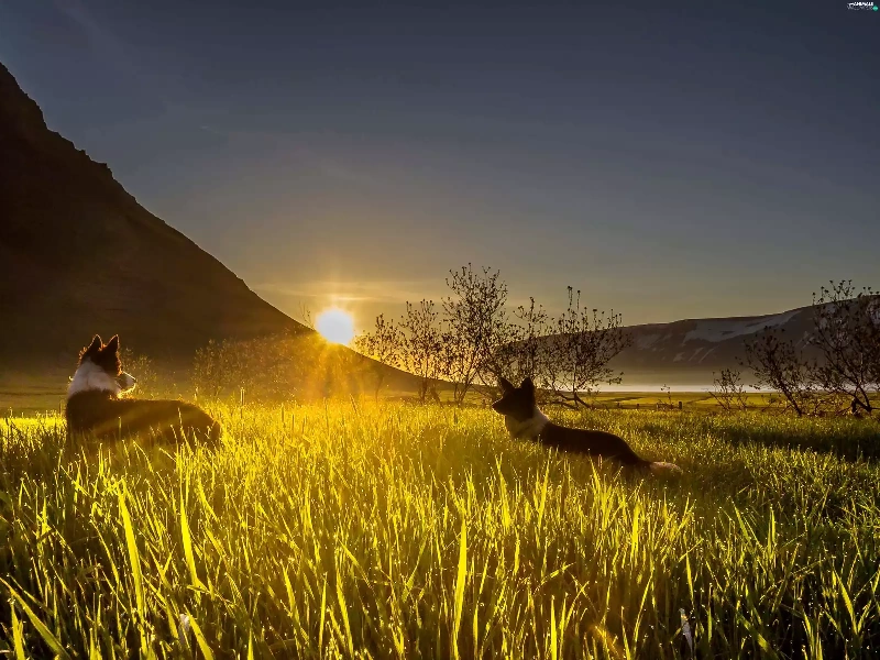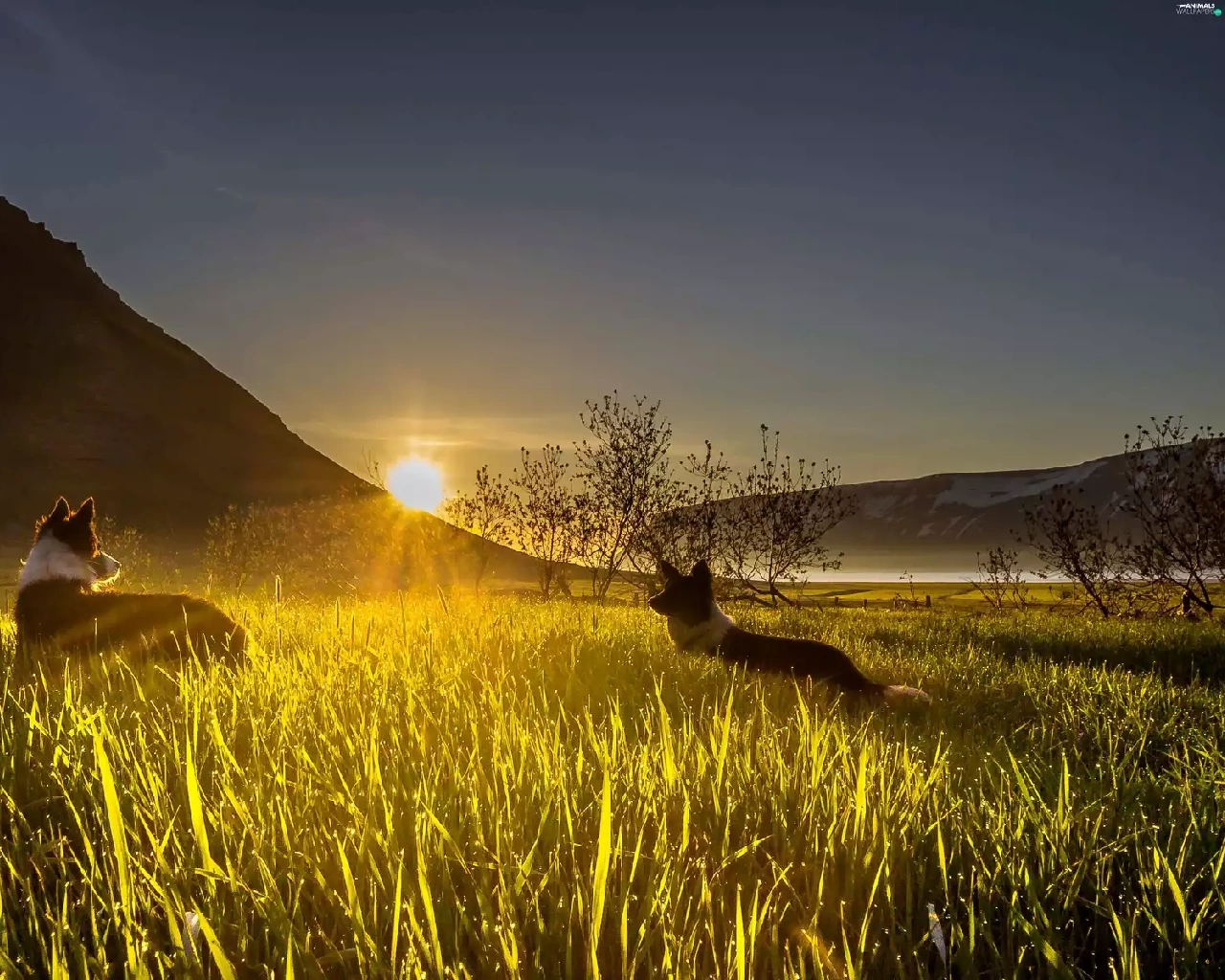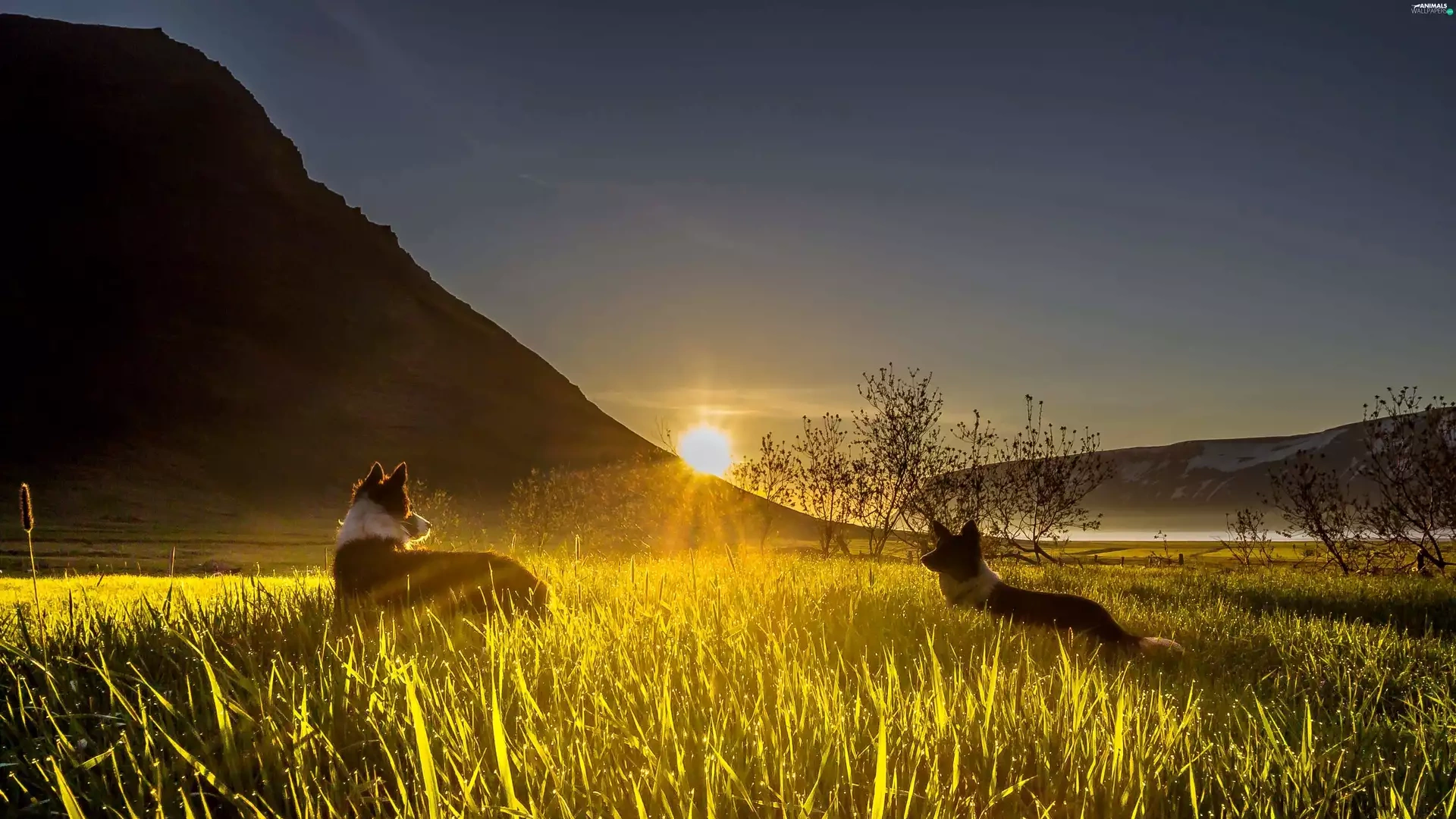 grass, mountains, dawn, Sunrise, Dogs, Valley