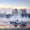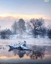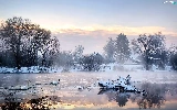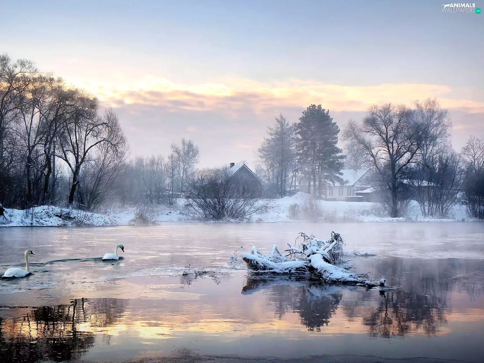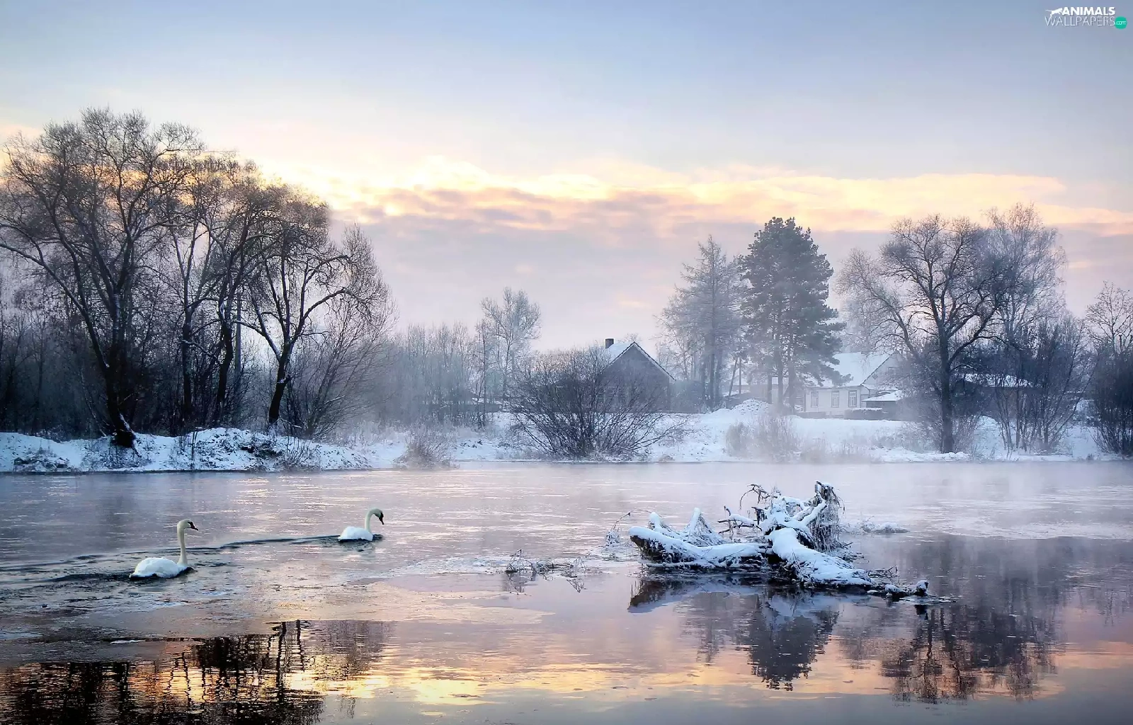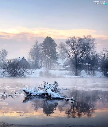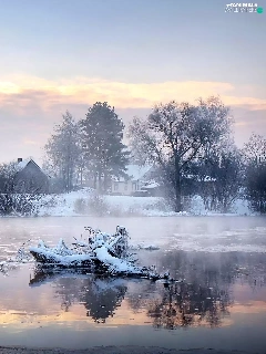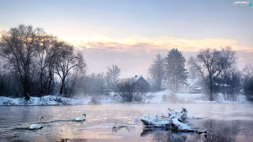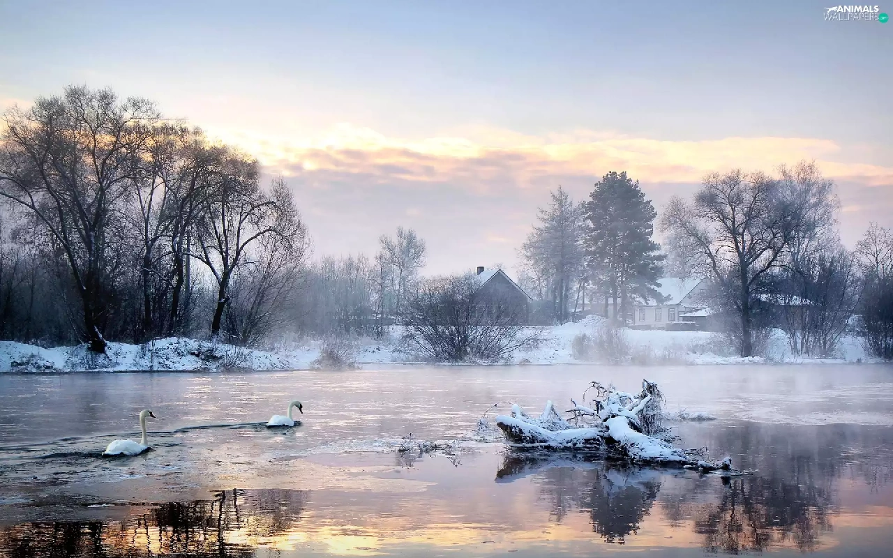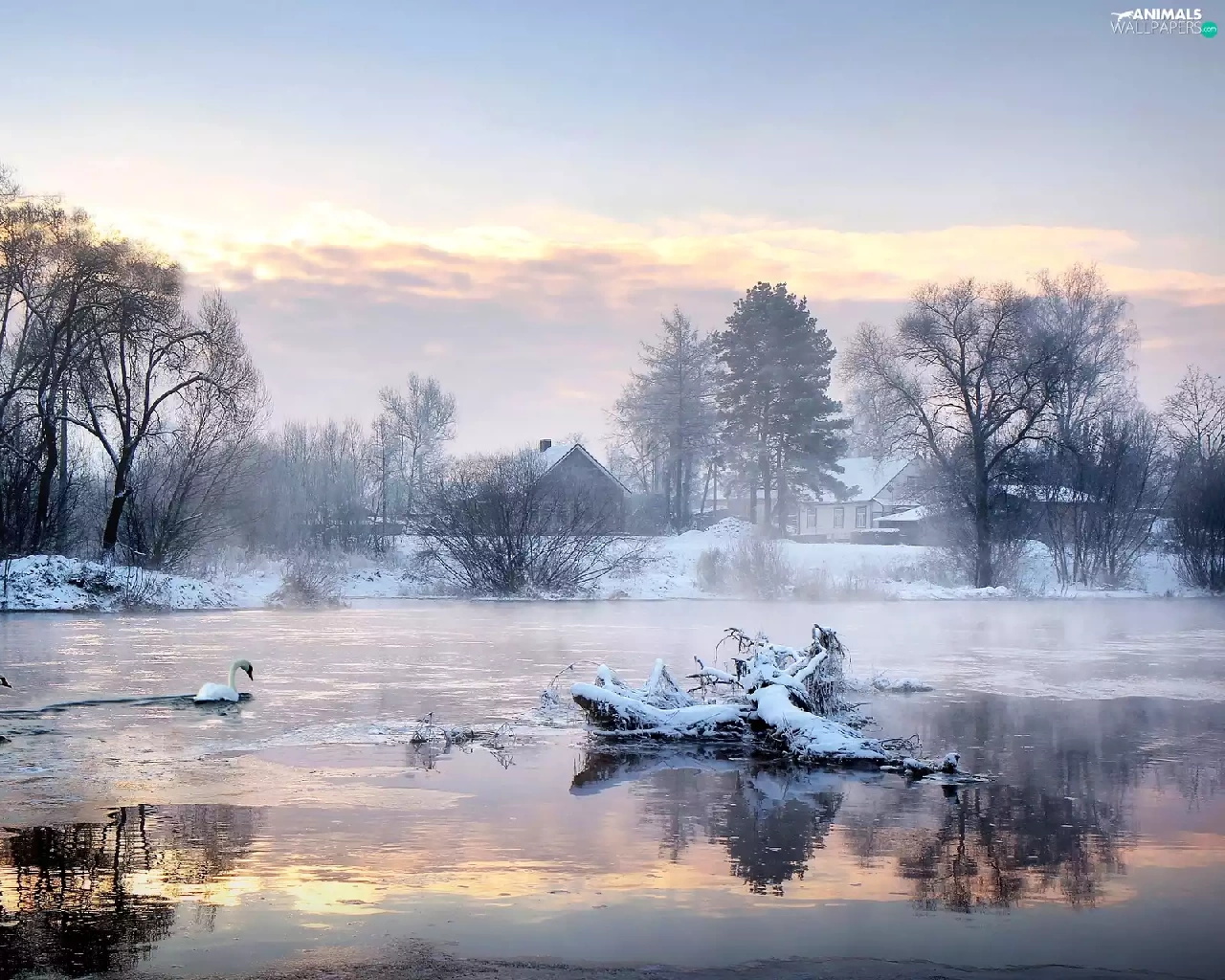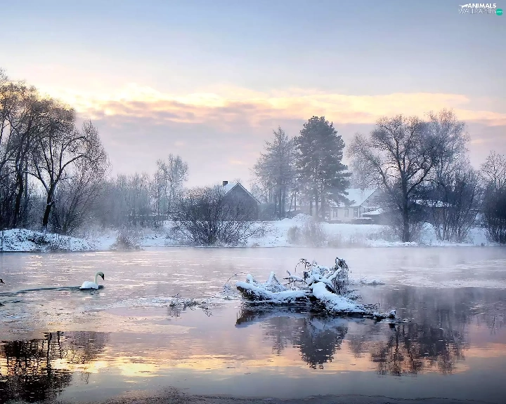 viewes, Swan, snow, trees, lake