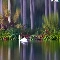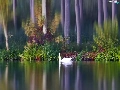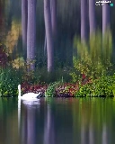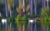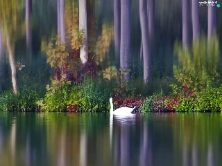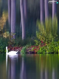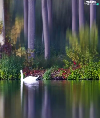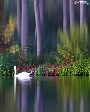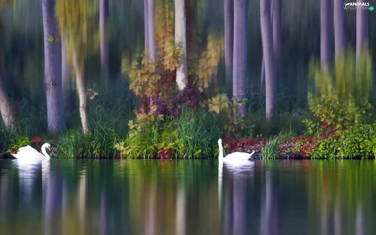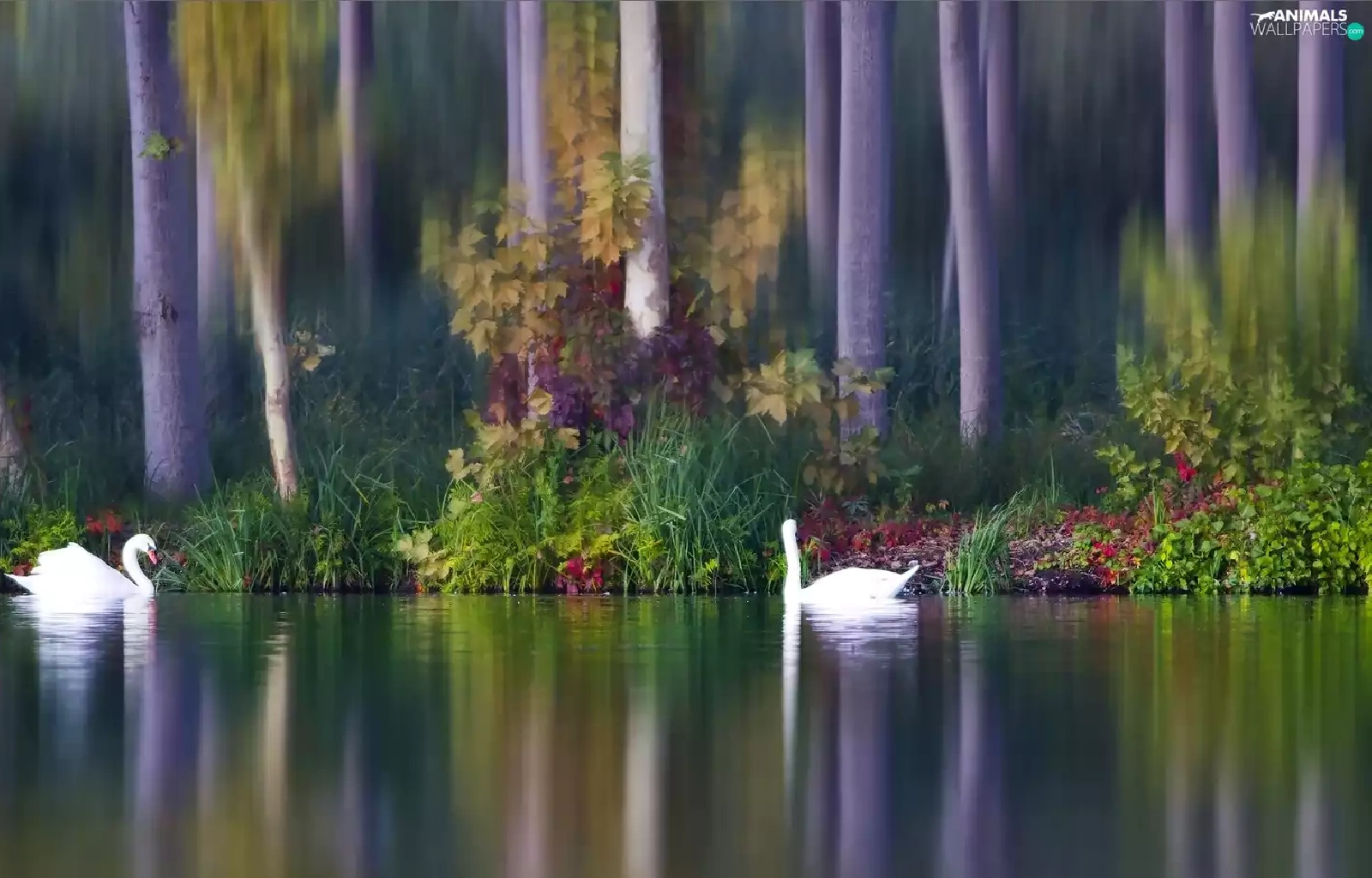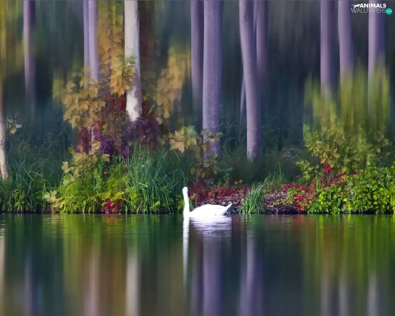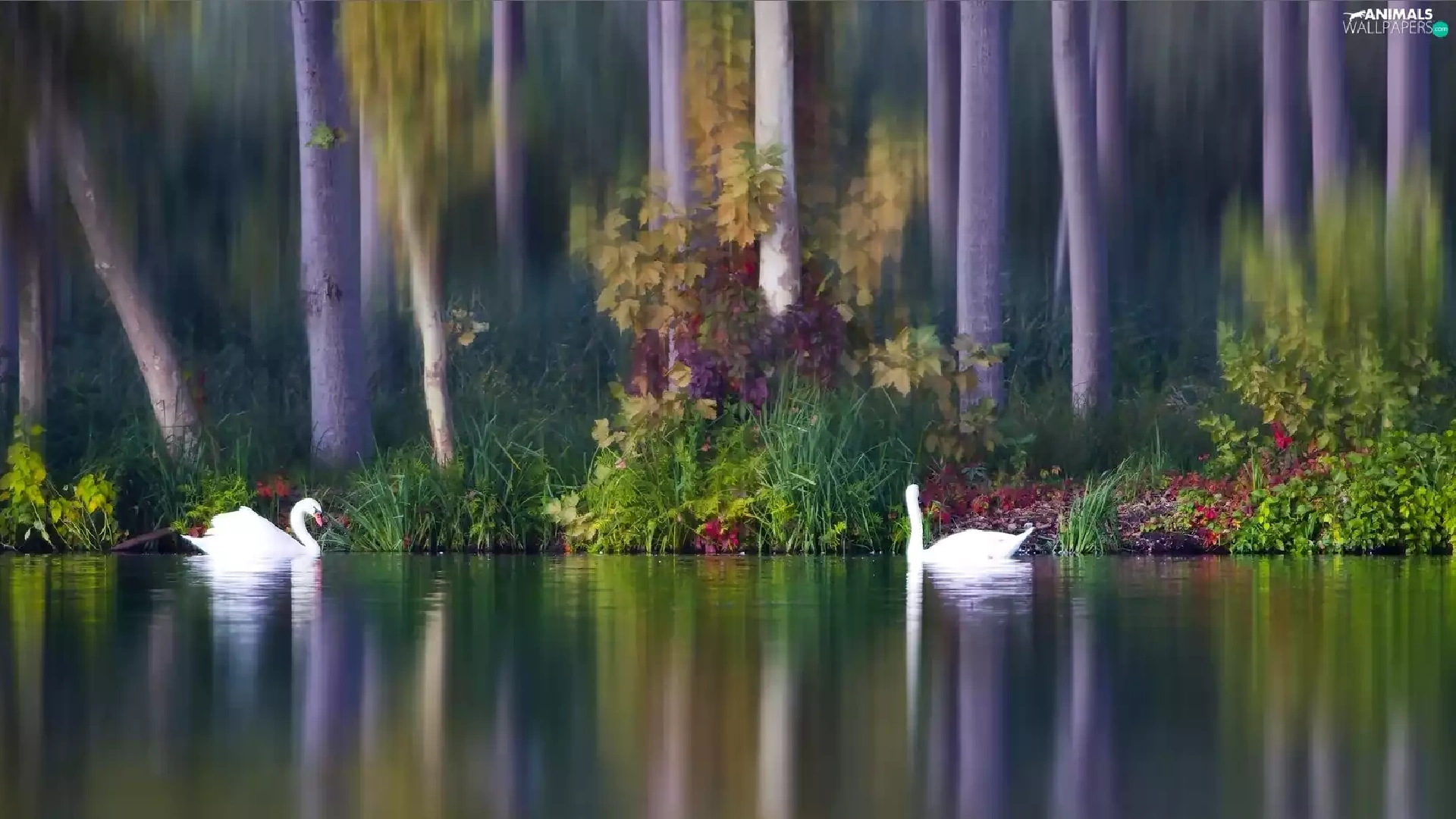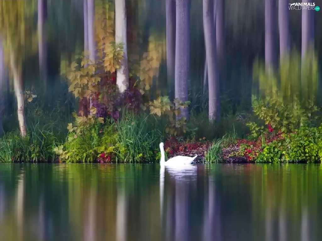 Bush, trees, Two cars, viewes, autumn, lake, Swan