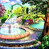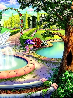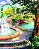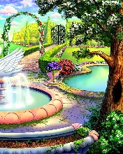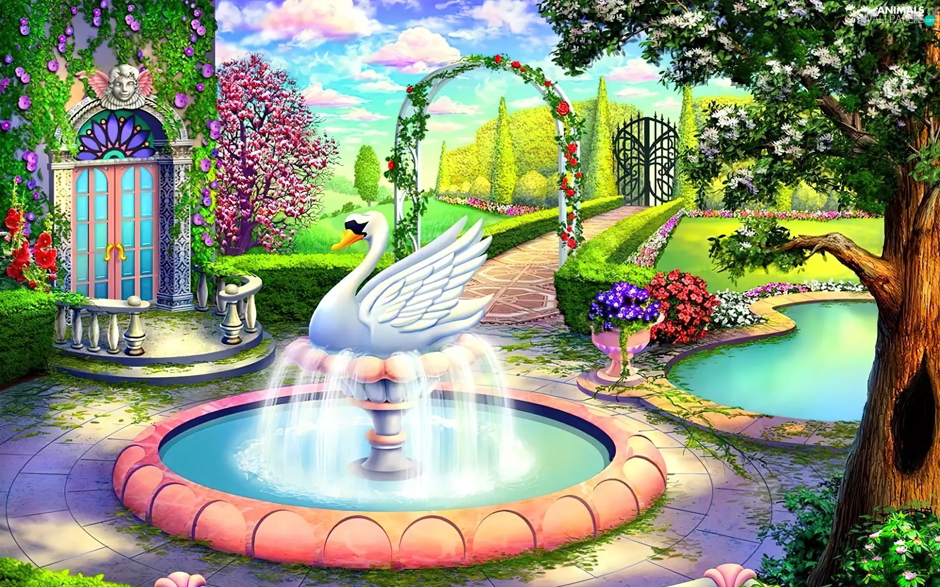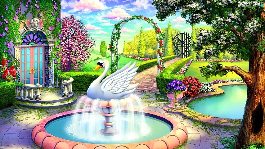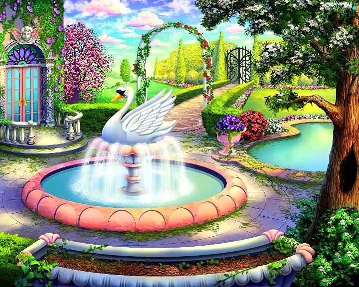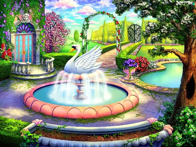 fountain, house, Garden, Swans