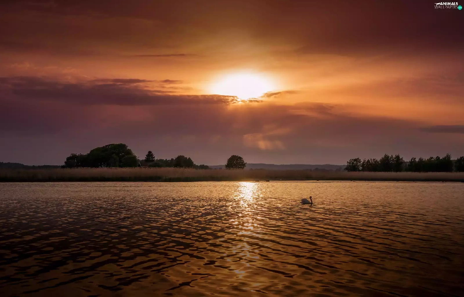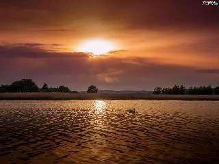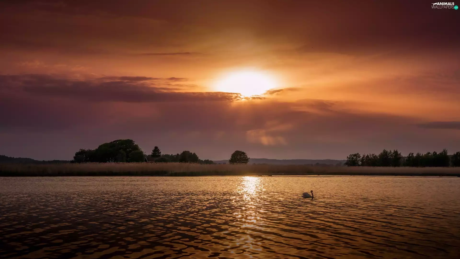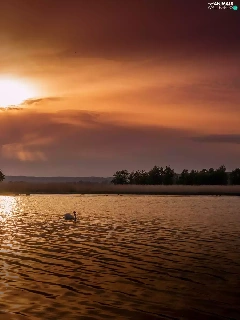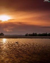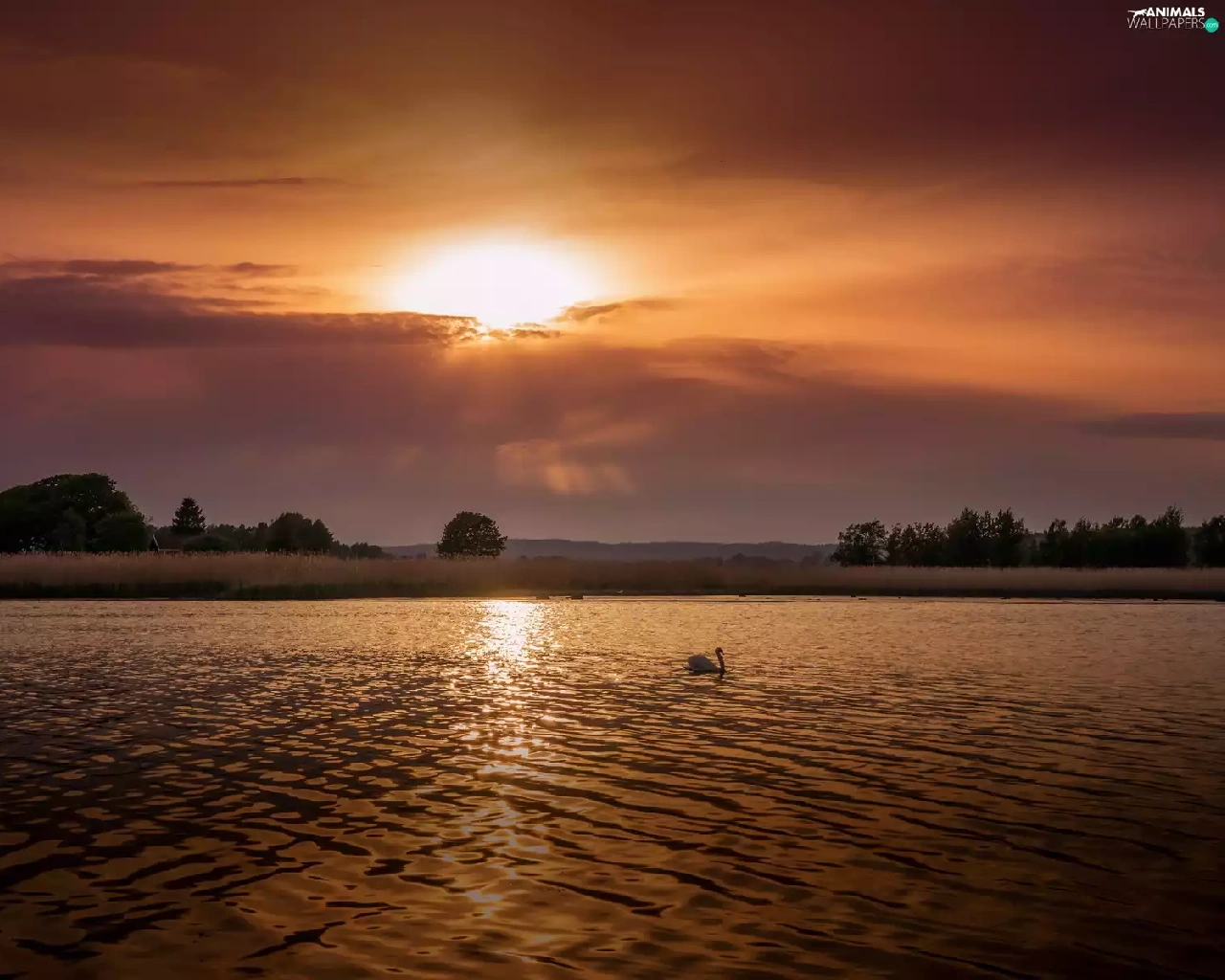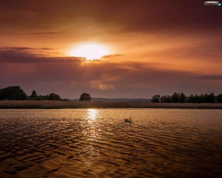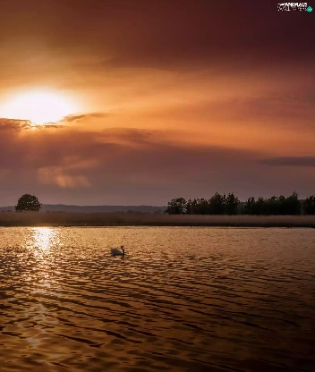Swans, lake, medows, trees, rays, sun, Mountains, clouds, viewes