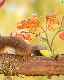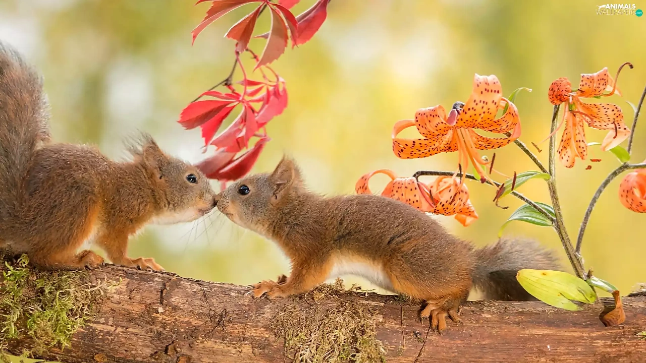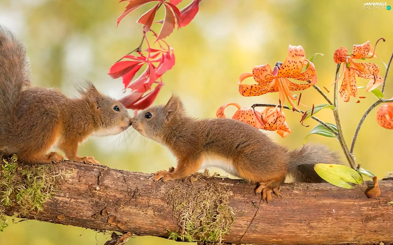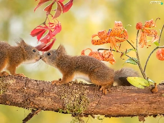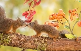 trees, viewes, kiss, Two, squirrels, branch, autumn, sweet