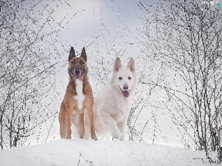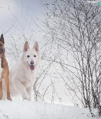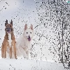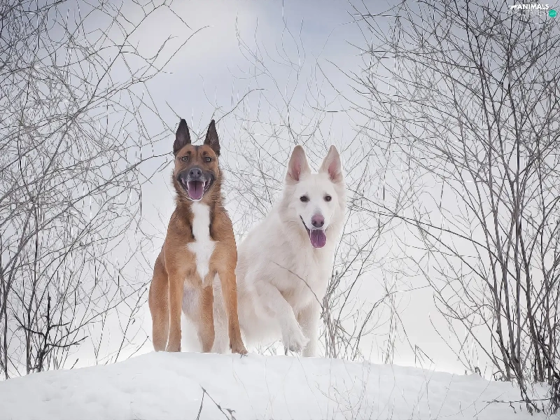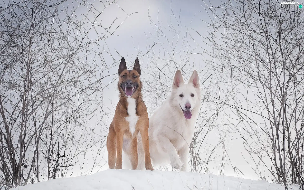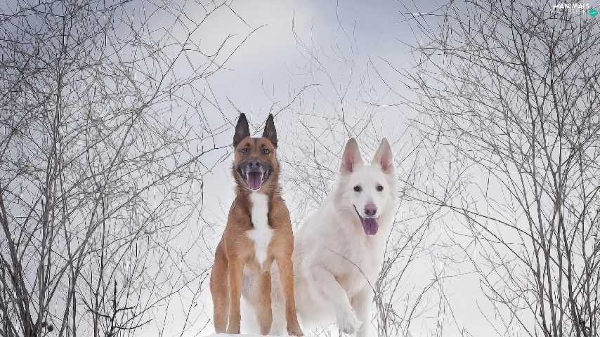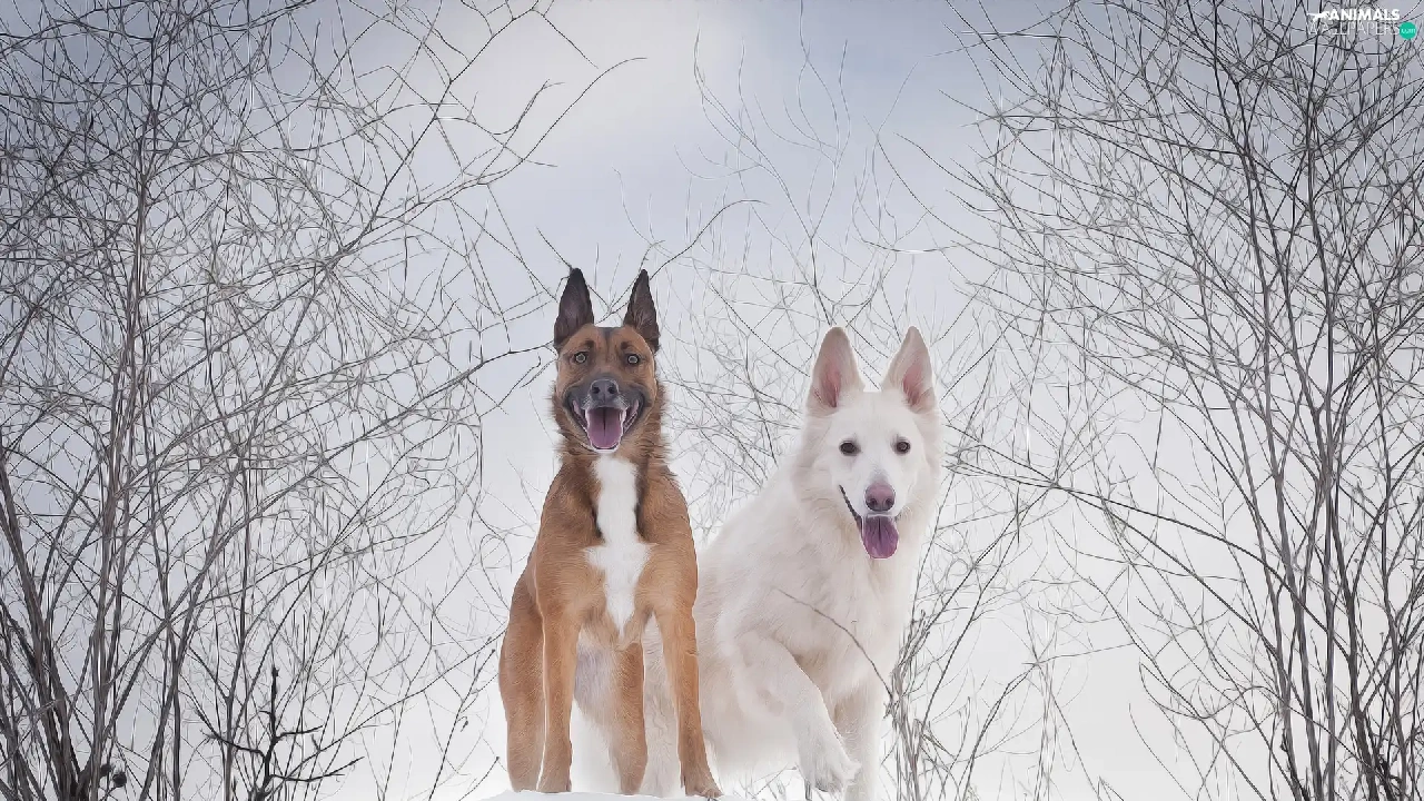 White Swiss Shepherd, graphics, Two cars, Dogs, winter