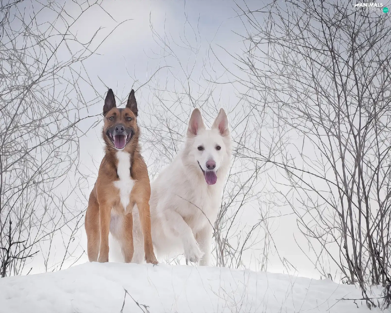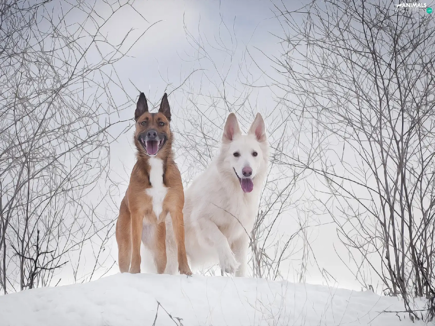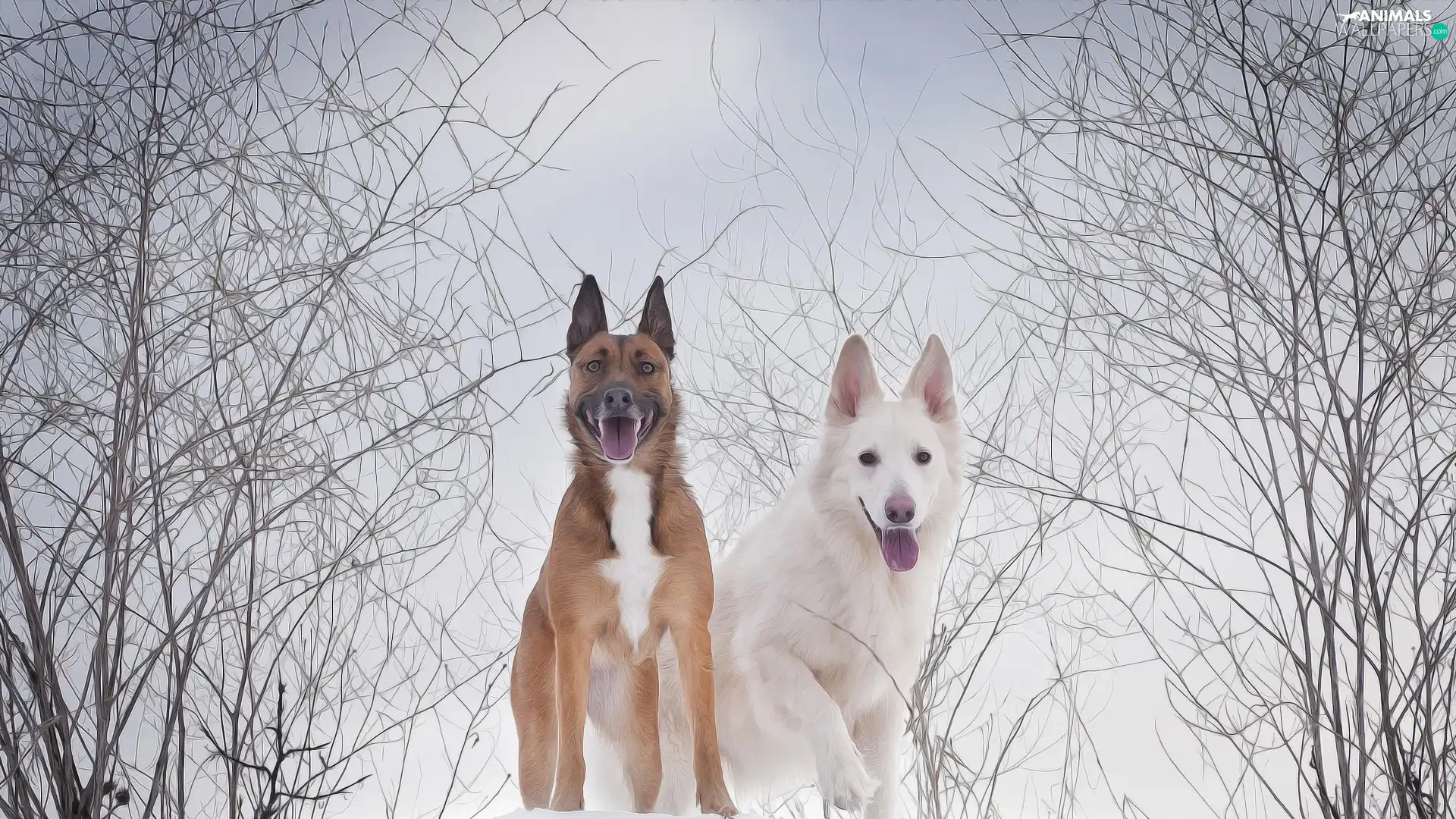 White Swiss Shepherd, graphics, Two cars, Dogs, winter