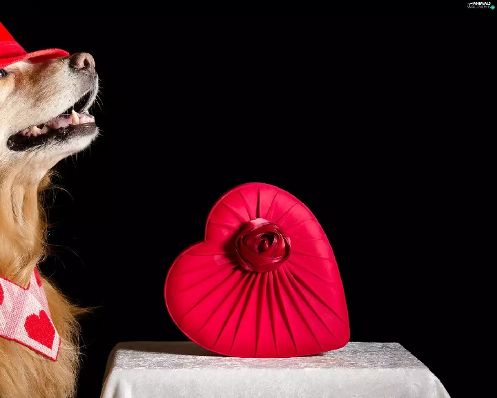 Hat, dog, Box, table, Heart, Golden Retriever