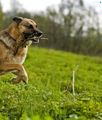 dog, stick, grass, Teeth