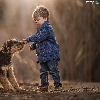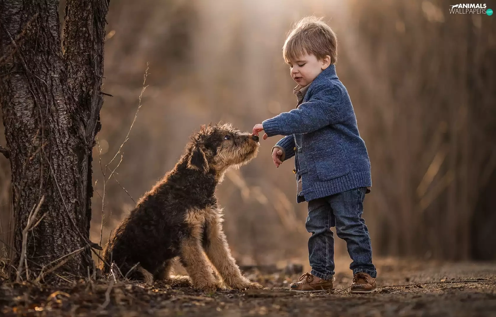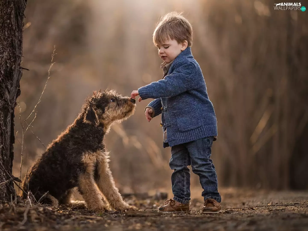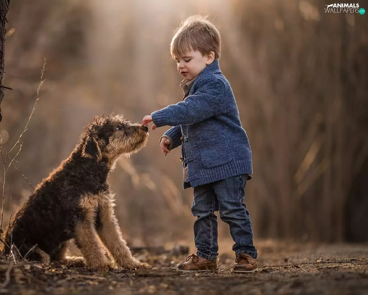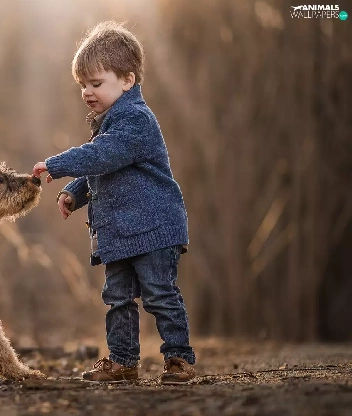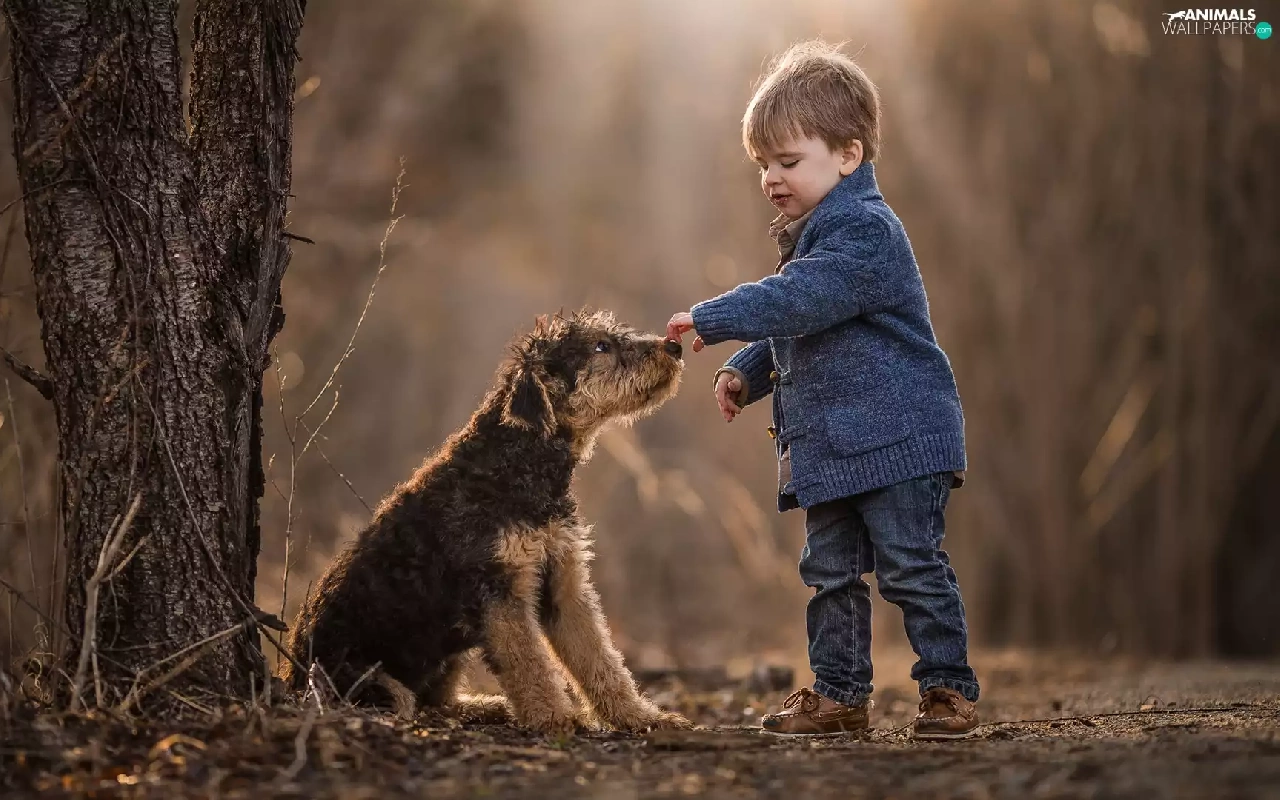 young, Terrier, boy, dog, trees