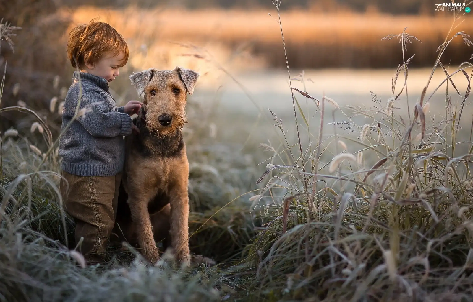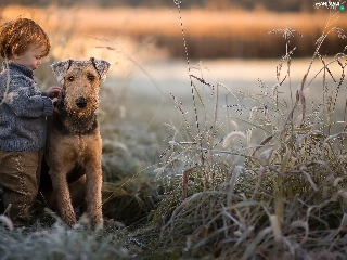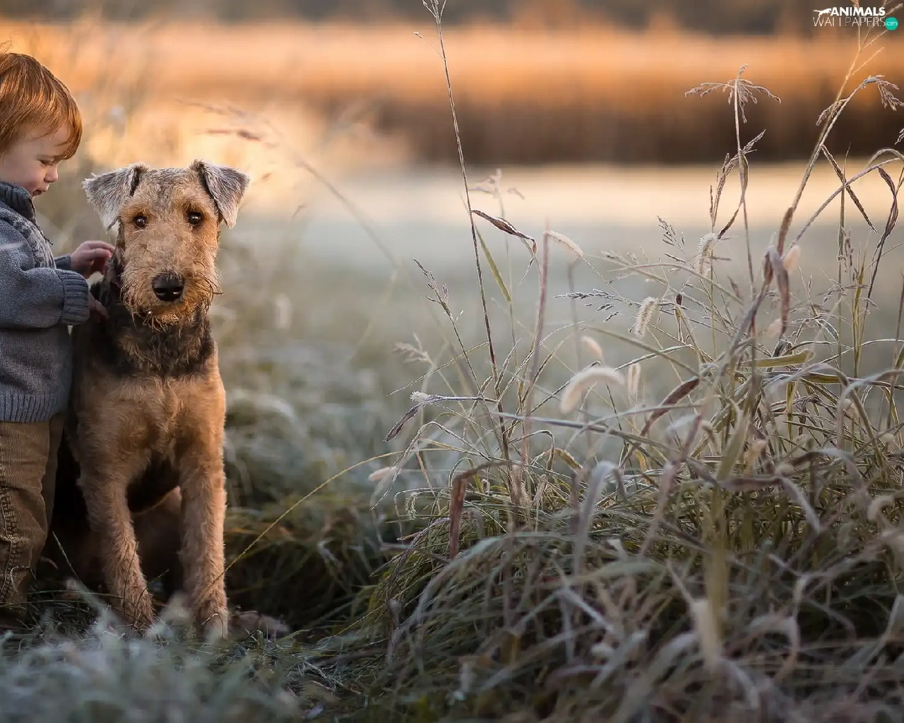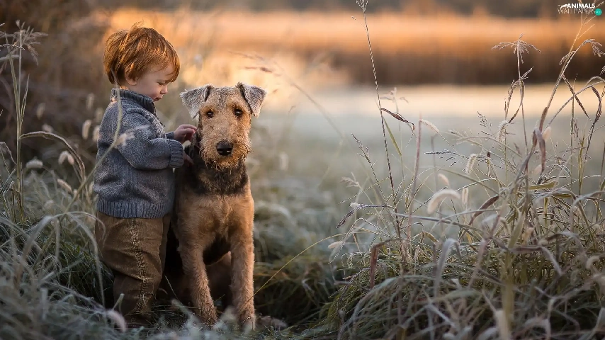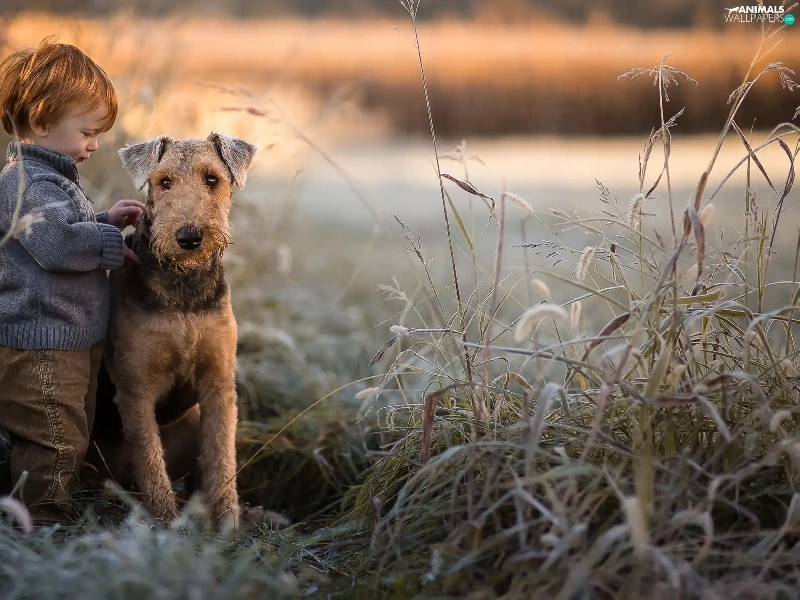 cane, grass, Airedale Terrier, boy, dog