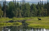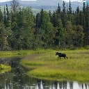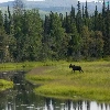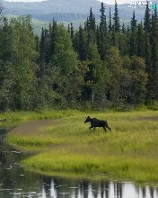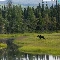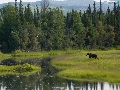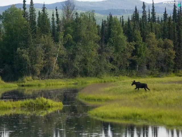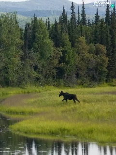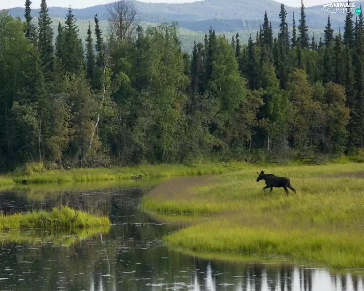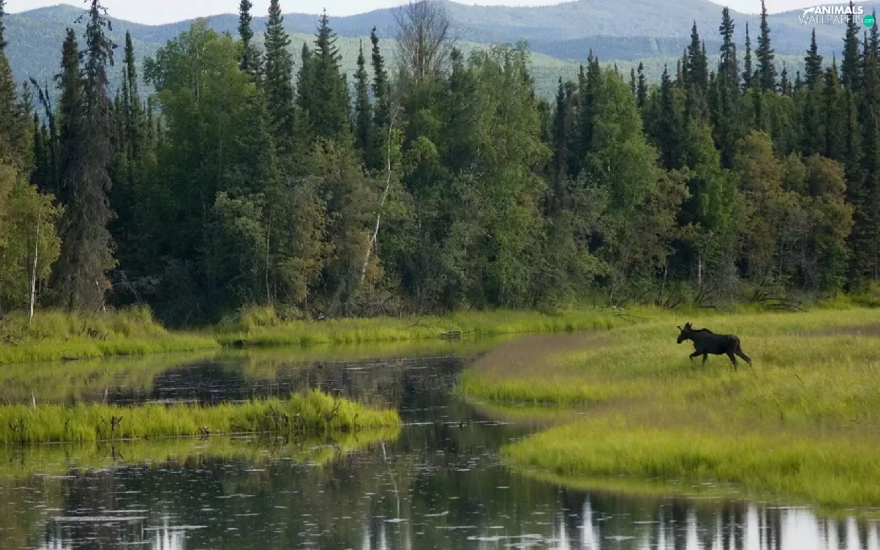 River, car in the meadow, moose, forest