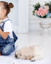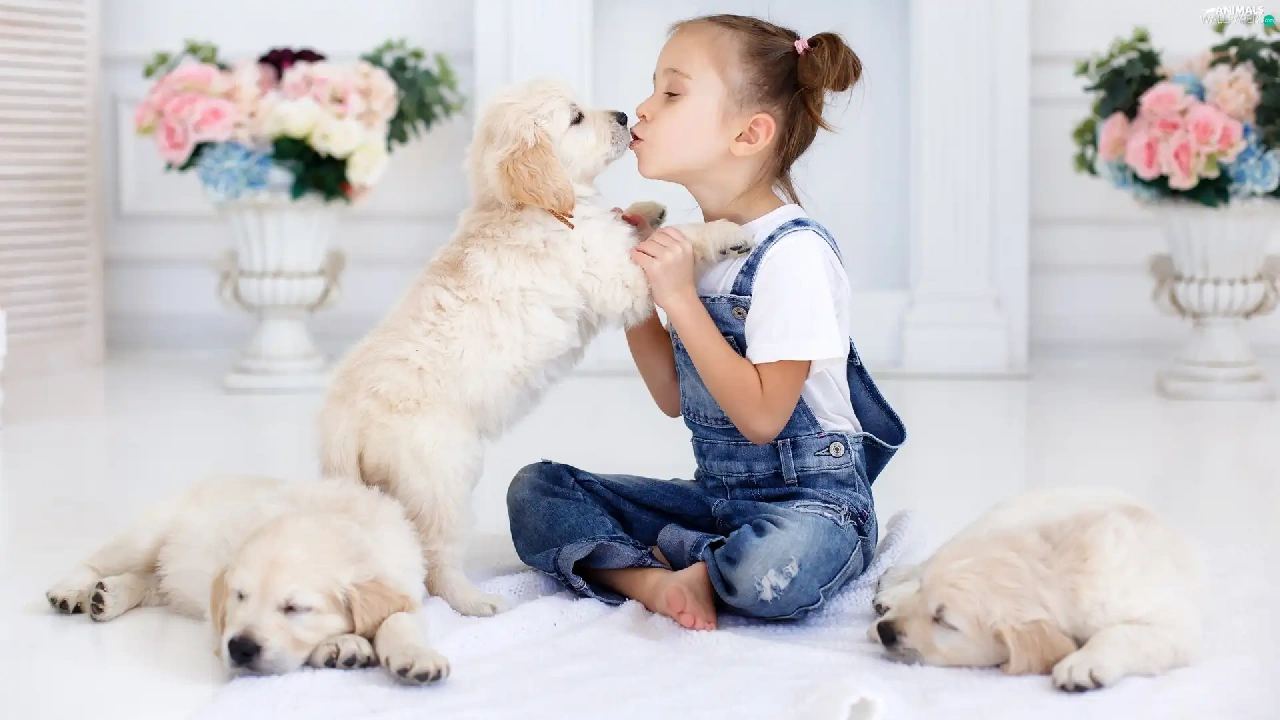 puppies, Golden Retrievery, Three, Dogs, girl